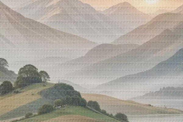 Attēls Rāma ainava ar ezeru, kas atspoguļo kalnus fonā ar nelielu laivu rāmā ūdenī Nr r40391