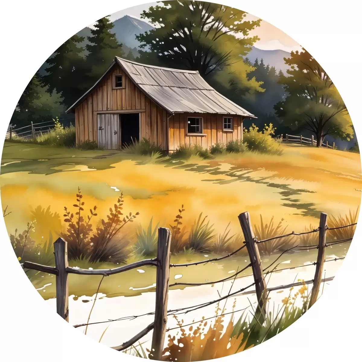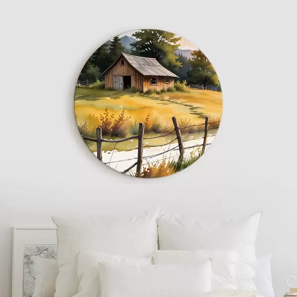Apaļas gleznas Veca koka māja lauku laukos, ko ieskauj zālains lauks, priedes un kalni r40394