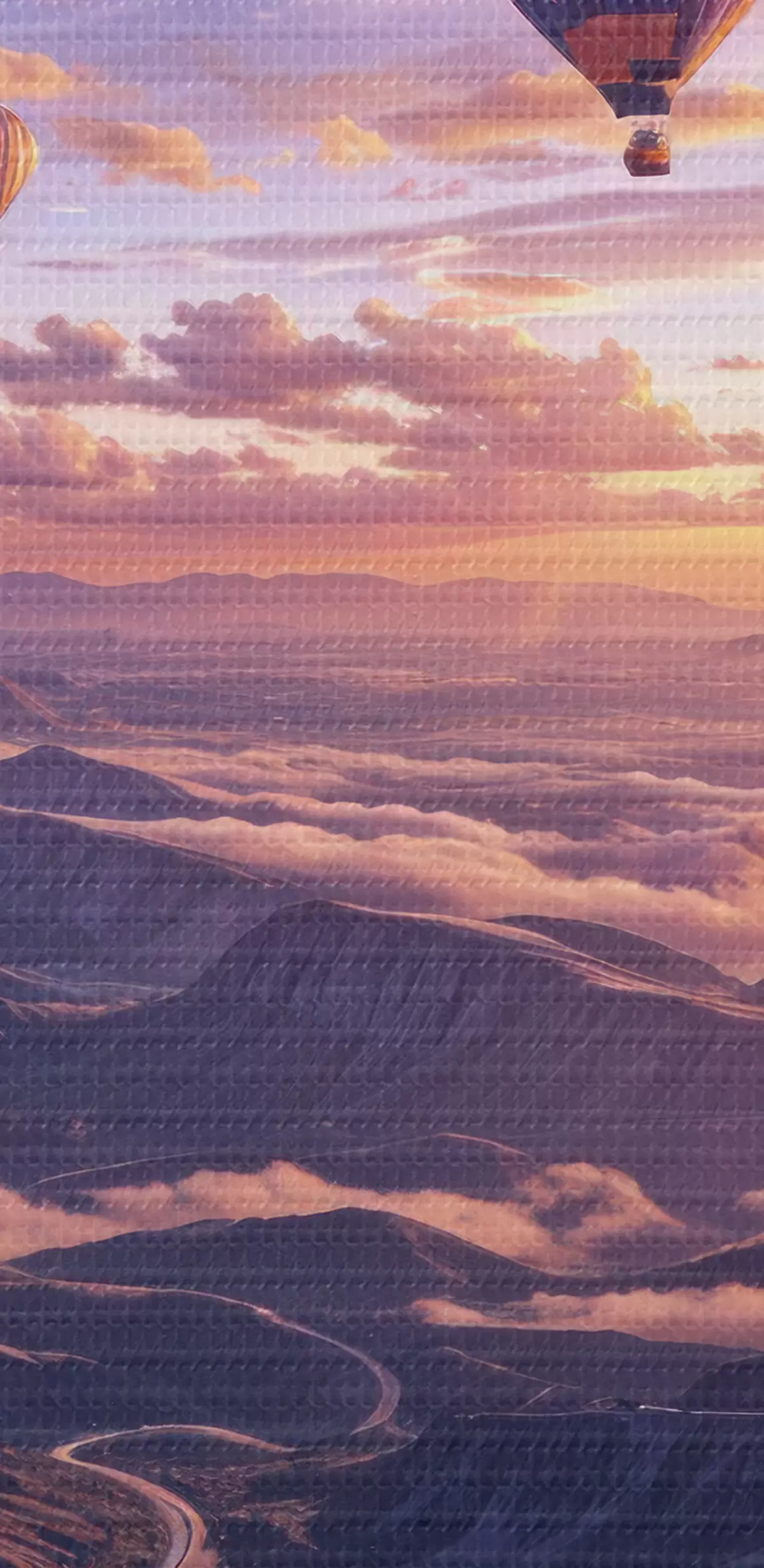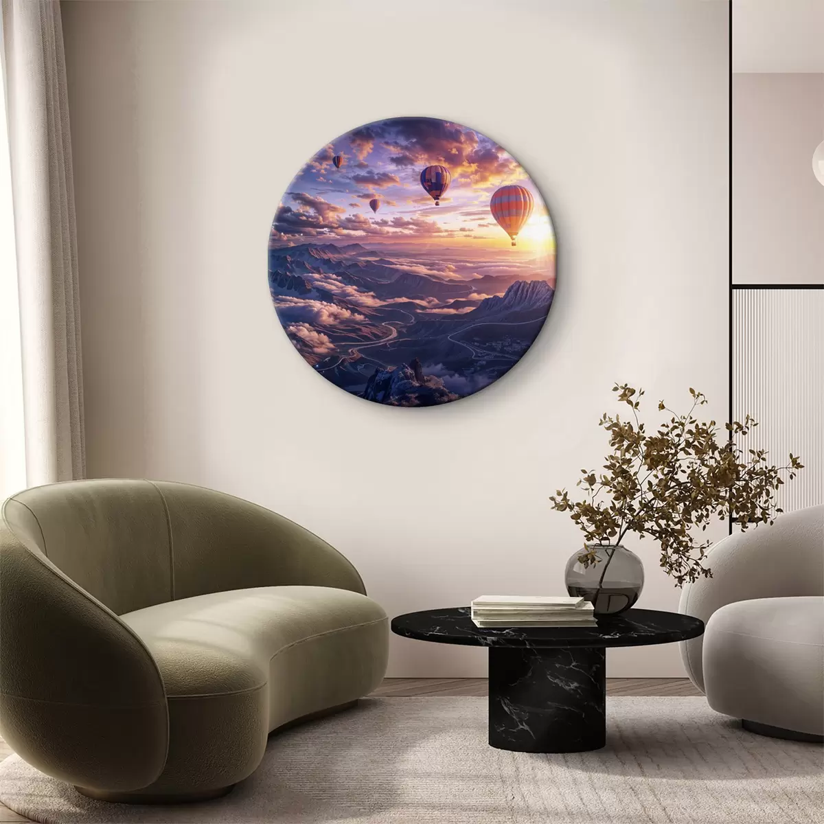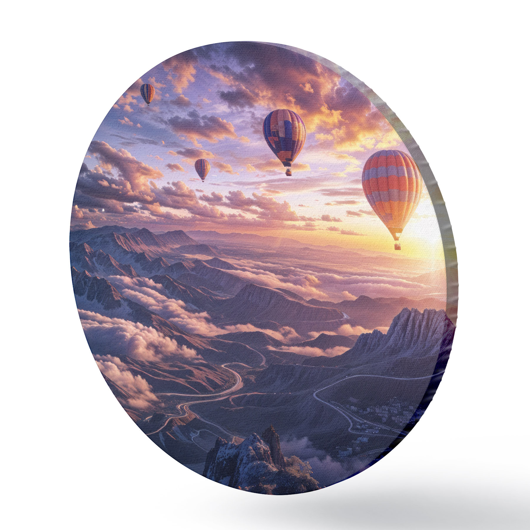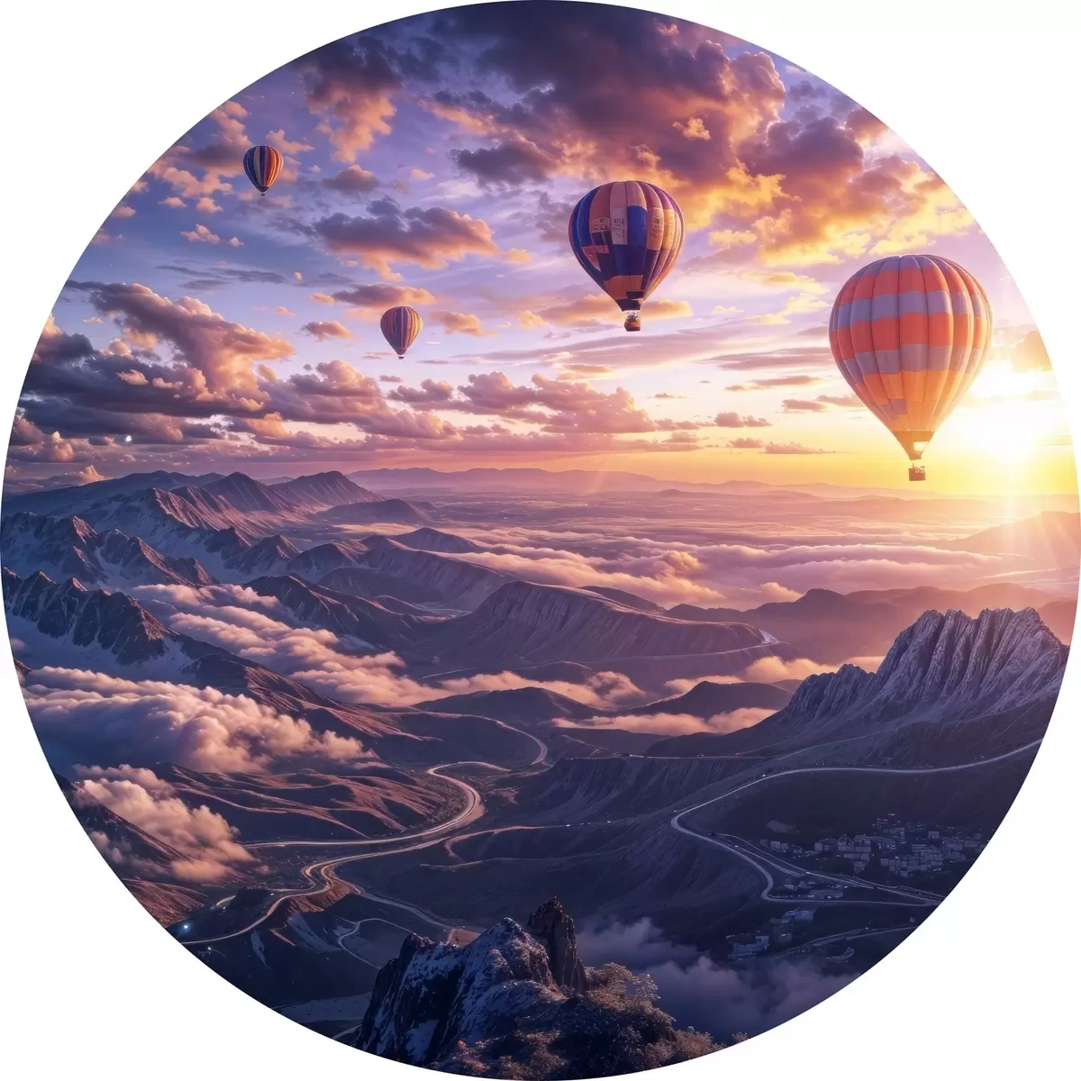 Apaļas gleznas Gaisa baloni, kas peld virs kalnainas ainavas saulrietā, ar mākoņiem un košām krāsām debesīs r40397