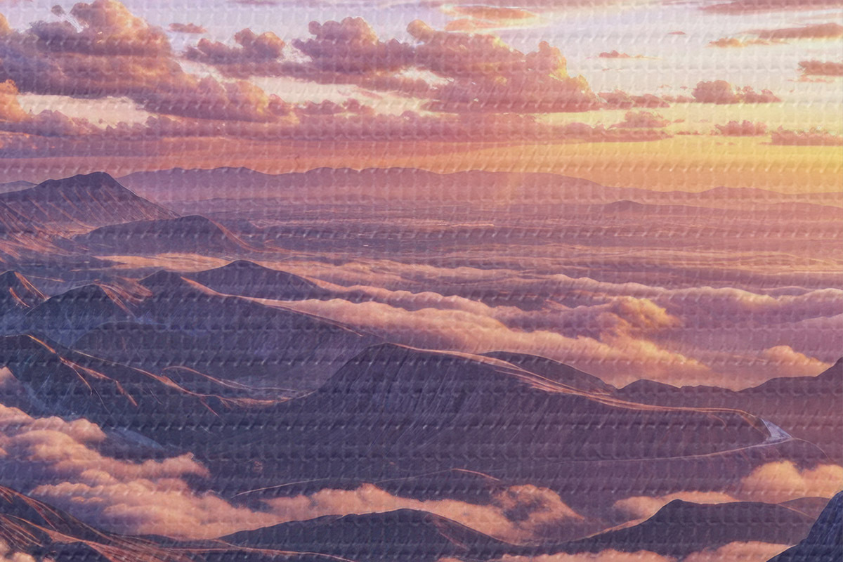 Attēls Gaisa baloni, kas peld virs kalnainas ainavas saulrietā, ar mākoņiem un košām krāsām debesīs Nr r40397