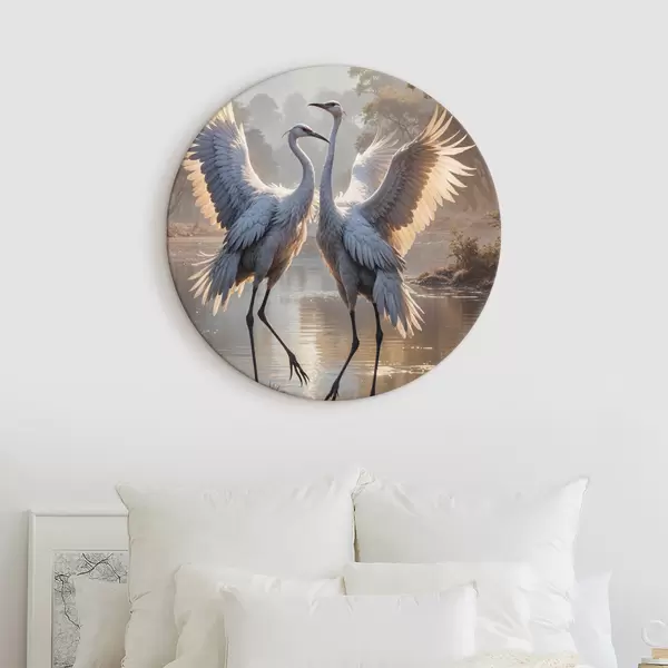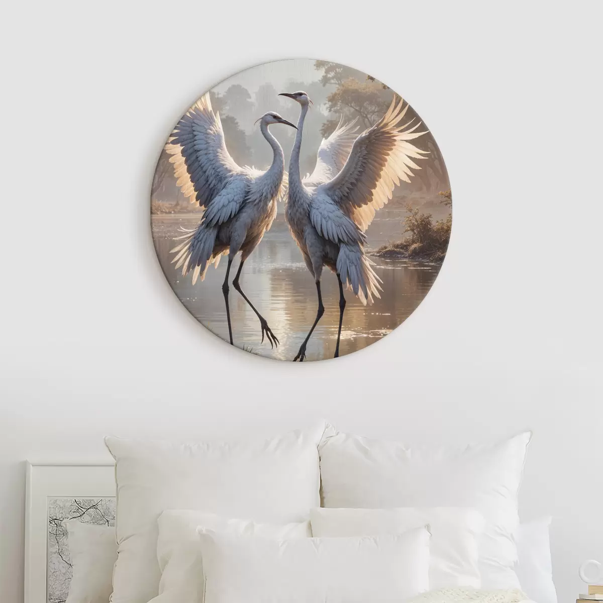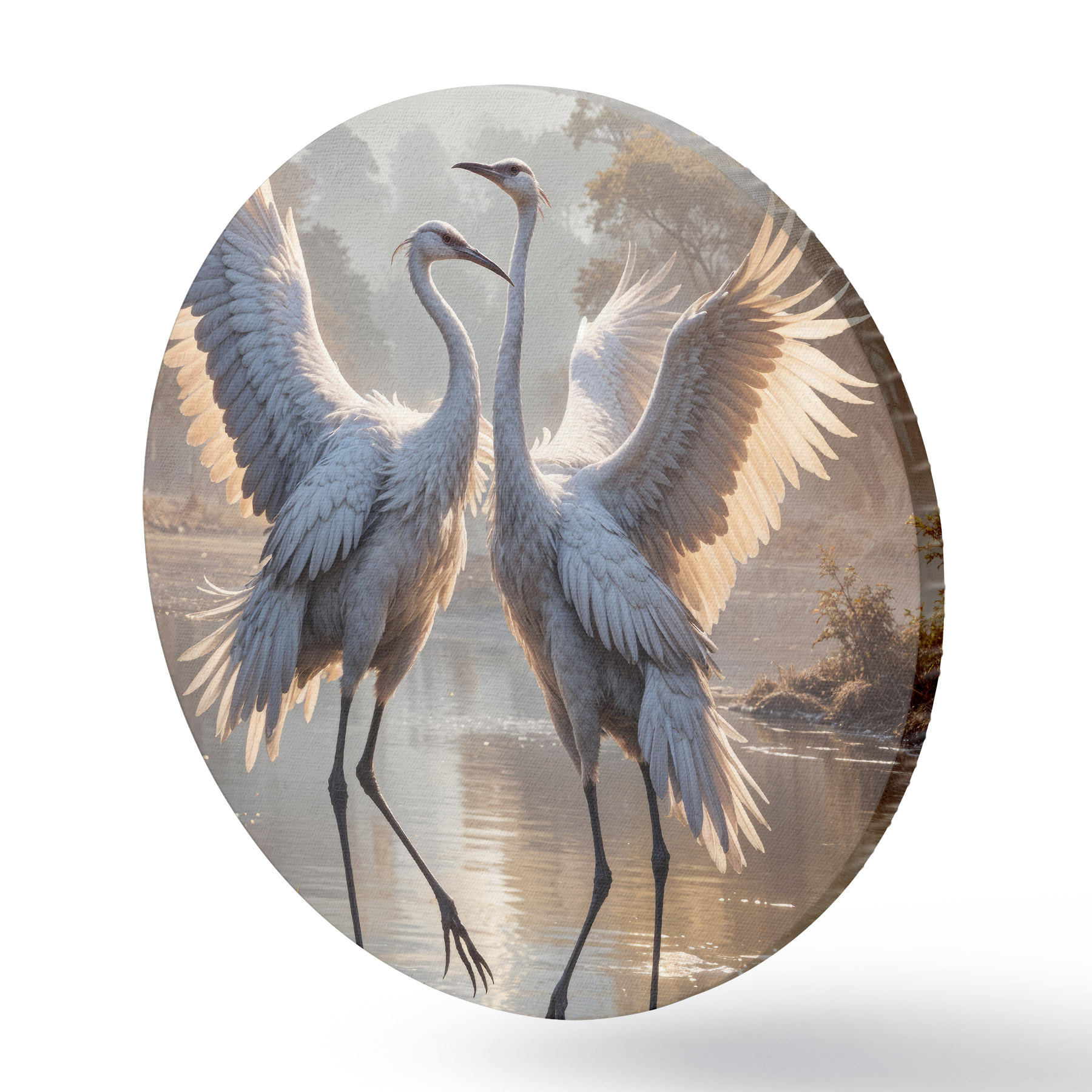 Apaļas gleznas Divas lielas pelēkas dzērves ar gariem kakliem un izplestiem spārniem stāv miglainā ezerā, ko ieskauj koki r40404