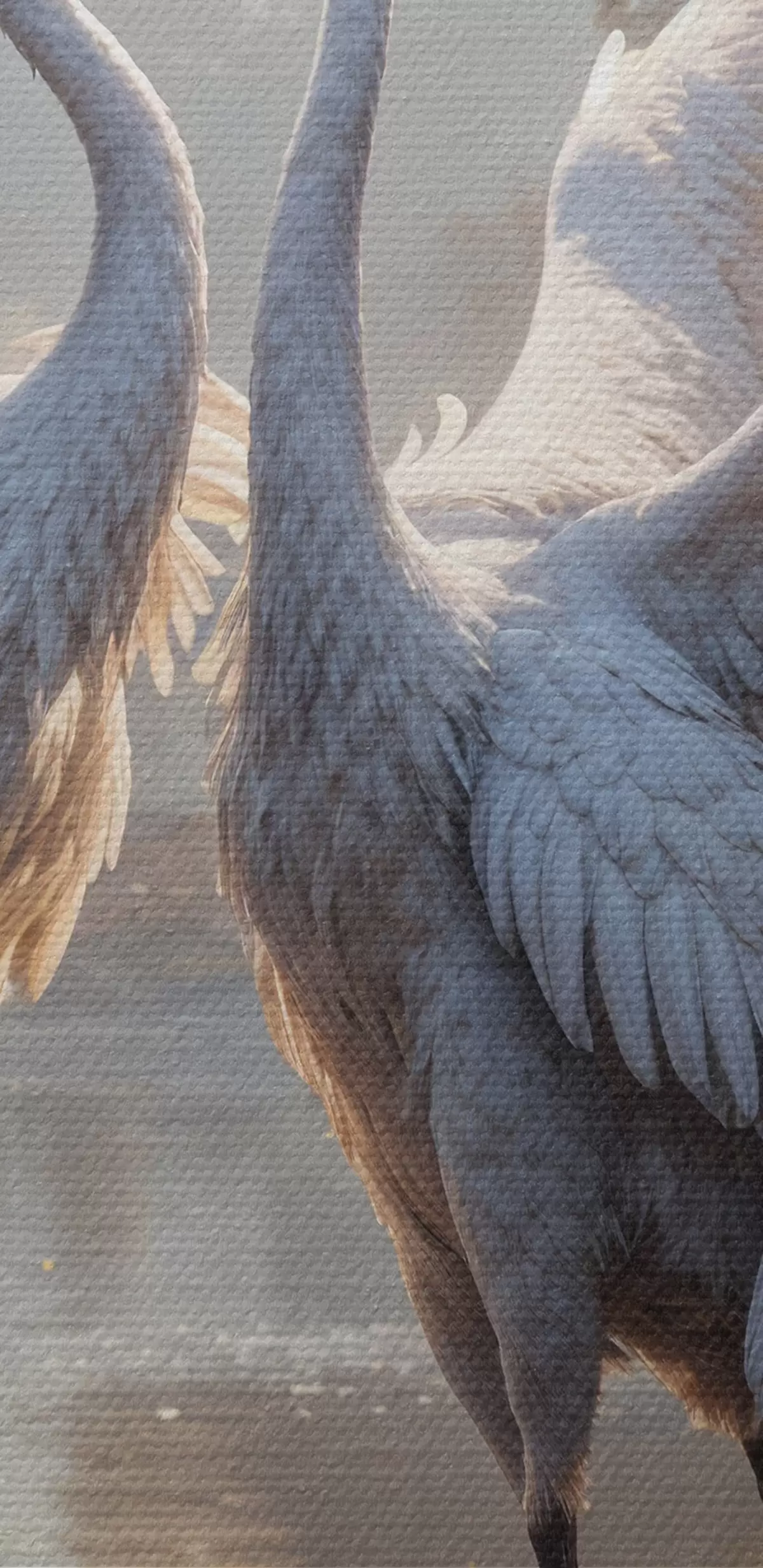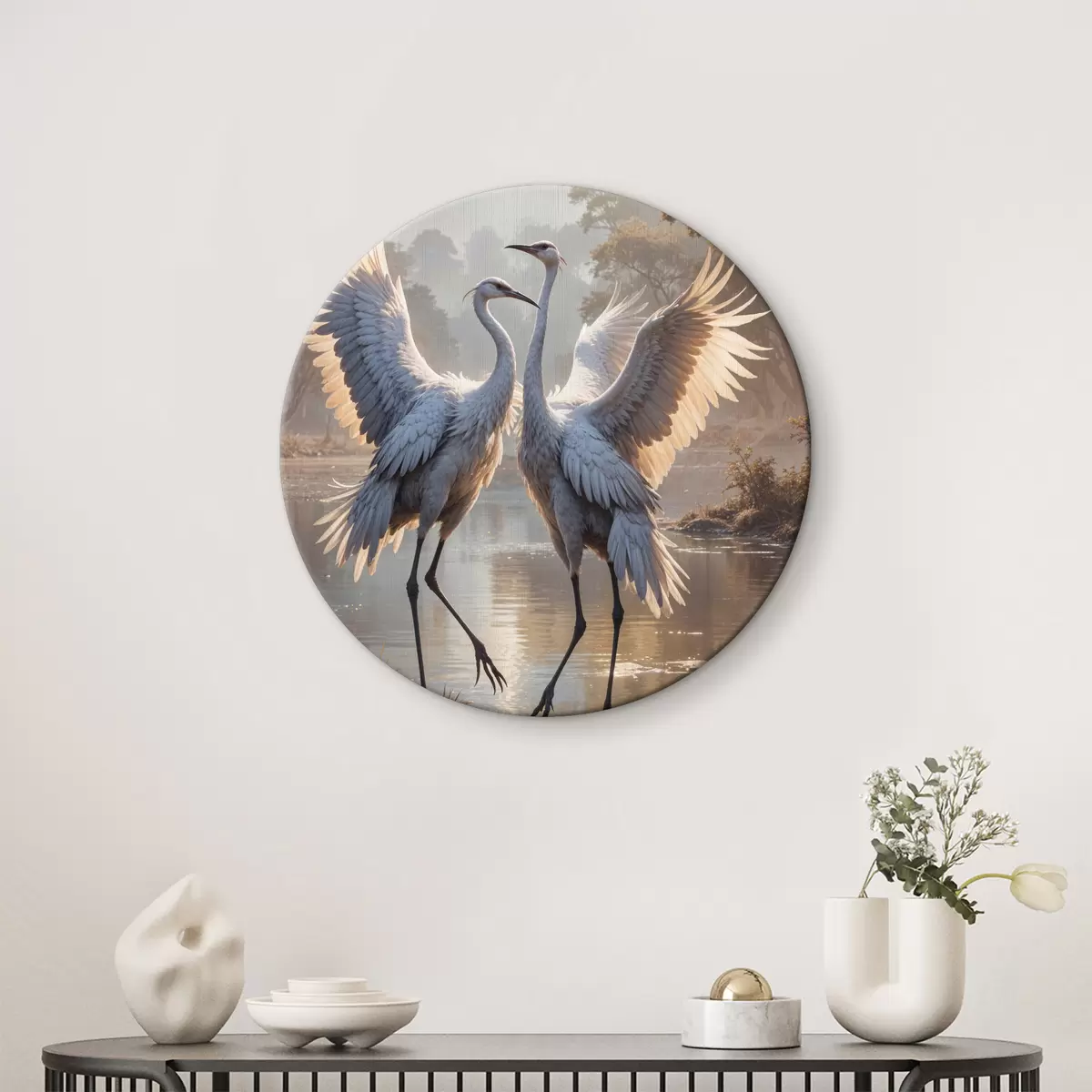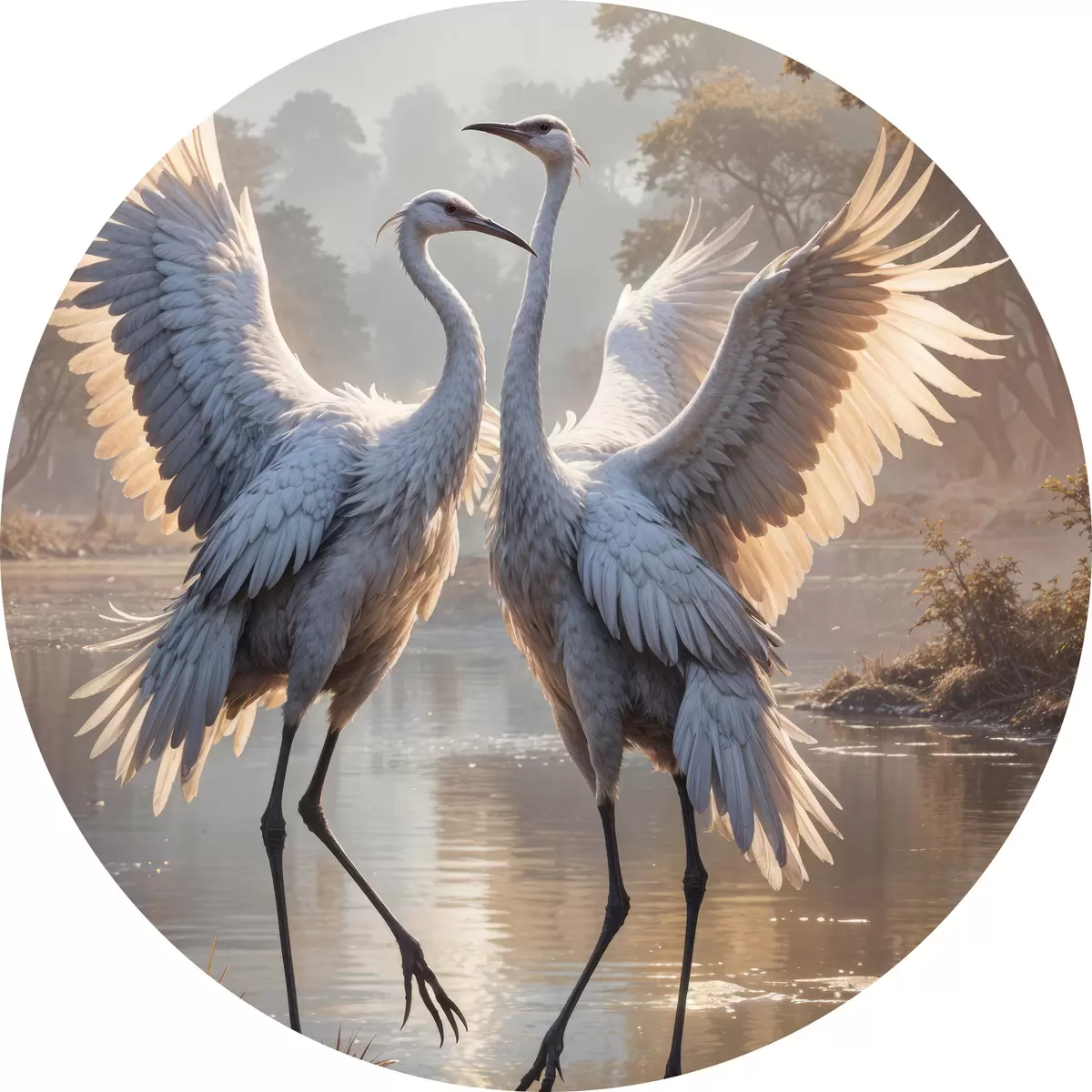 Apaļas gleznas Divas lielas pelēkas dzērves ar gariem kakliem un izplestiem spārniem stāv miglainā ezerā, ko ieskauj koki r40404