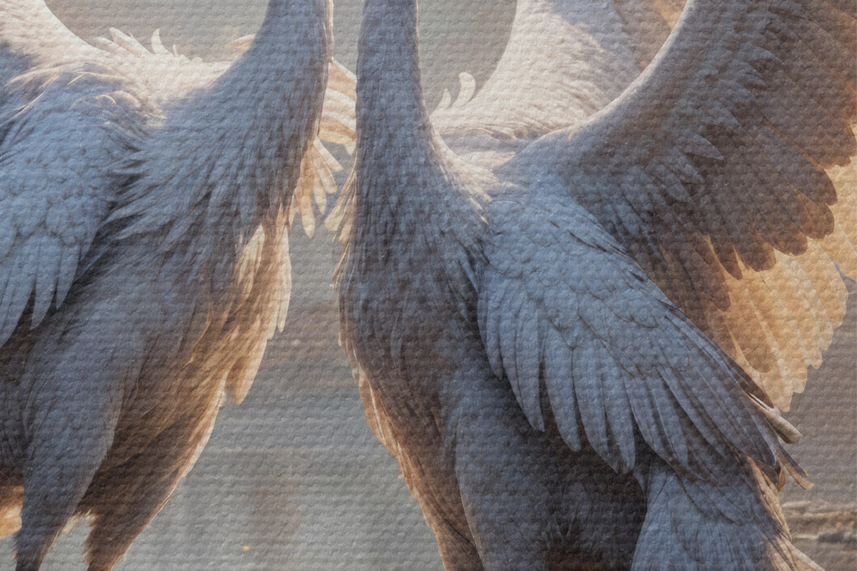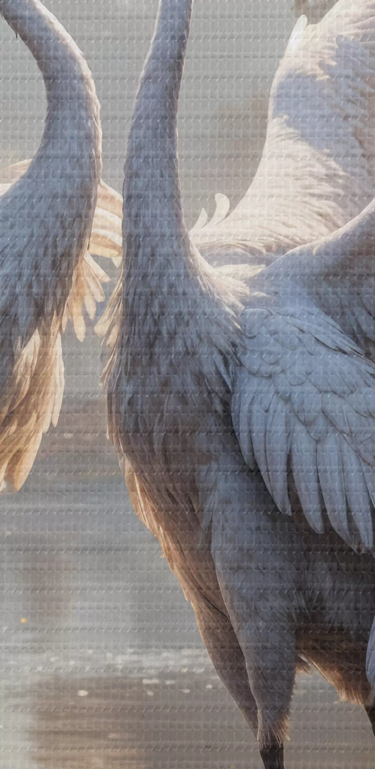 Attēls Divas lielas pelēkas dzērves ar gariem kakliem un izplestiem spārniem stāv miglainā ezerā, ko ieskauj koki Nr r40404