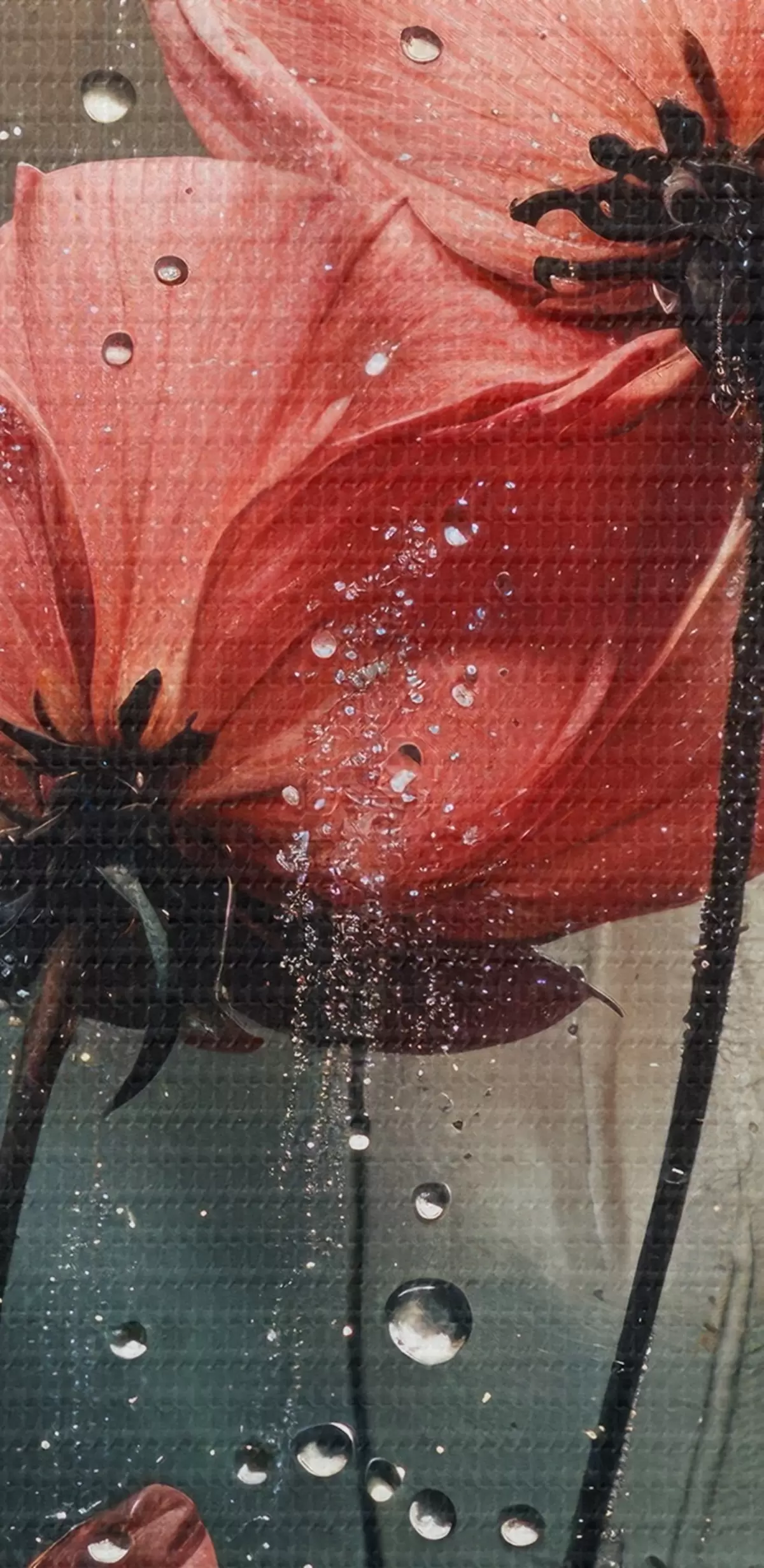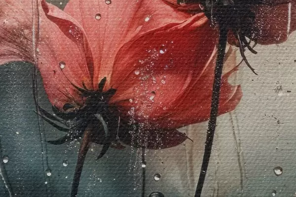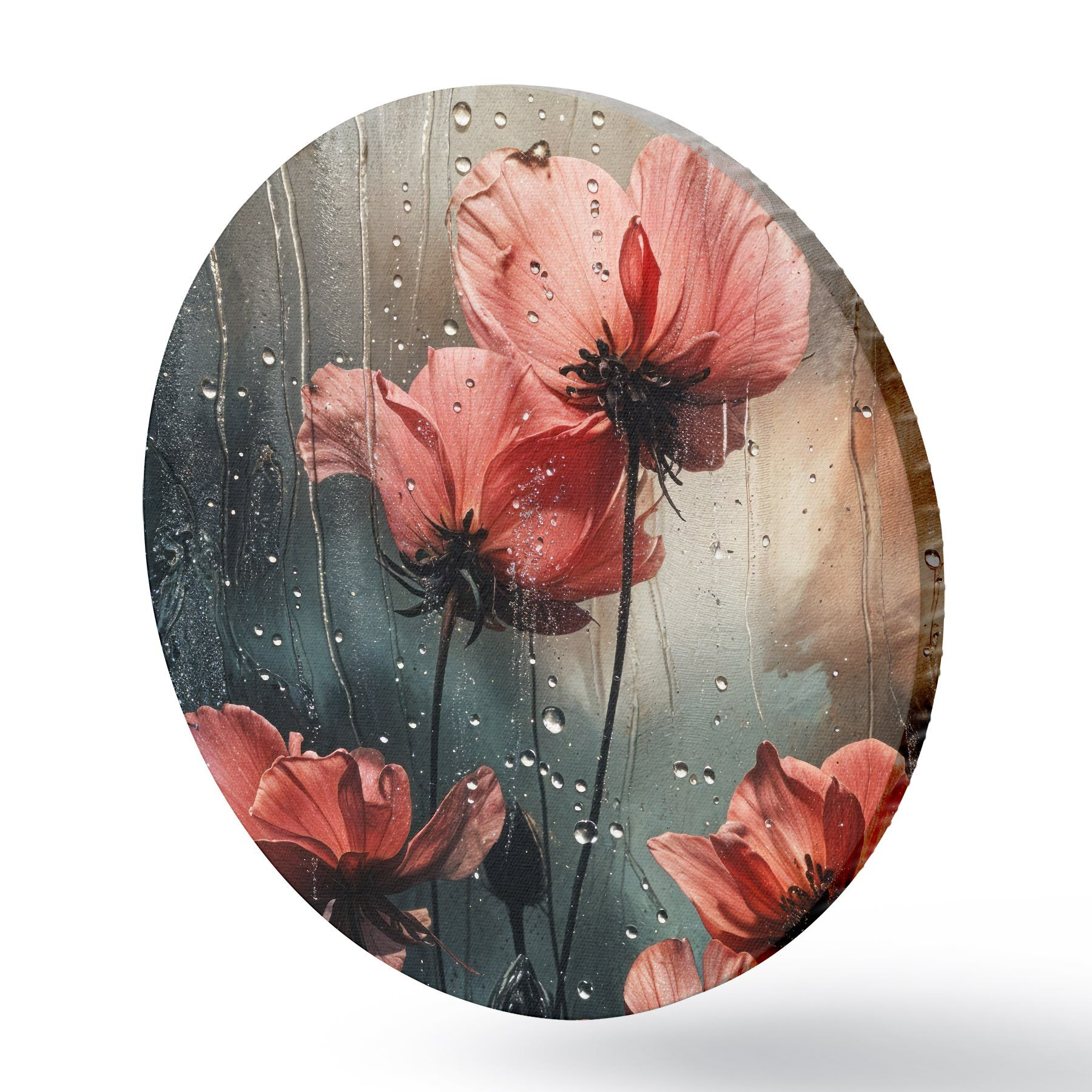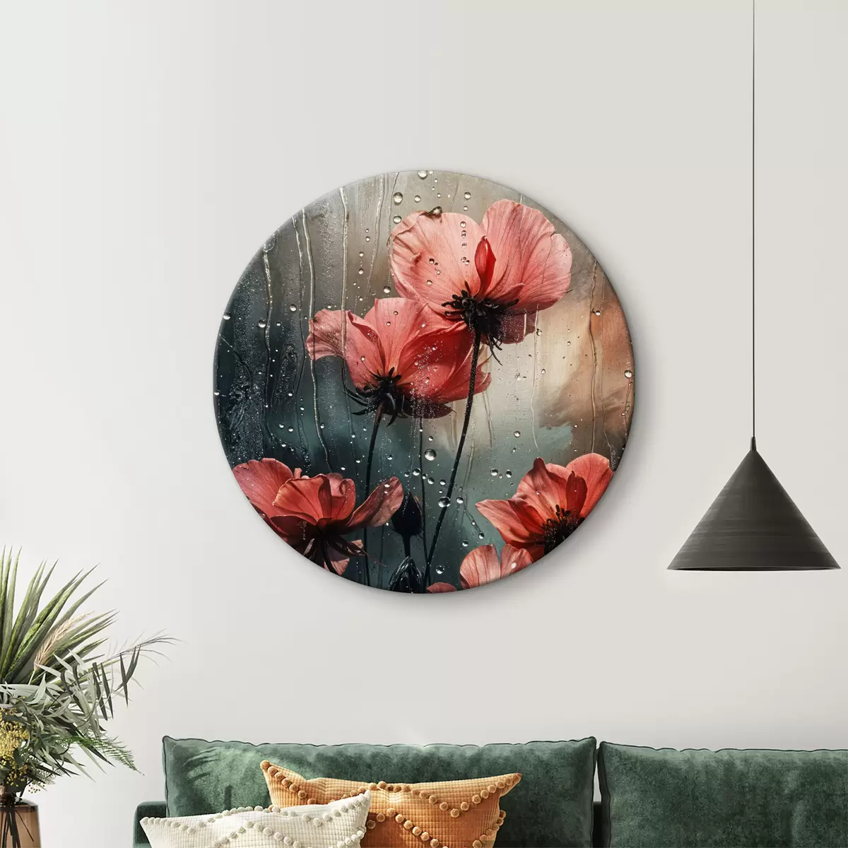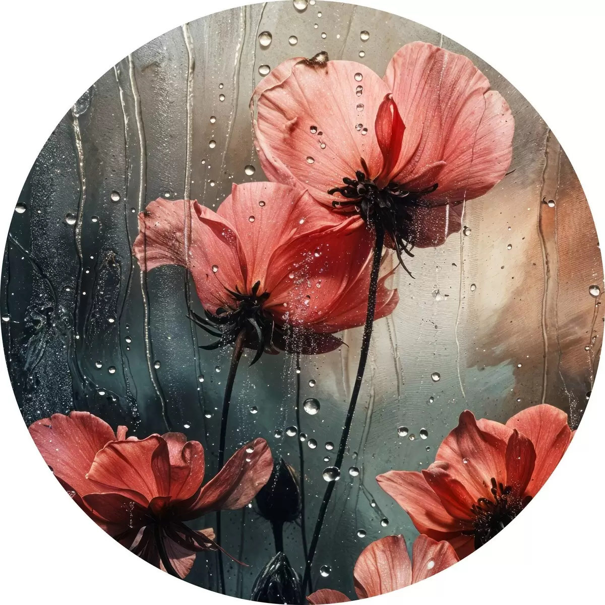 Apaļas gleznas Sarkani ziedi ar ūdens pilieniem uz neskaidra fona r40412