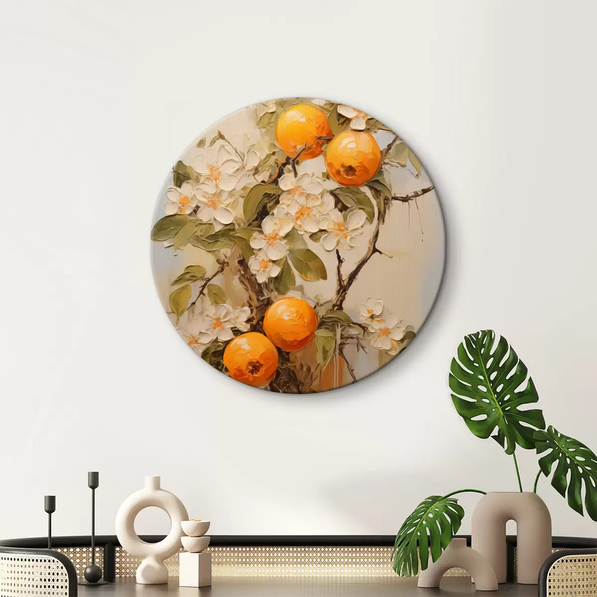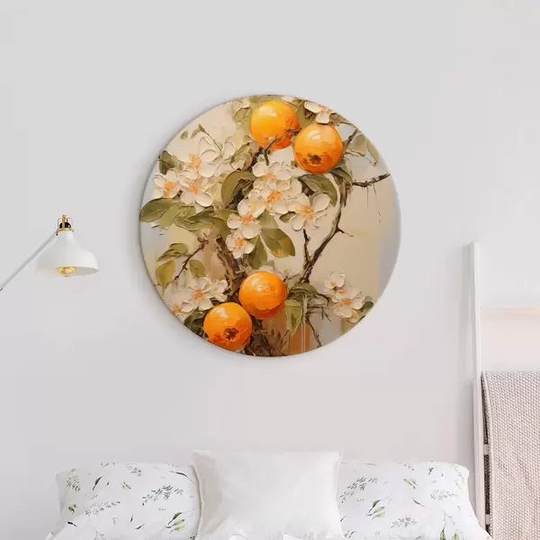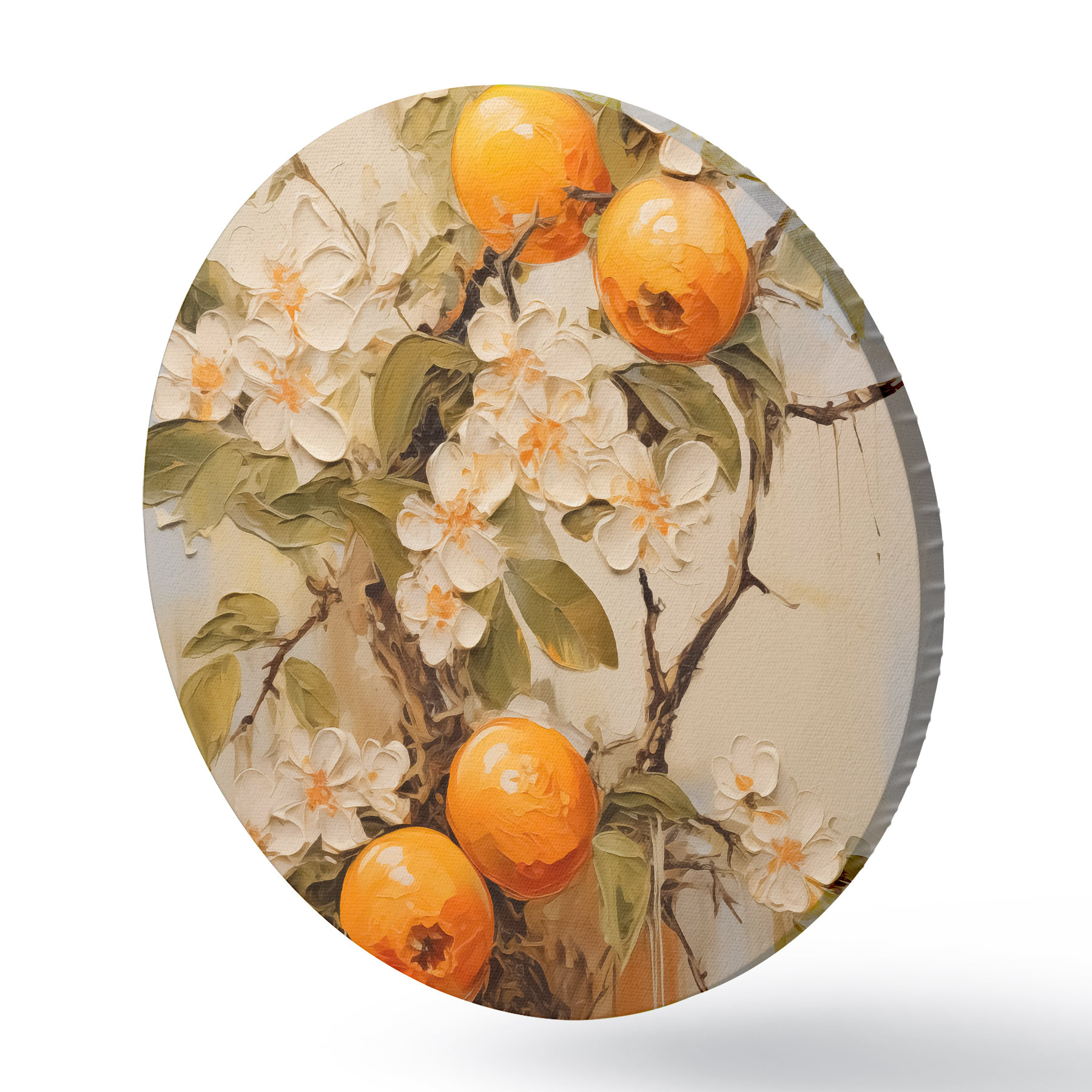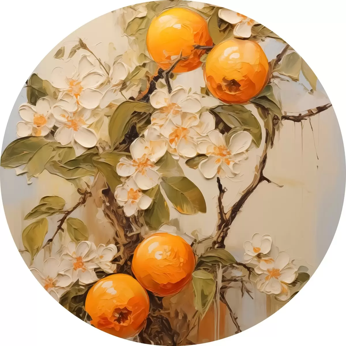 Apaļas gleznas Zars ar baltiem ziediem un apelsīniem uz pelēki bēša fona r40486