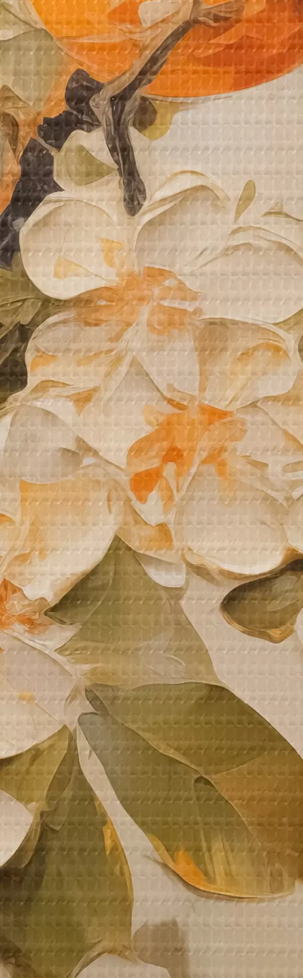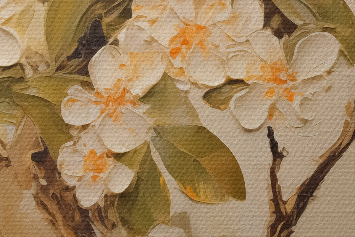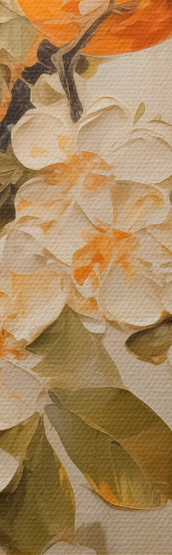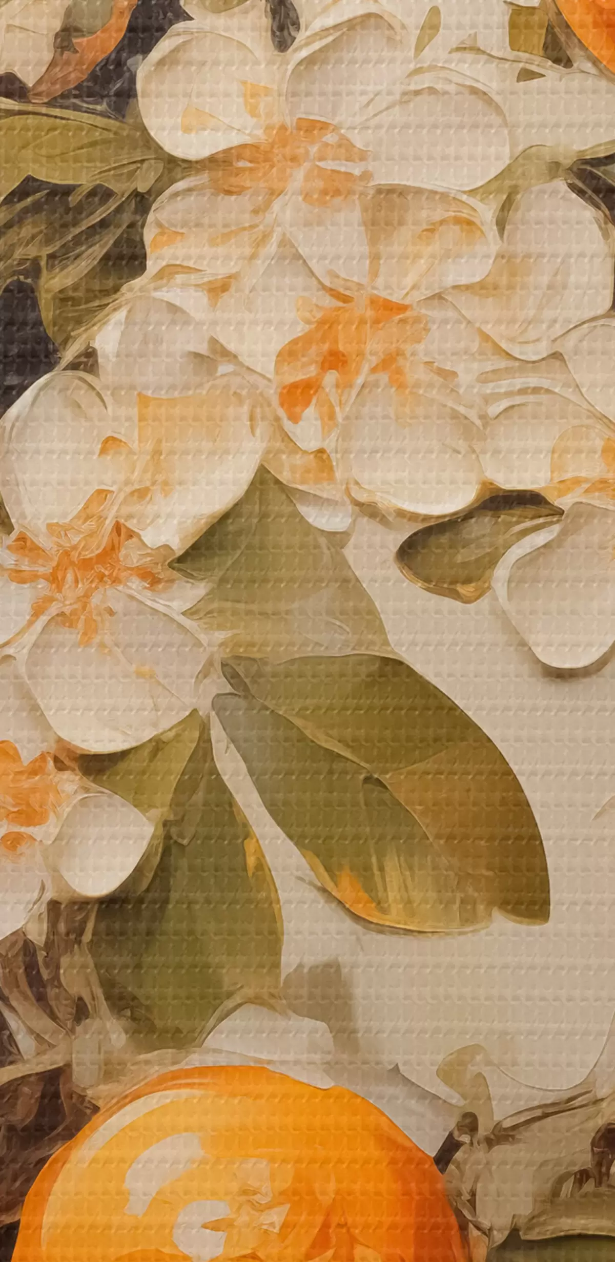 Attēls Zars ar baltiem ziediem un apelsīniem uz pelēki bēša fona Nr r40486