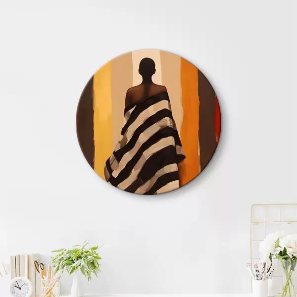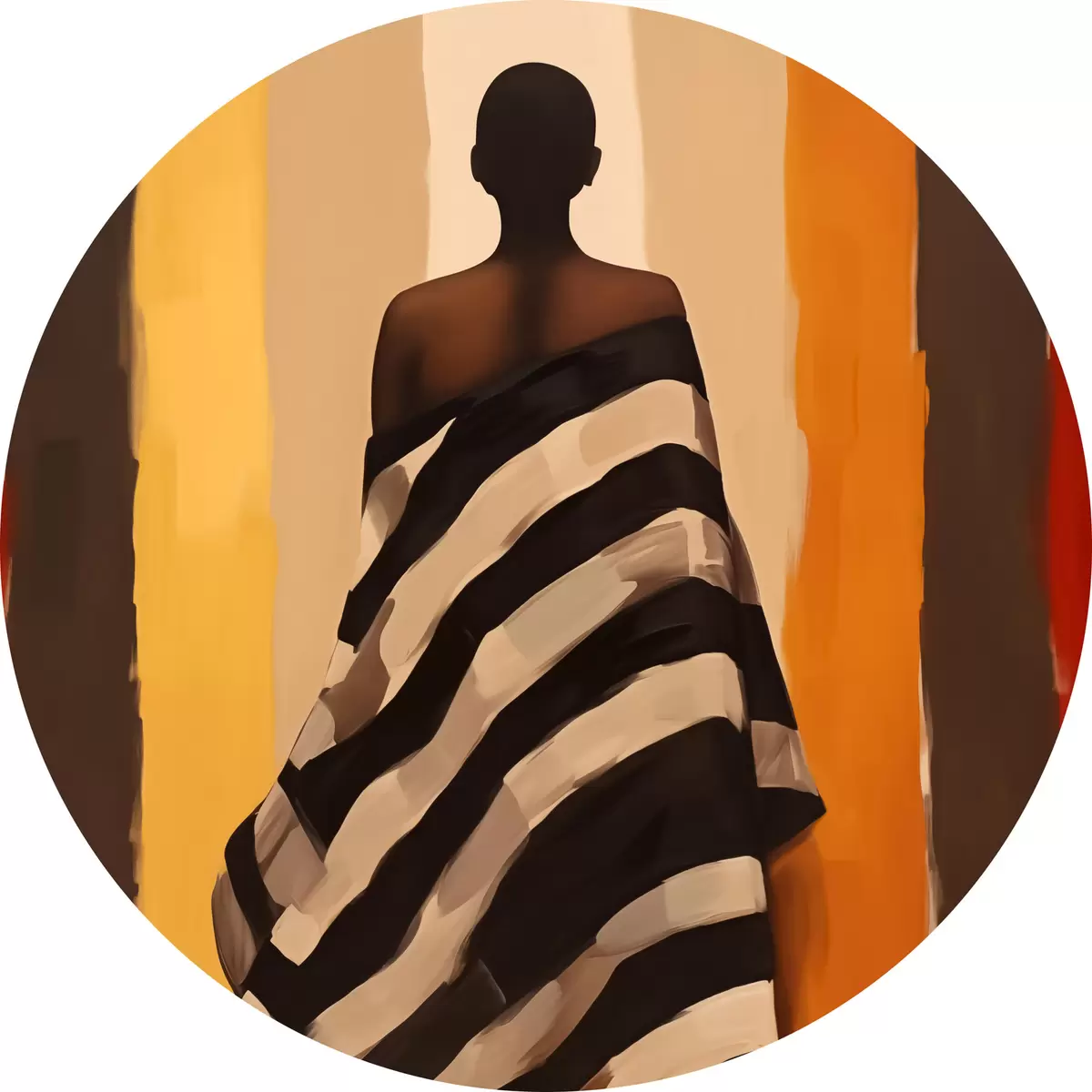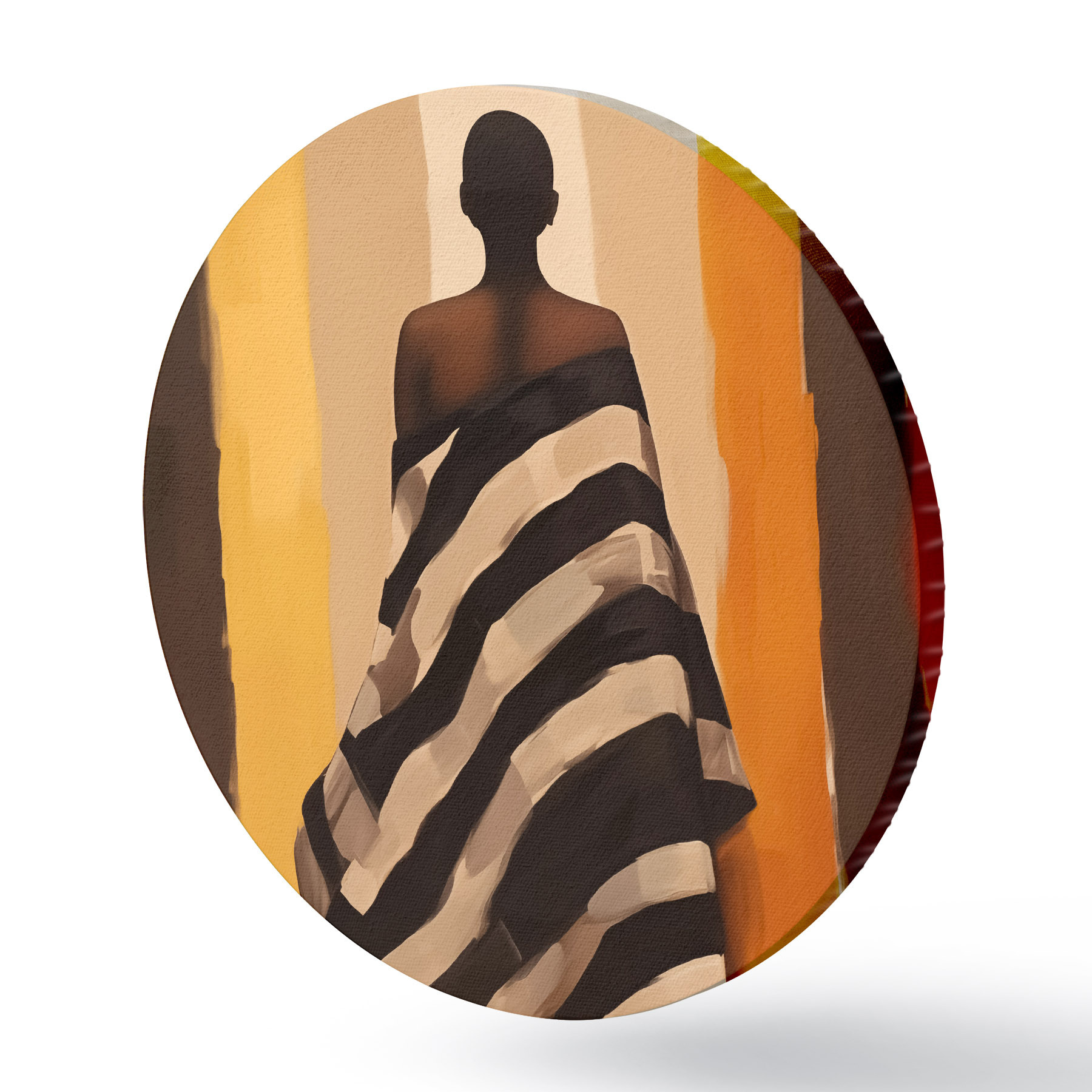 Apaļas gleznas Afroamerikāņu sievietes siluets svītrainā apmetnī uz fona ar vertikālām svītrām, melns, bēšs, dzeltens, sarkans, brūns r40487