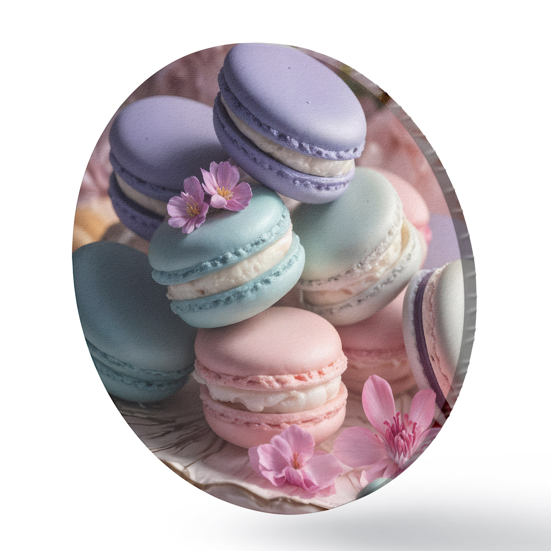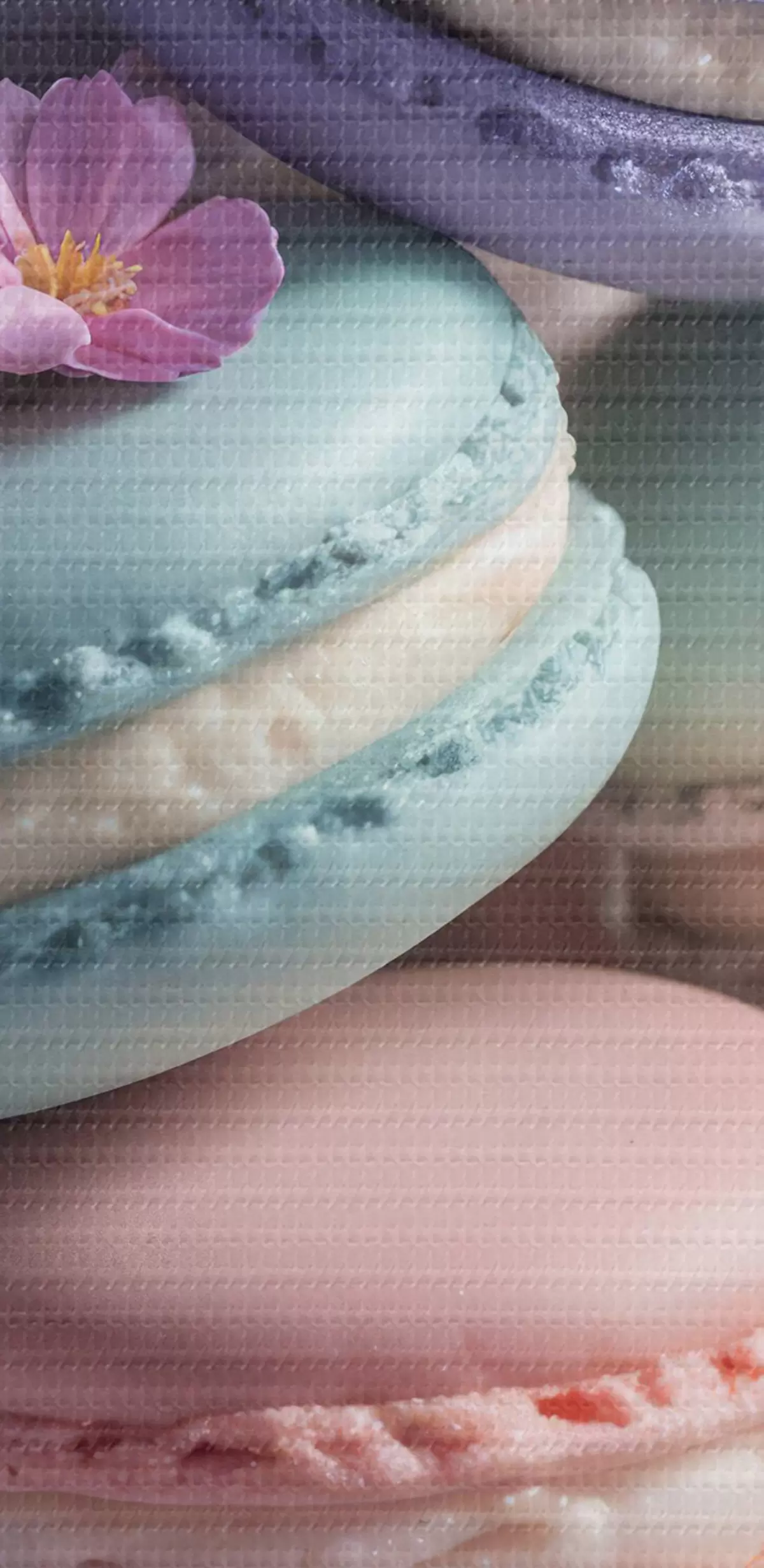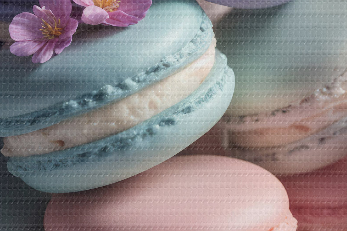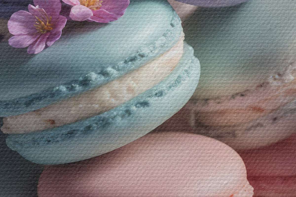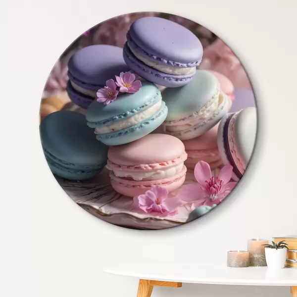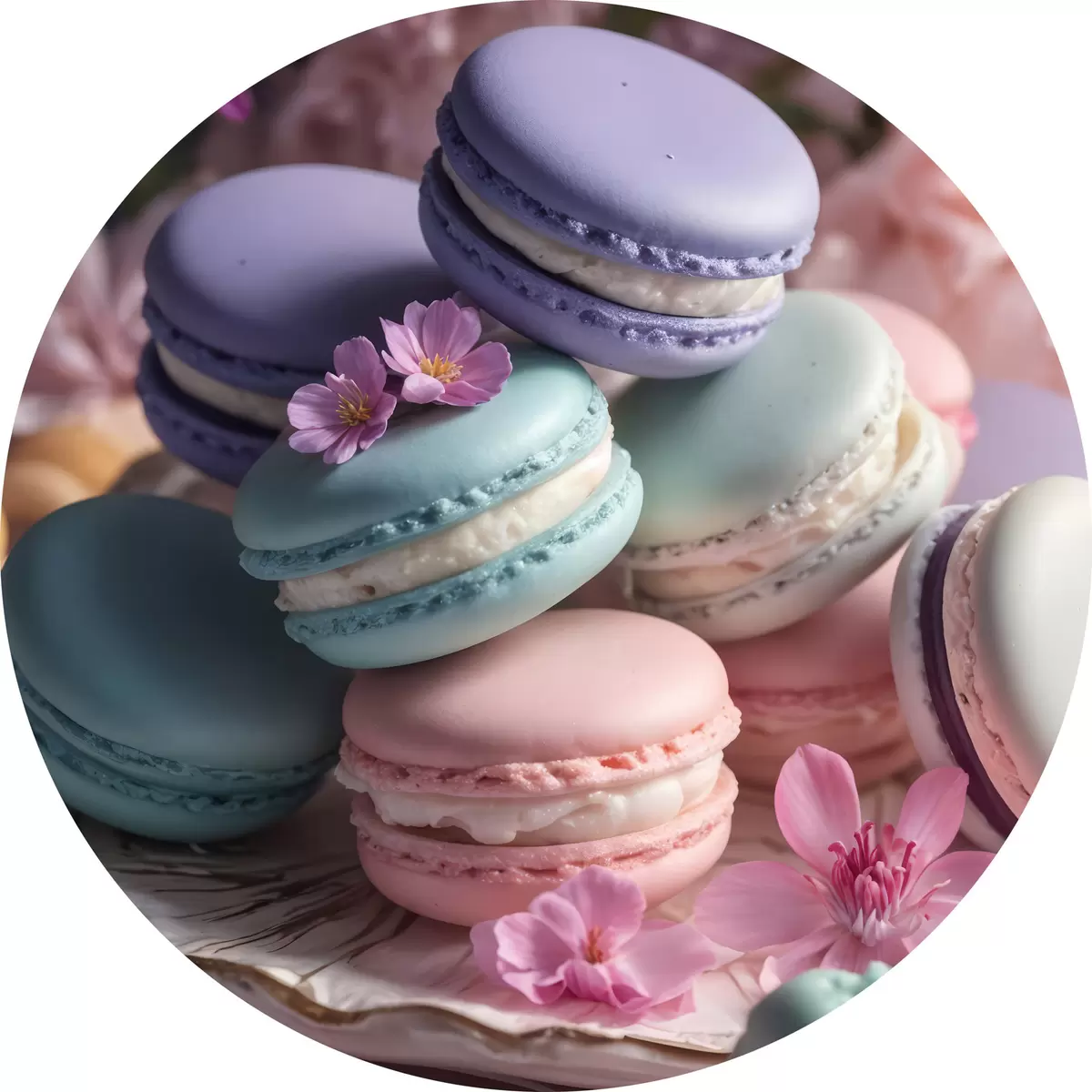 Attēls Krāsaini makaroni ar rozā un violetiem ziediem uz šķīvja, tuvplānā Nr r40546