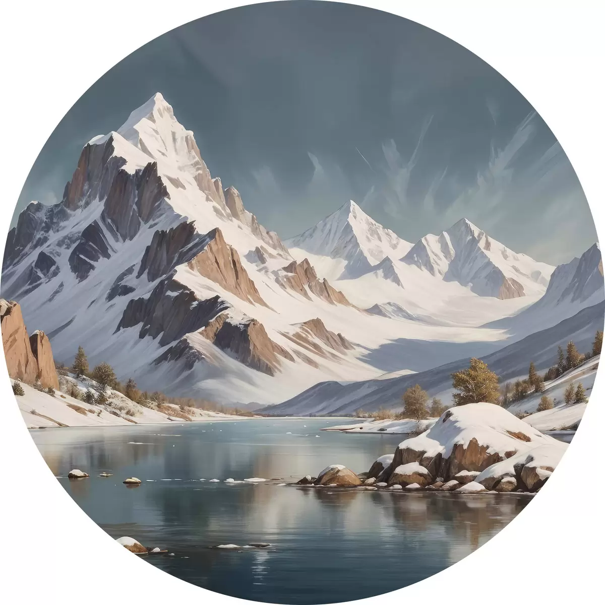 Attēls Sniegota kalnu grēda, kas atspoguļojas mierīgā ezerā, ar uz ūdens peldošām laivām un dramatiski mākoņainām debesīm Nr r40551