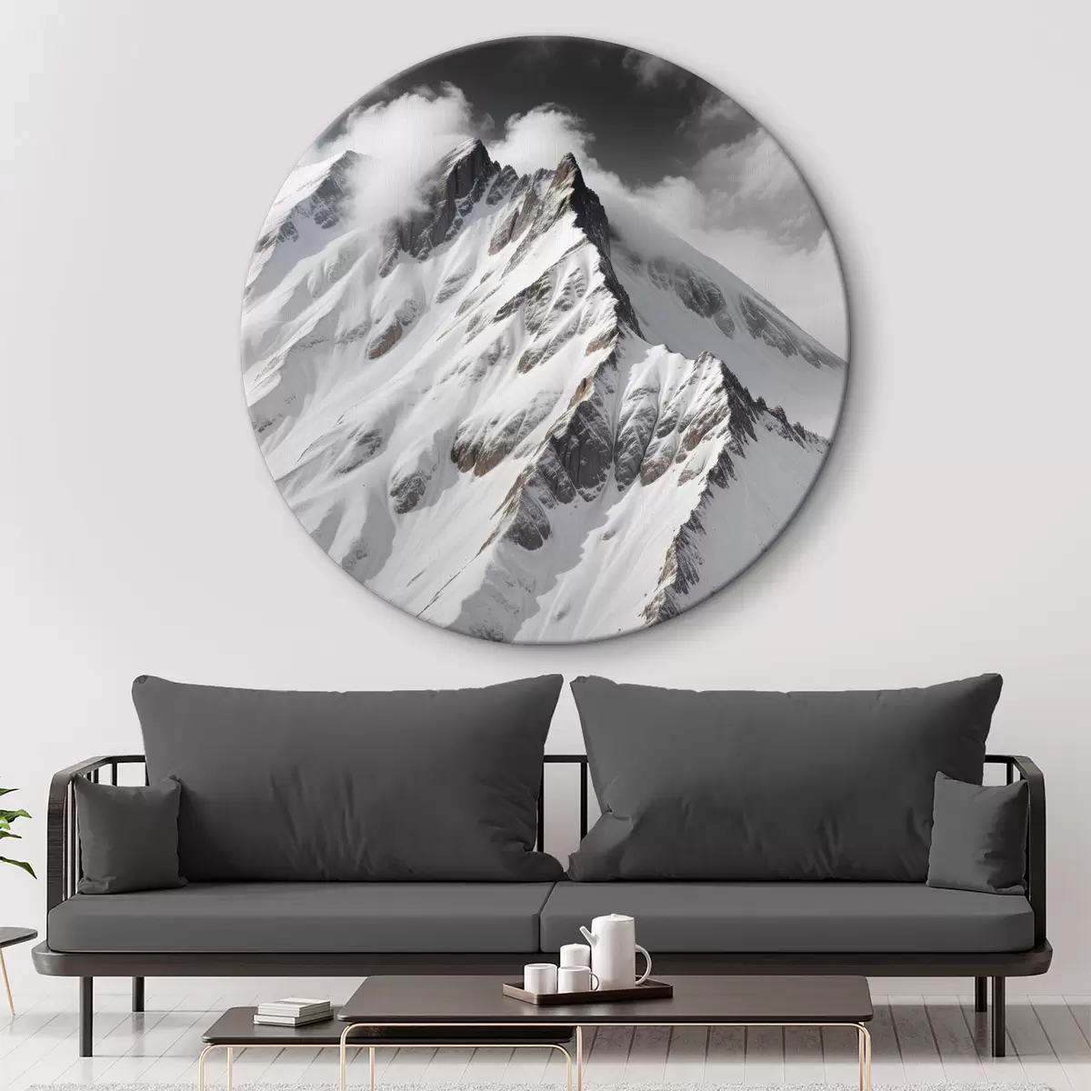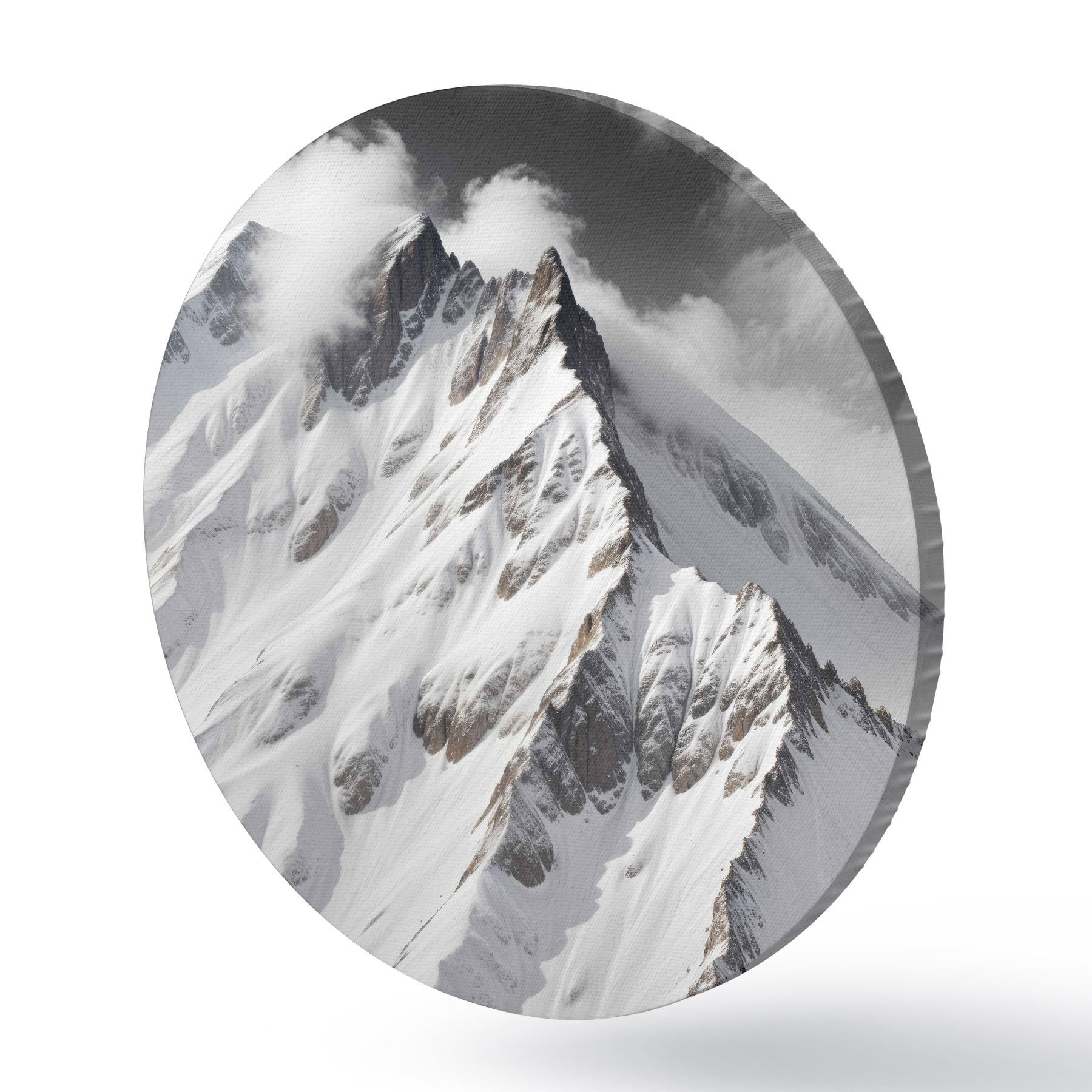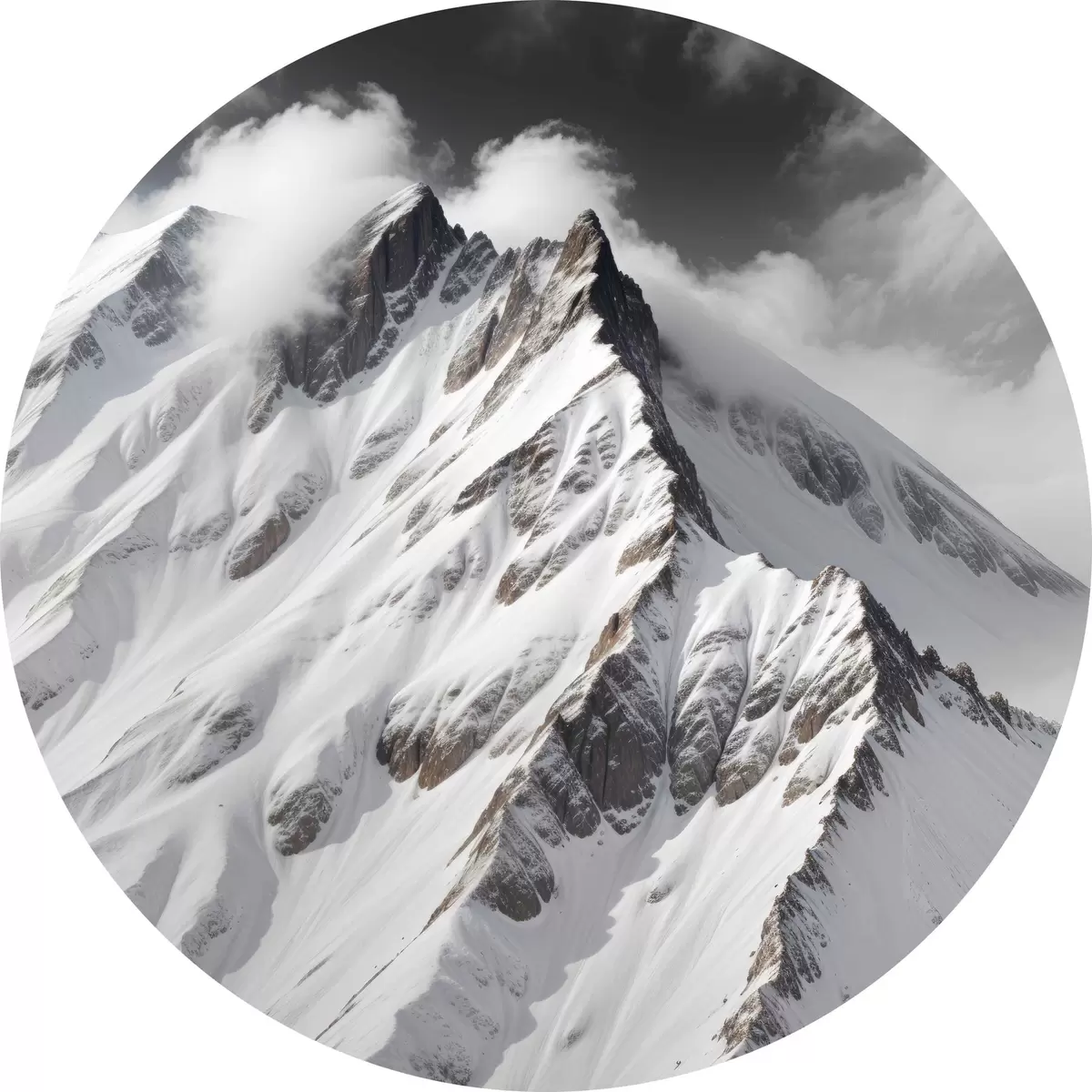 Apaļas gleznas Sniegotas melnbaltas kalnu virsotnes mākoņainā, dramatiskā ainavā r40553