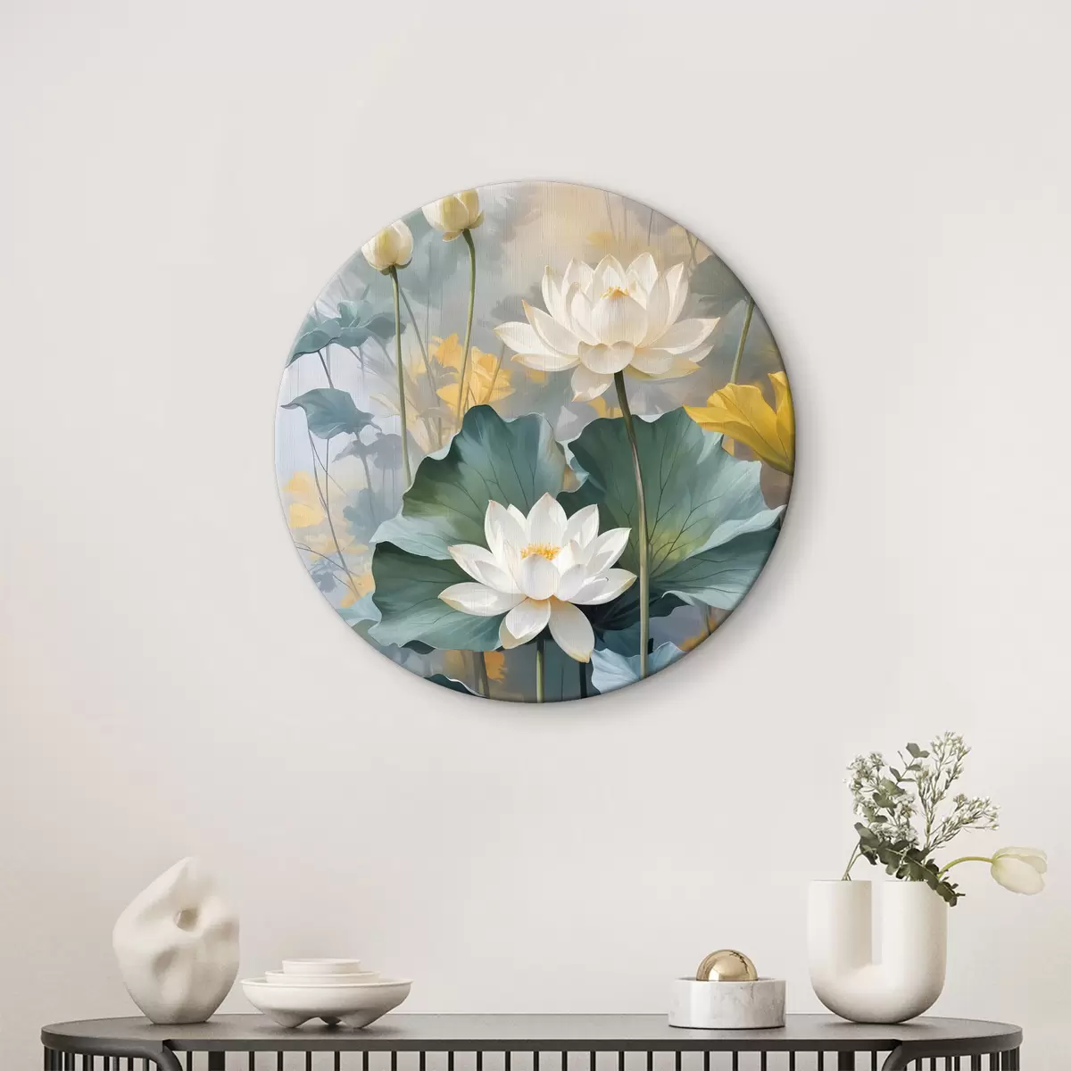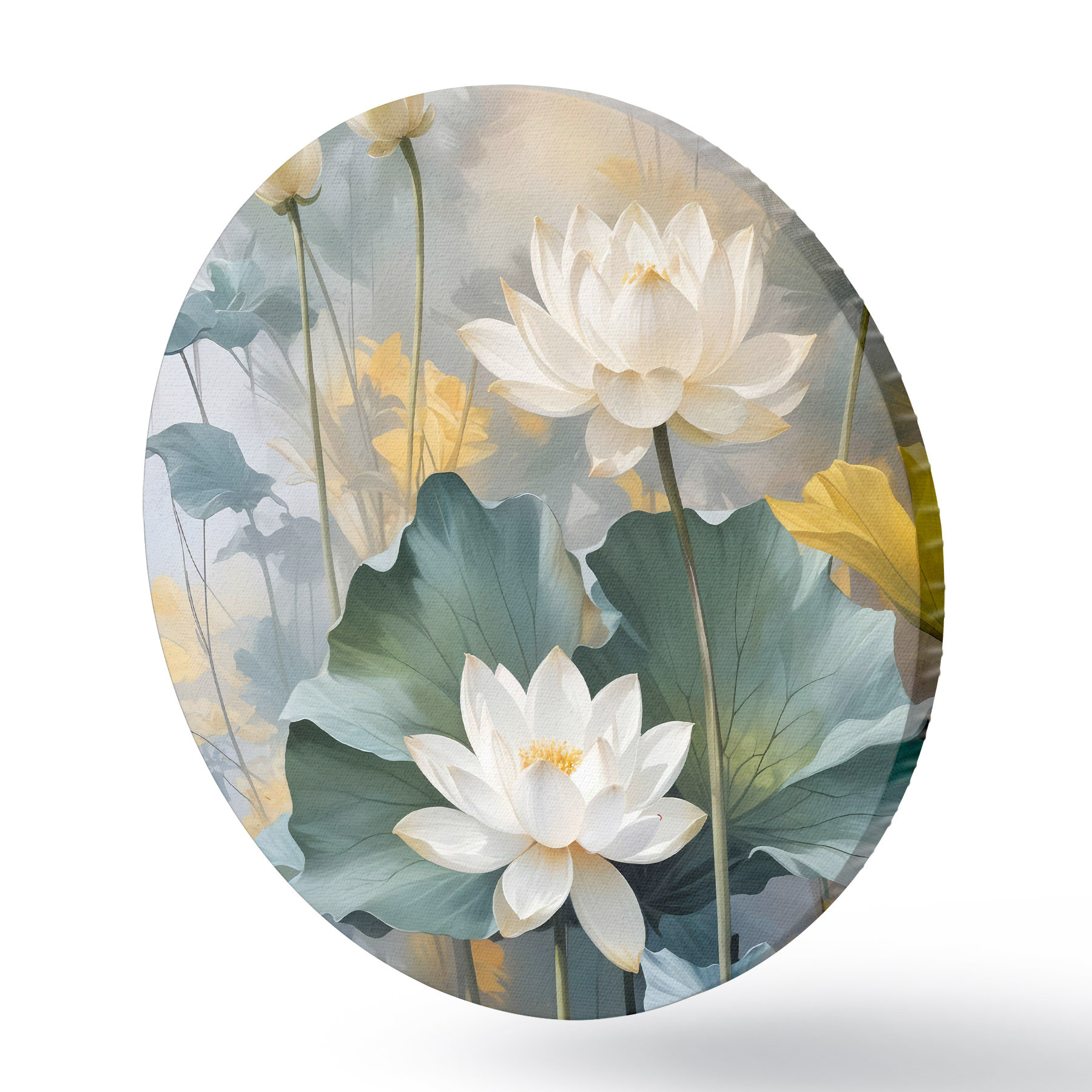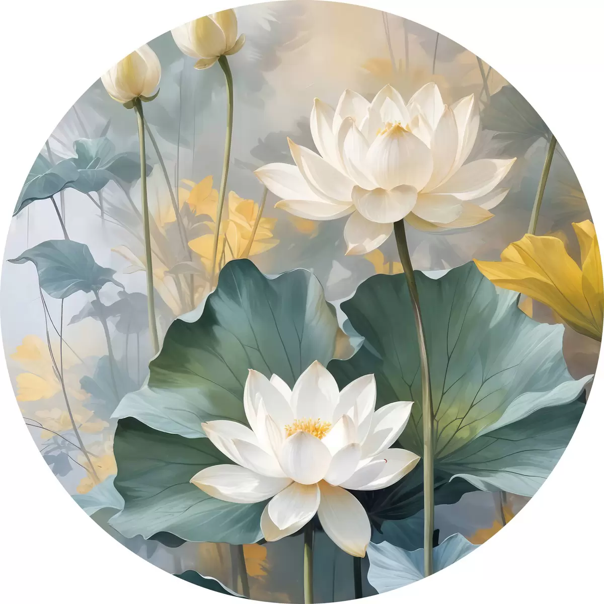 Apaļas gleznas Balti lotosa ziedi dīķī ar zaļām ūdensrožu ziedlapiņām, ko ieskauj dzelteni ziedi un neskaidrs fons r40559