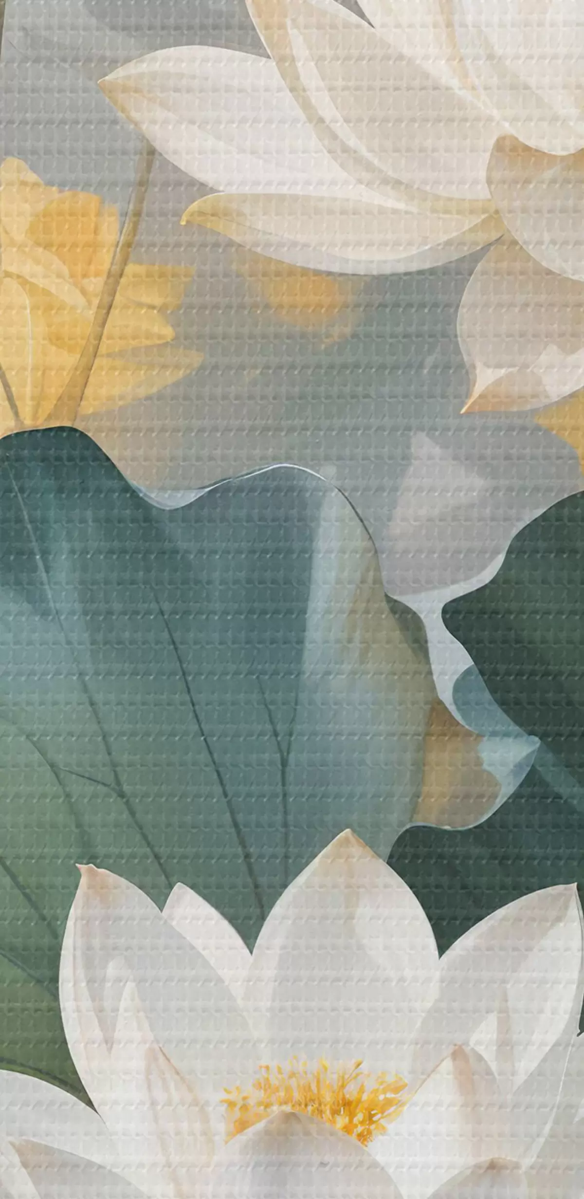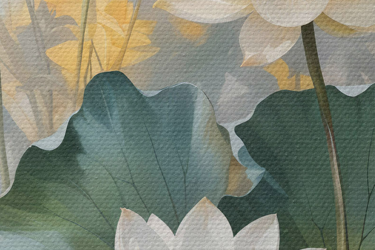 Attēls Balti lotosa ziedi dīķī ar zaļām ūdensrožu ziedlapiņām, ko ieskauj dzelteni ziedi un neskaidrs fons Nr r40559