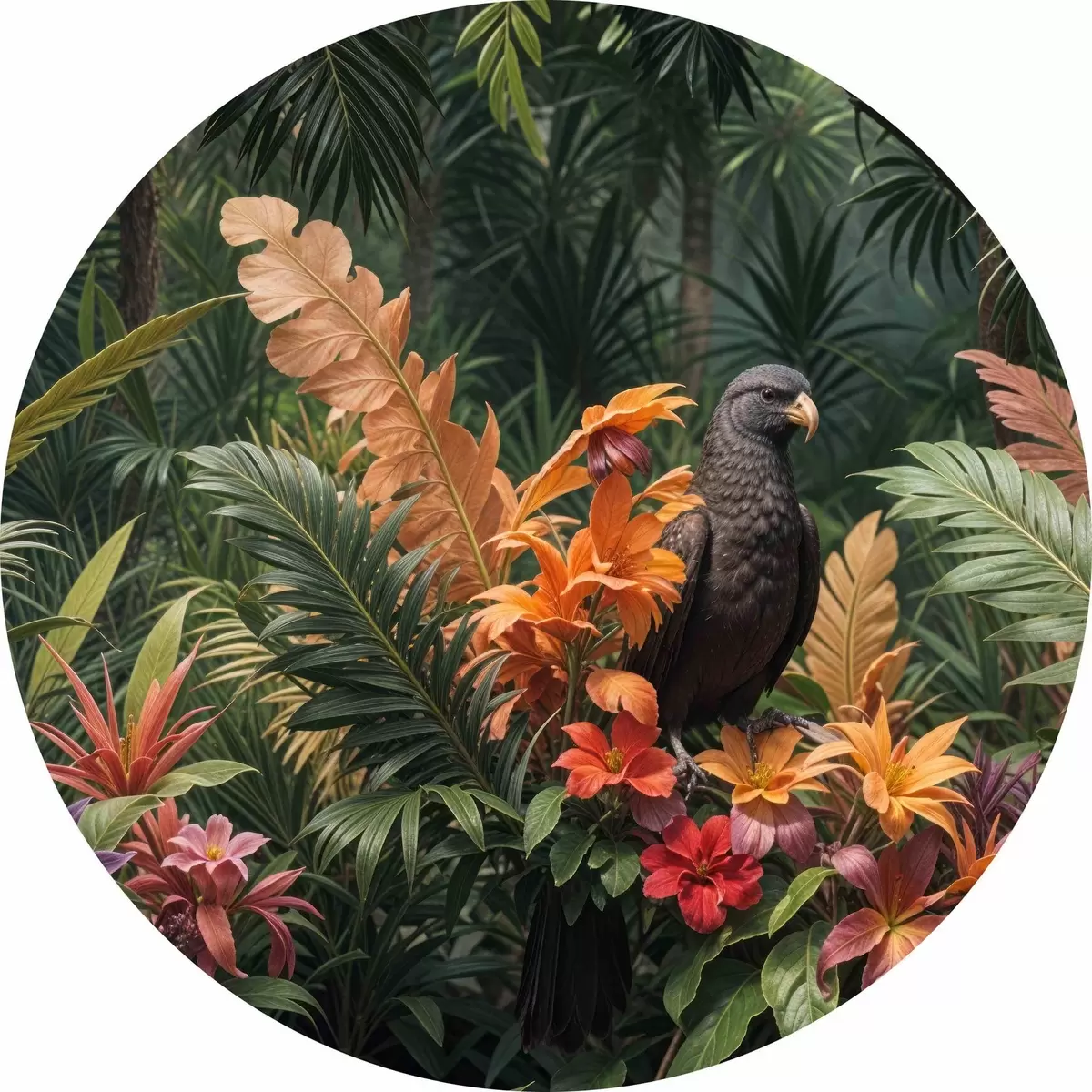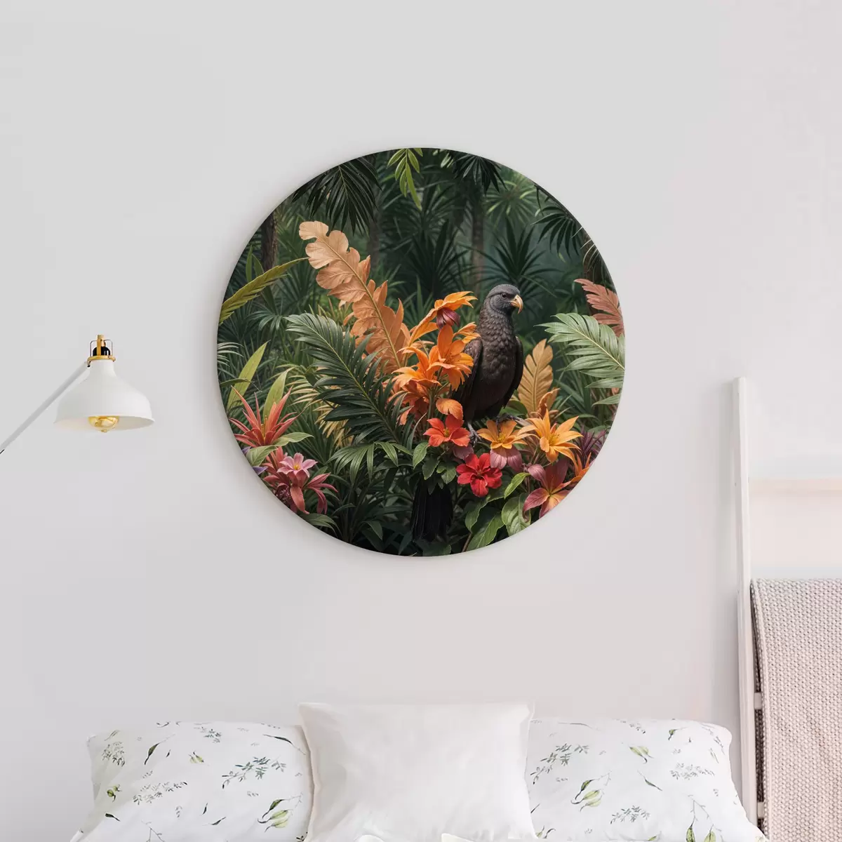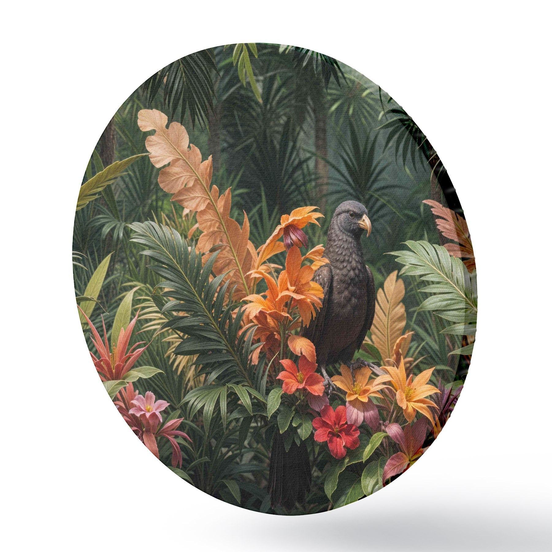 Apaļas gleznas Tropu putns, kas sēž uz zara sulīgas veģetācijas, palmu lapu, ziedu un eksotisku augu ieskautā vietā r40578
