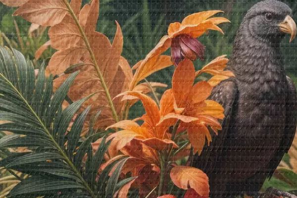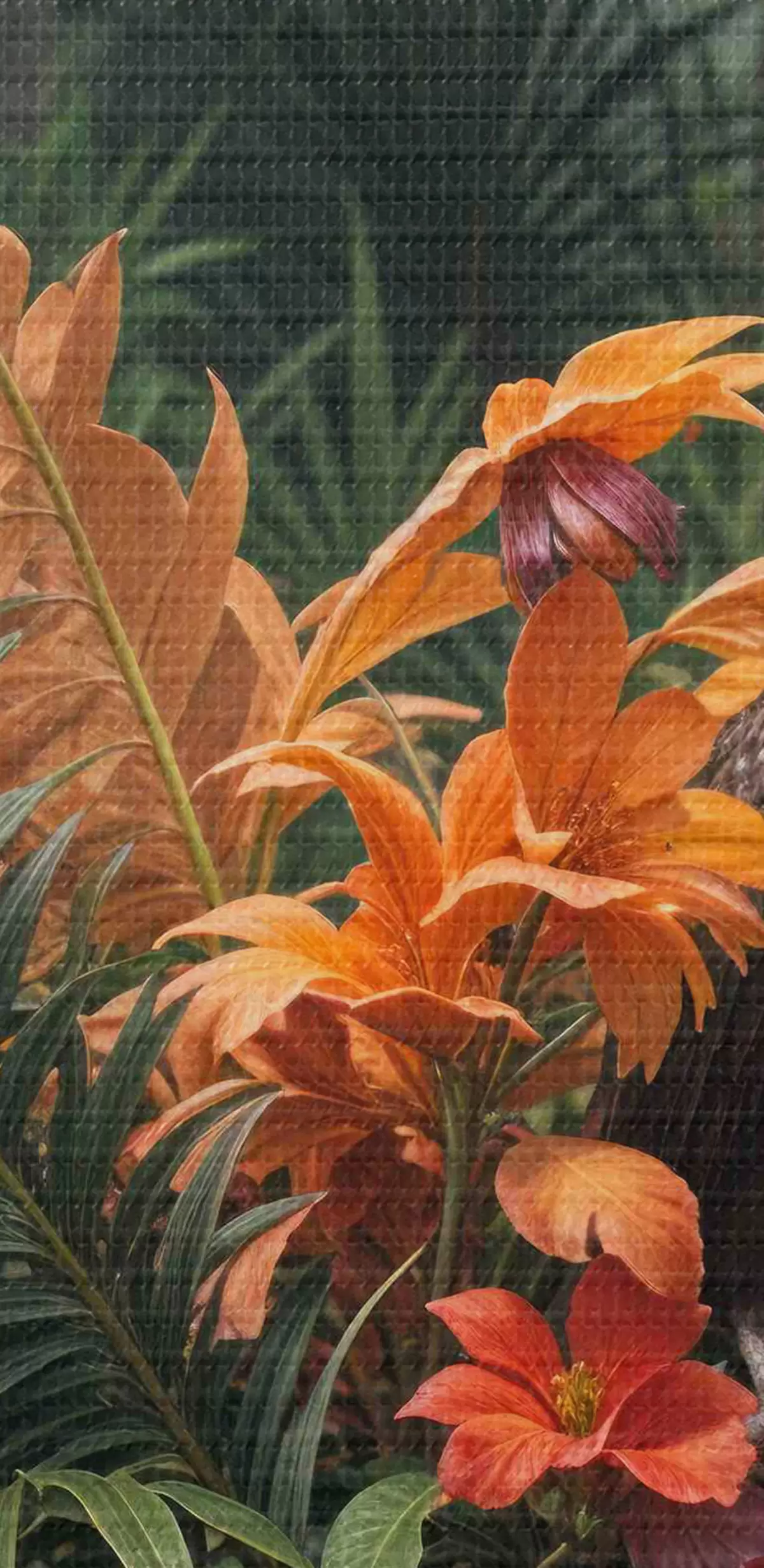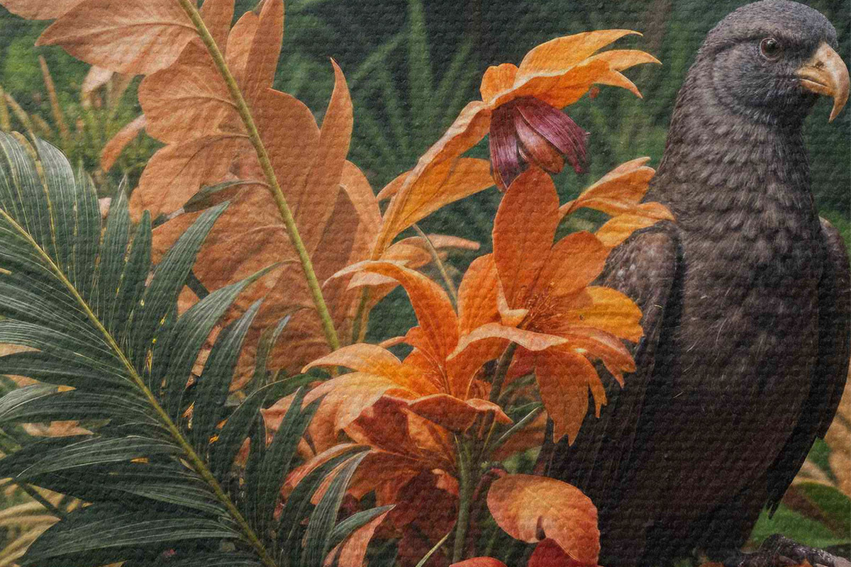 Attēls Tropu putns, kas sēž uz zara sulīgas veģetācijas, palmu lapu, ziedu un eksotisku augu ieskautā vietā Nr r40578