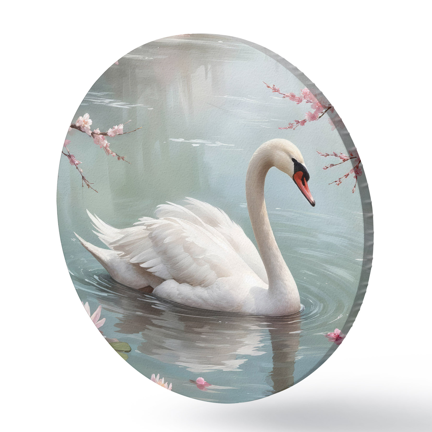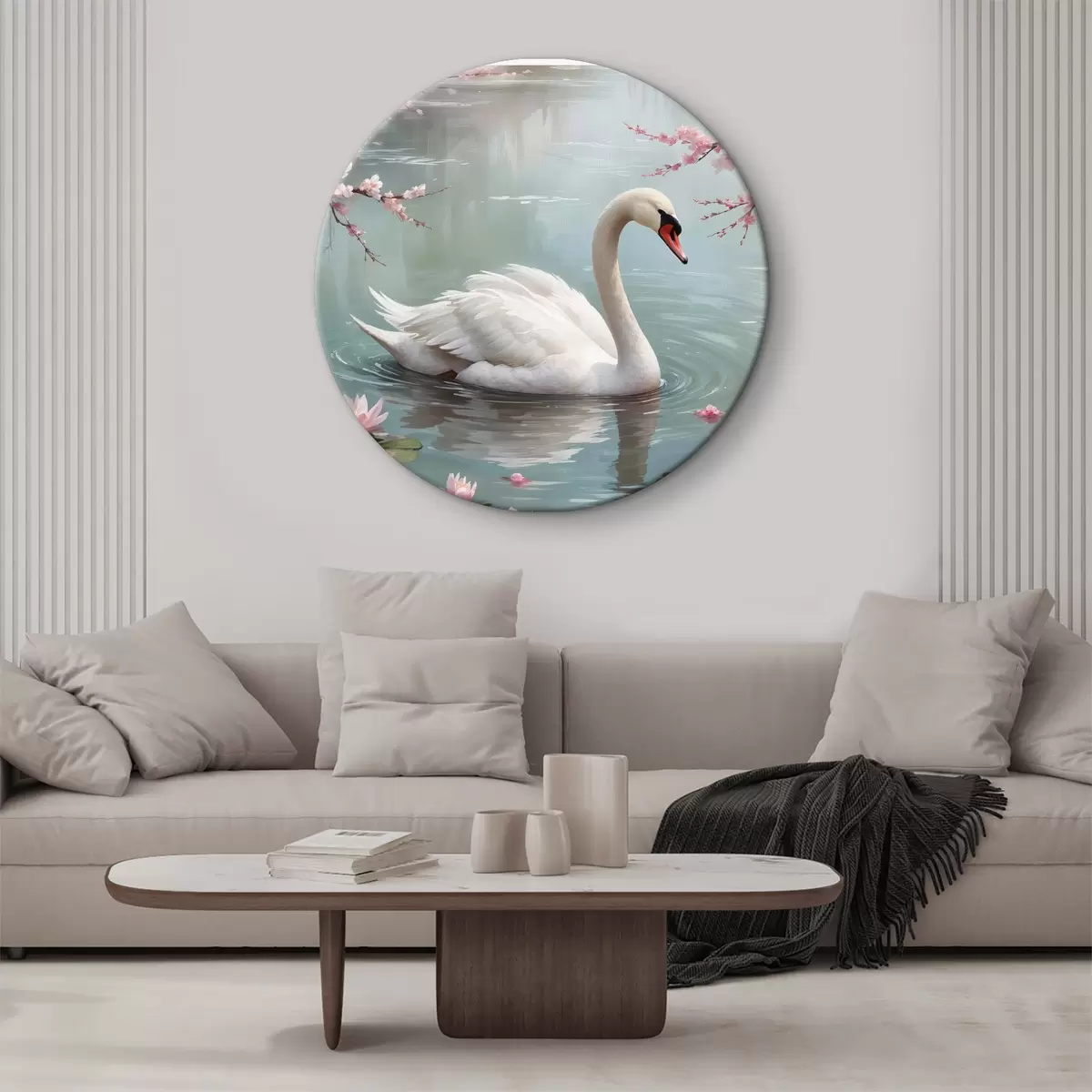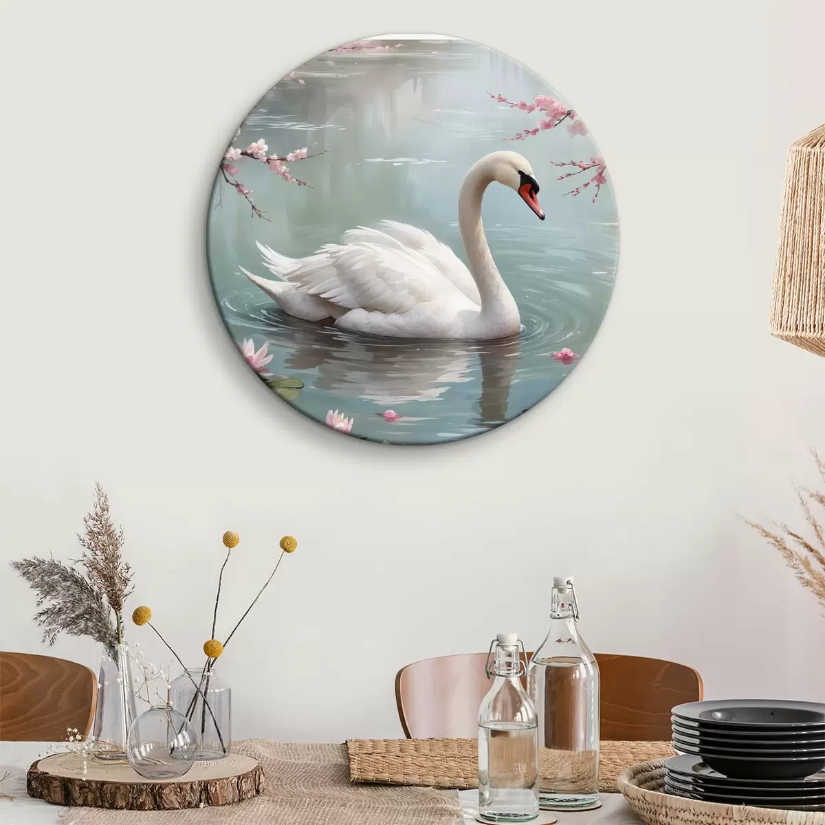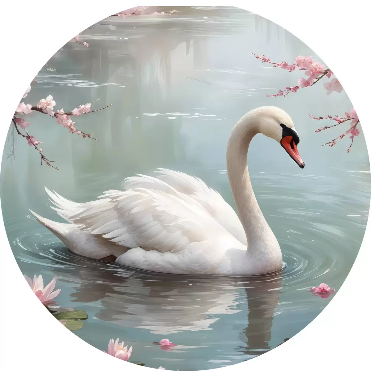 Attēls Graciozs balts gulbis peld mierīgā dīķī, ko ieskauj ziedoši rozā ķiršu koki Nr r40597