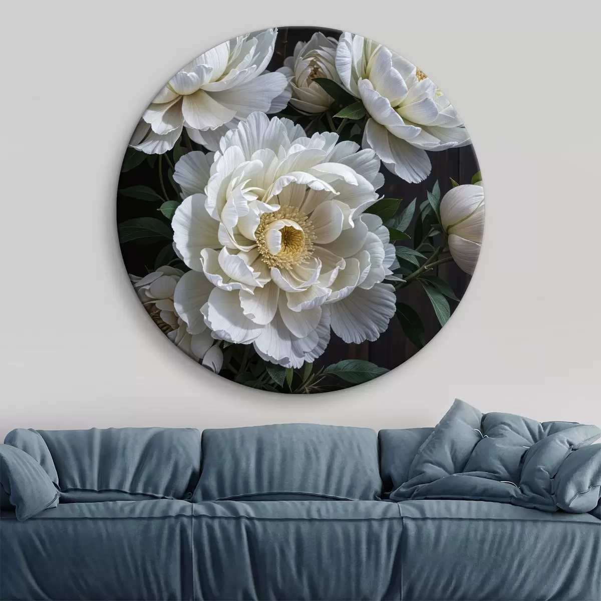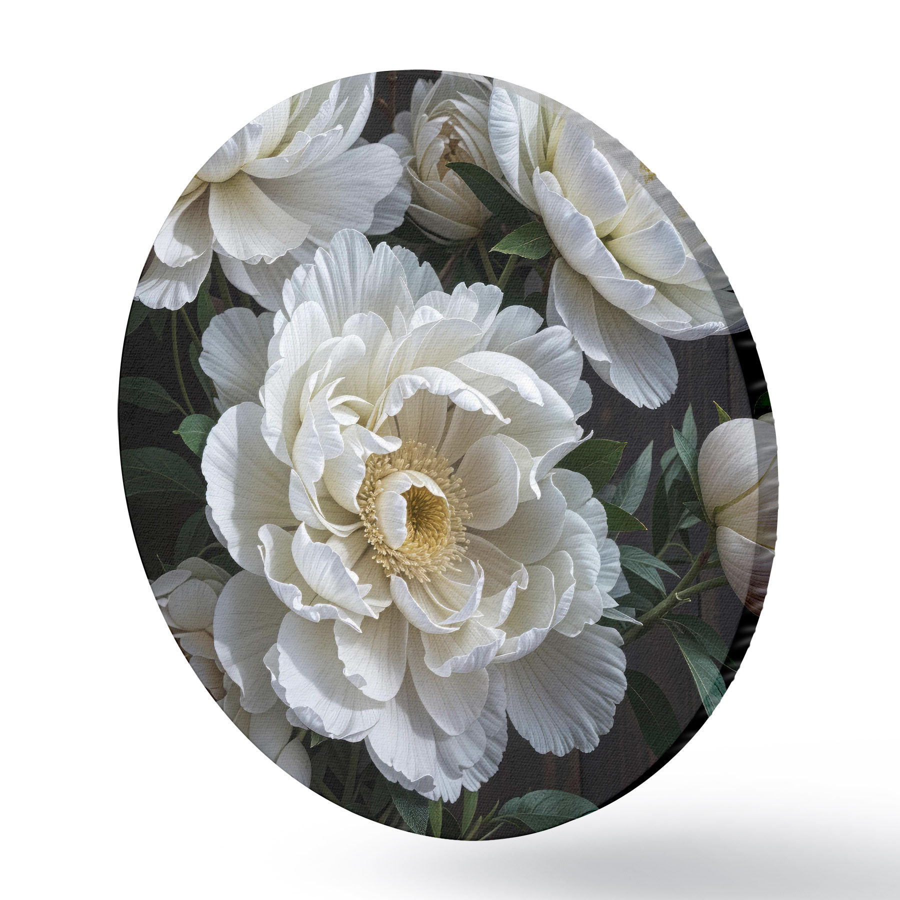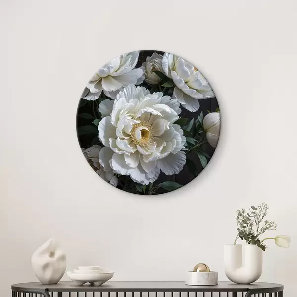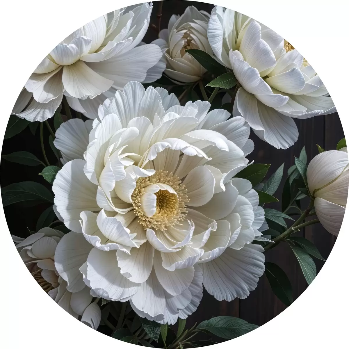 Attēls Balti peoniju ziedi ar dzelteniem centriem zied dārzā uz tumša fona Nr r40600