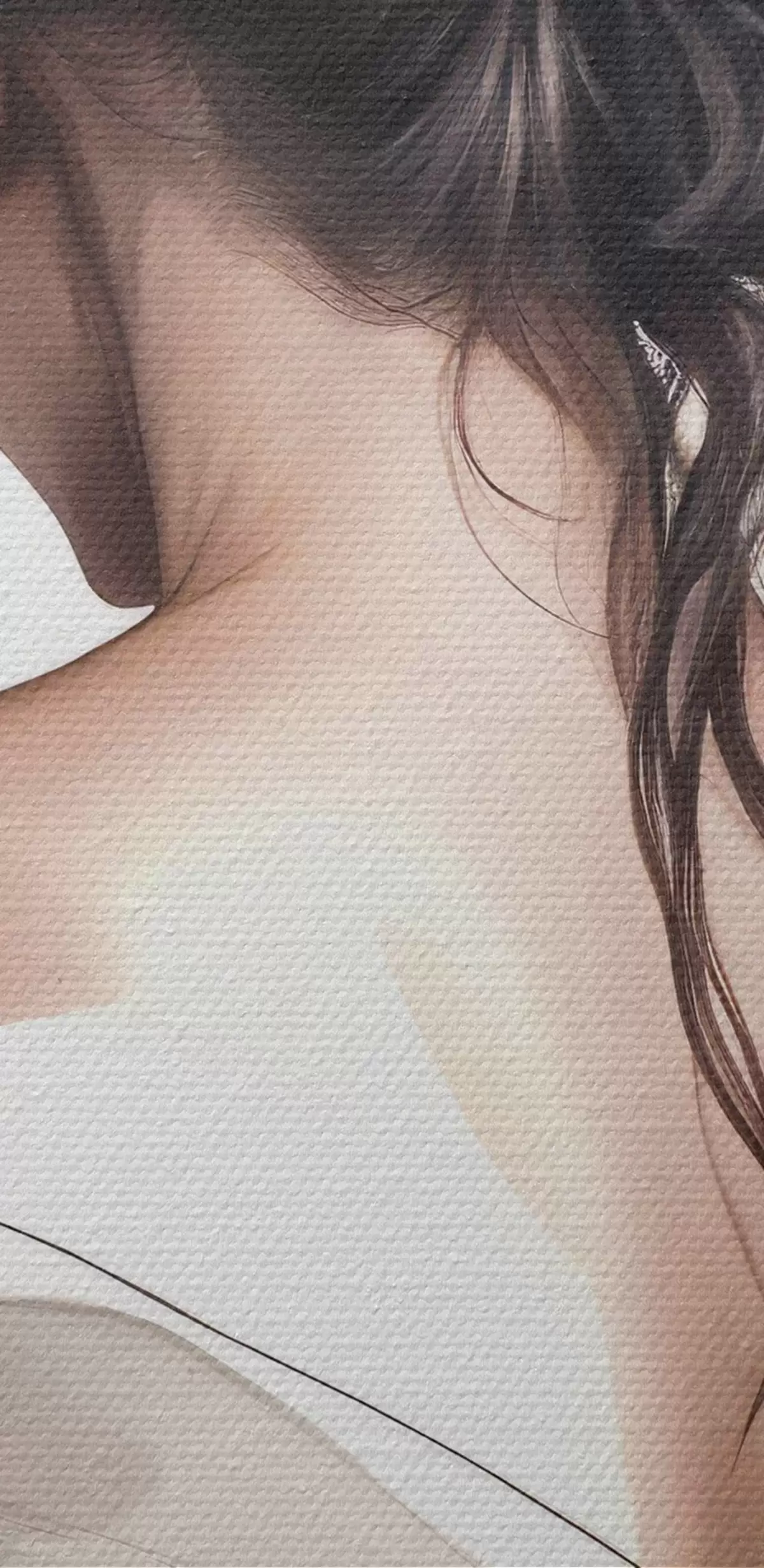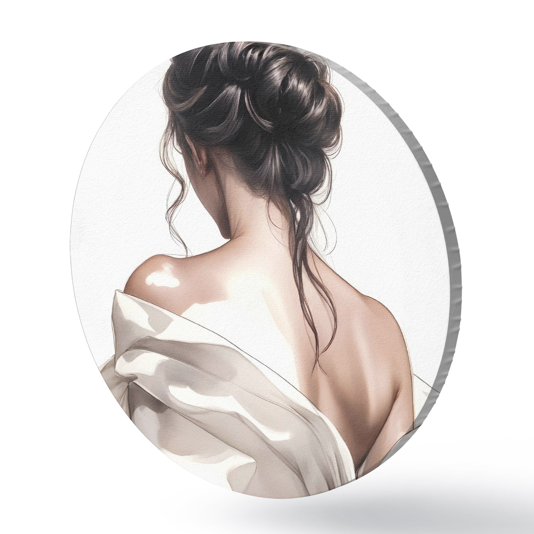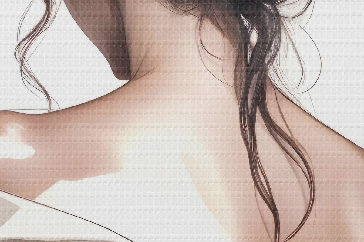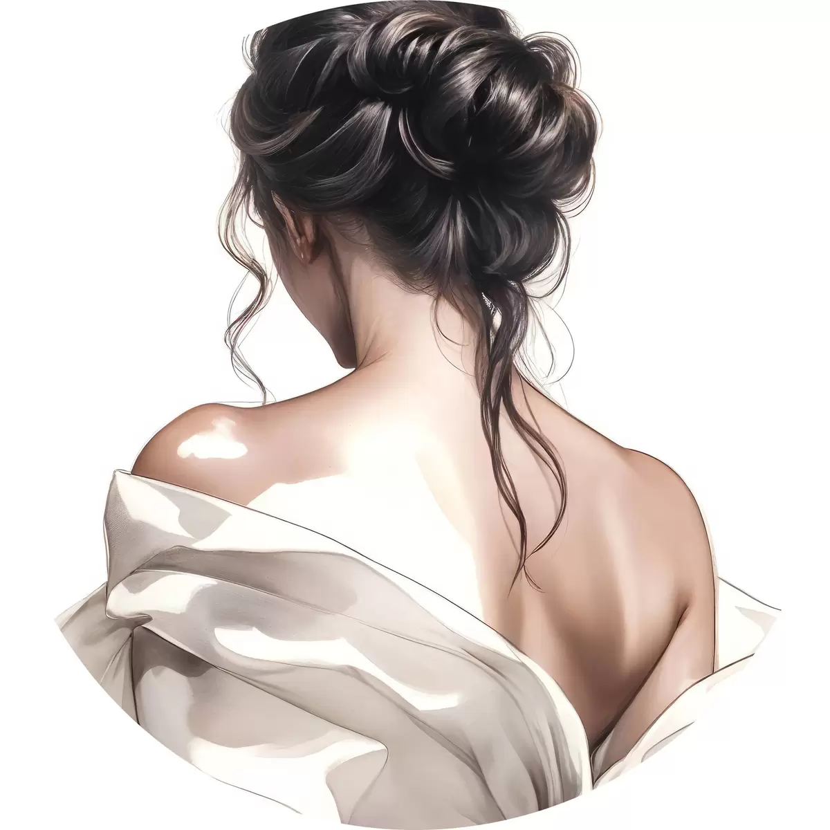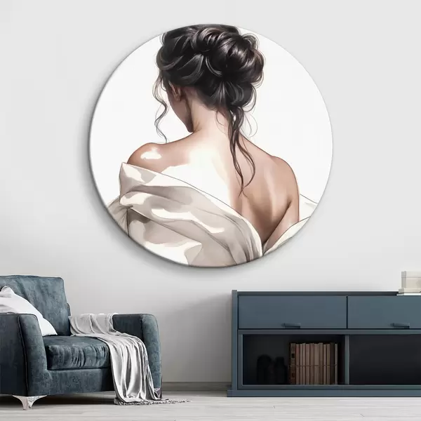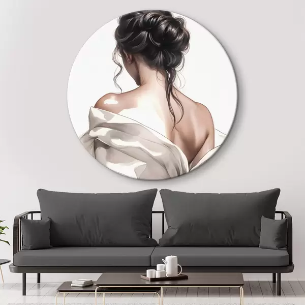 Attēls Minimālisma stilā veidota glezna, kurā attēlota sieviete ar gariem, tumšiem, viļņainiem matiem, kas sakārtoti elegantā sakārtojumā un tērpti baltā peldmēteļa drānā Nr r40605