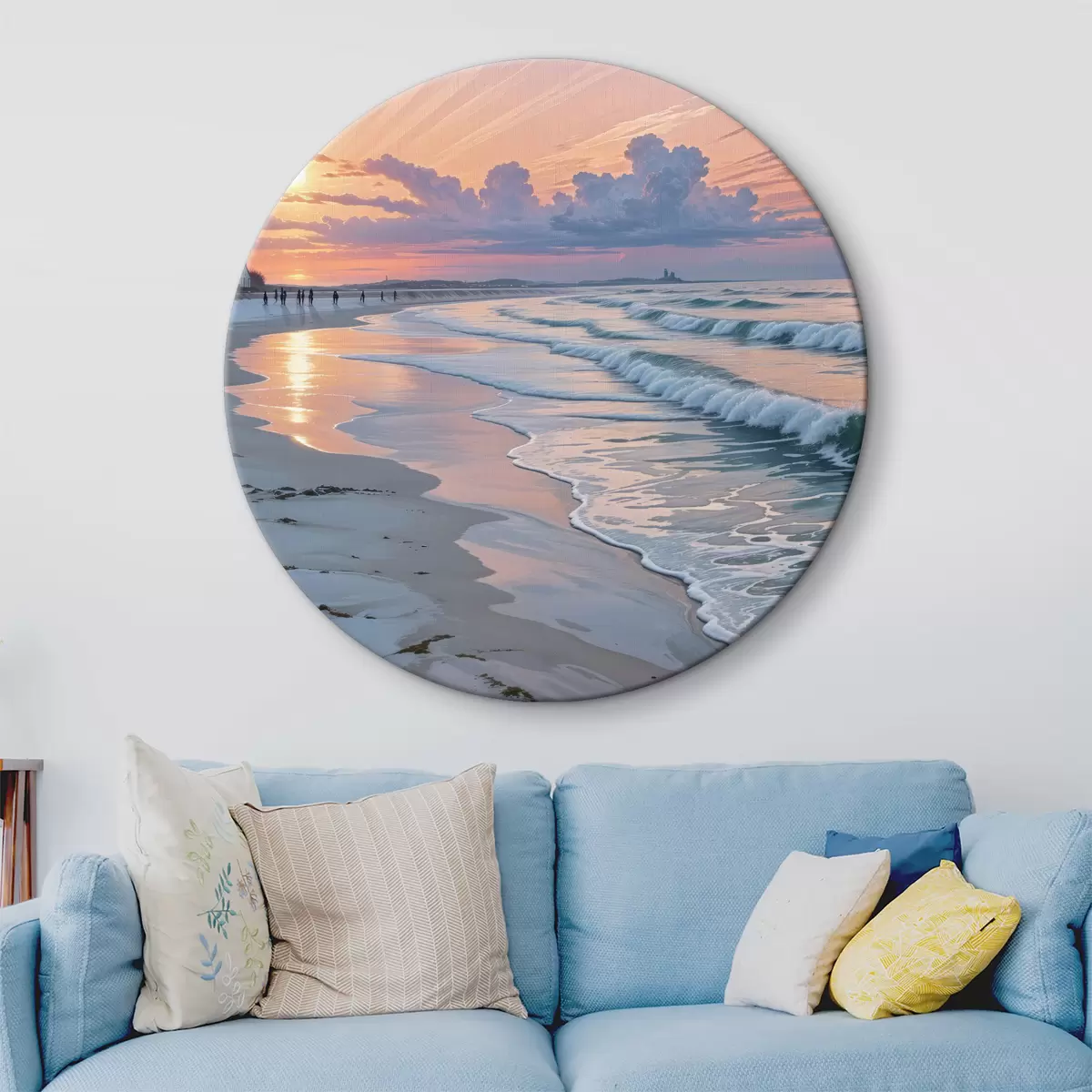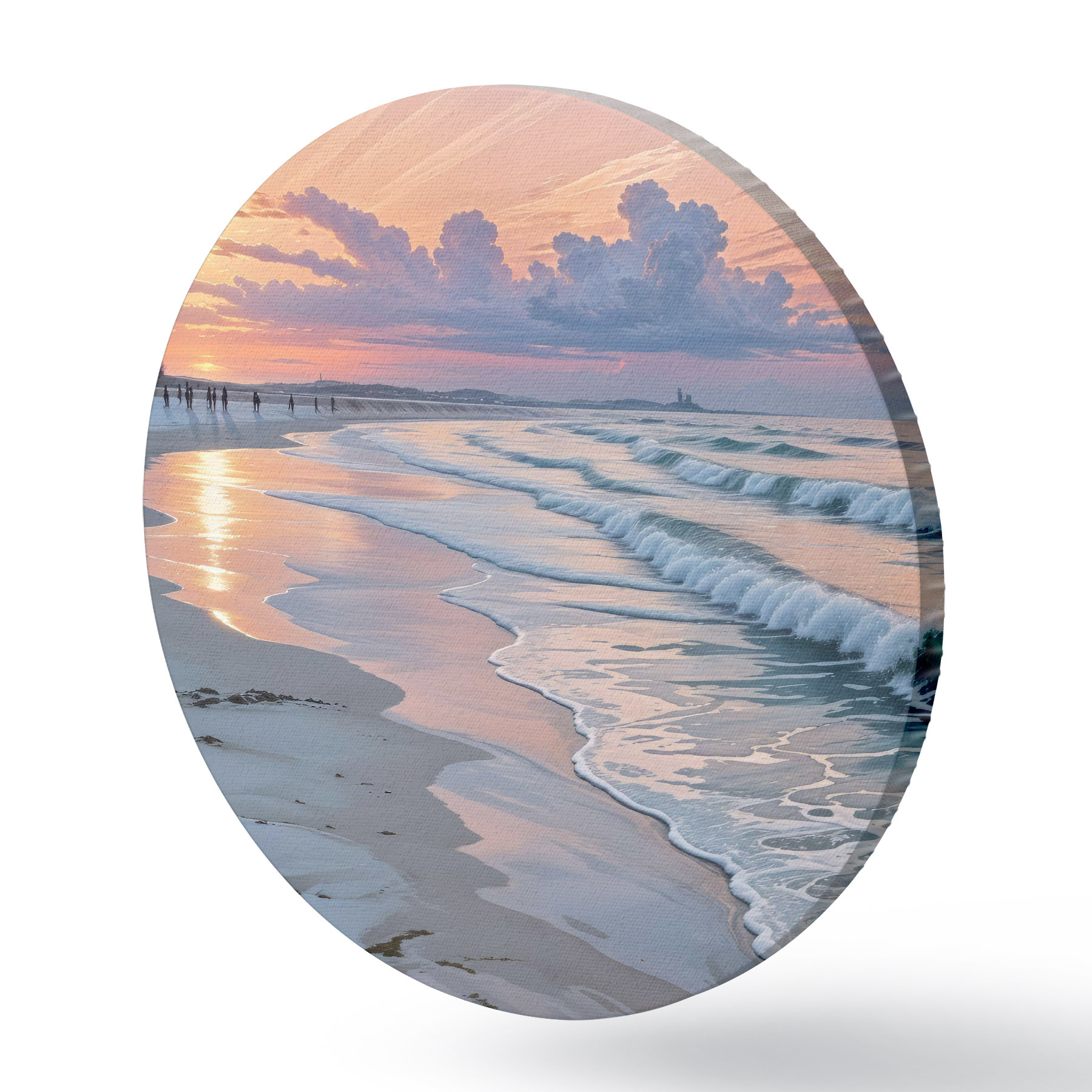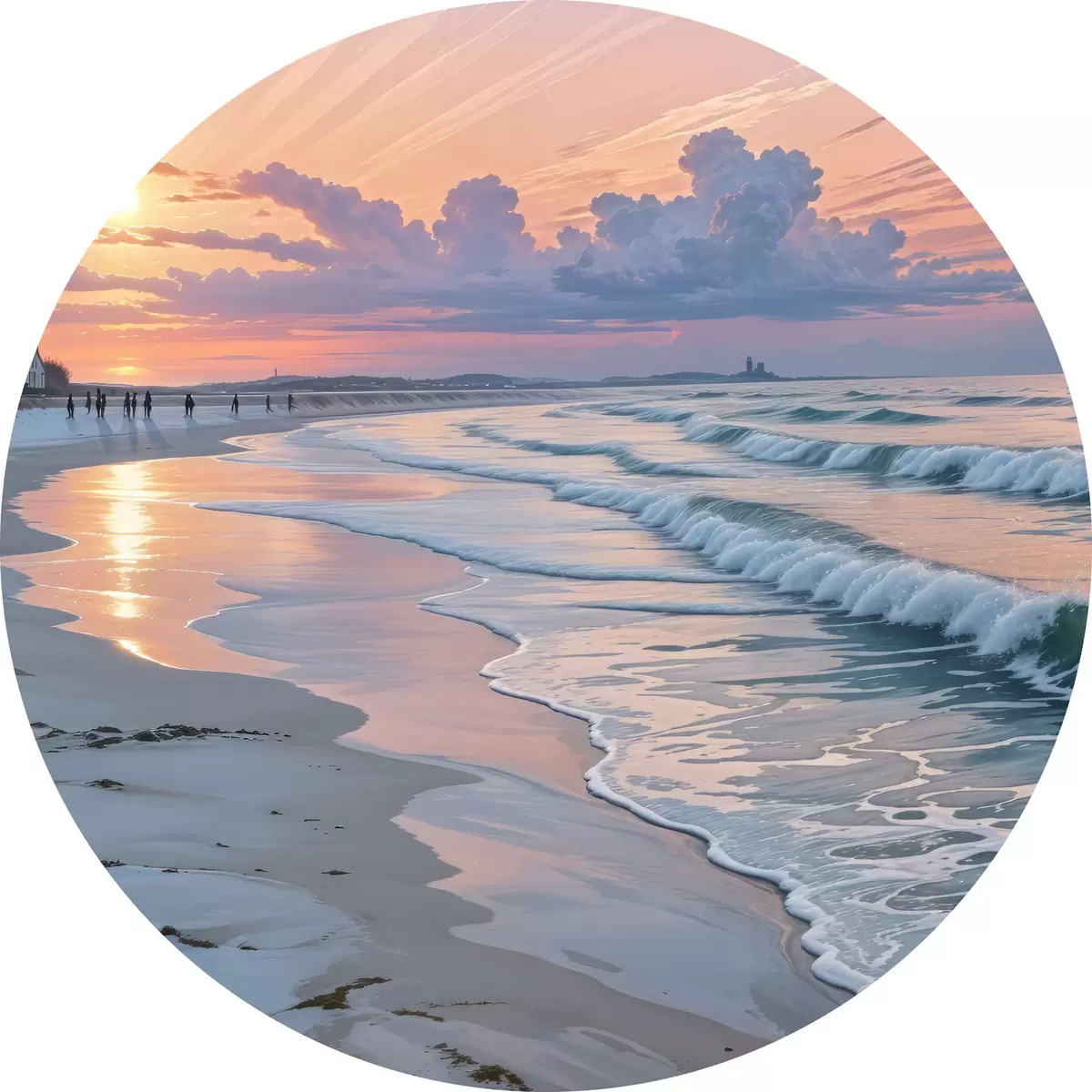 Apaļas gleznas Klusa aina pludmalē saulrieta laikā, kad smilšaino krastu skalo maigi viļņi r40606