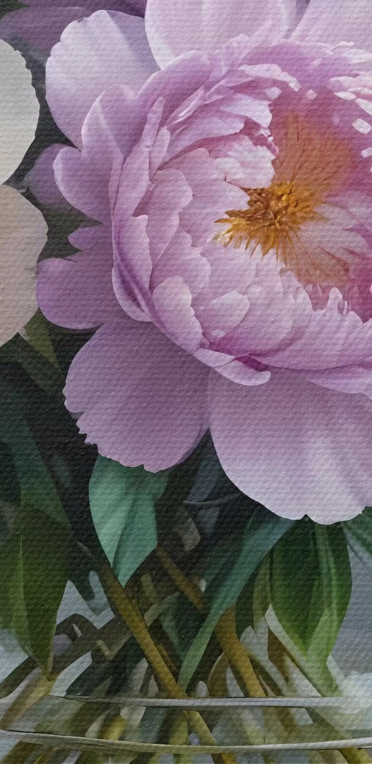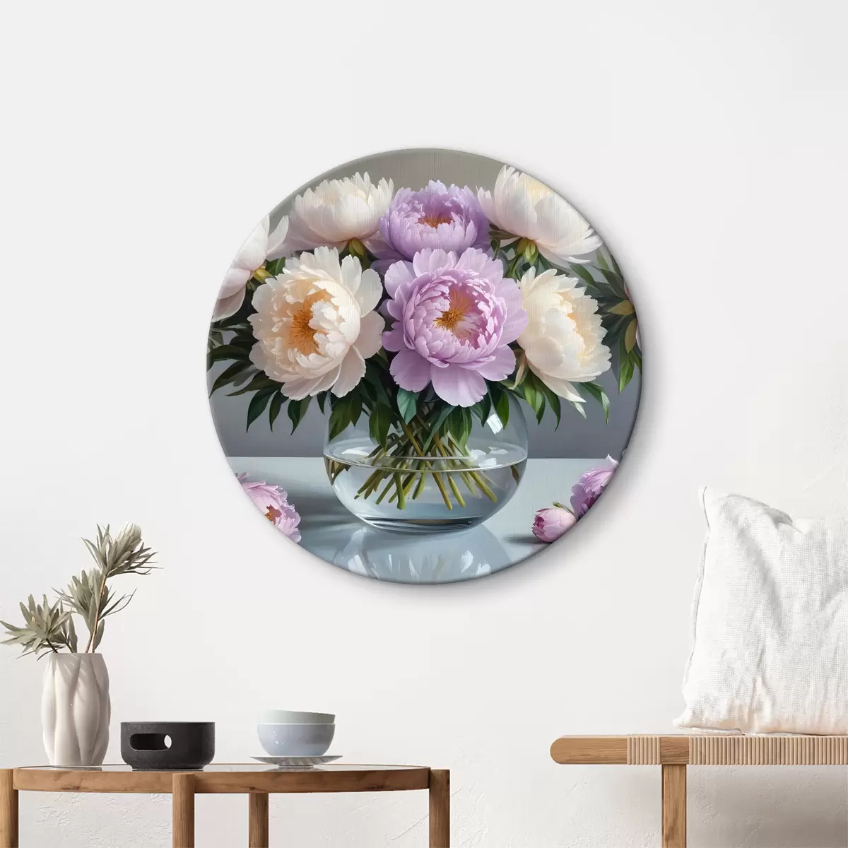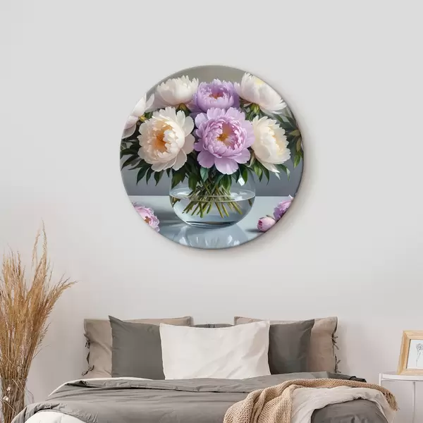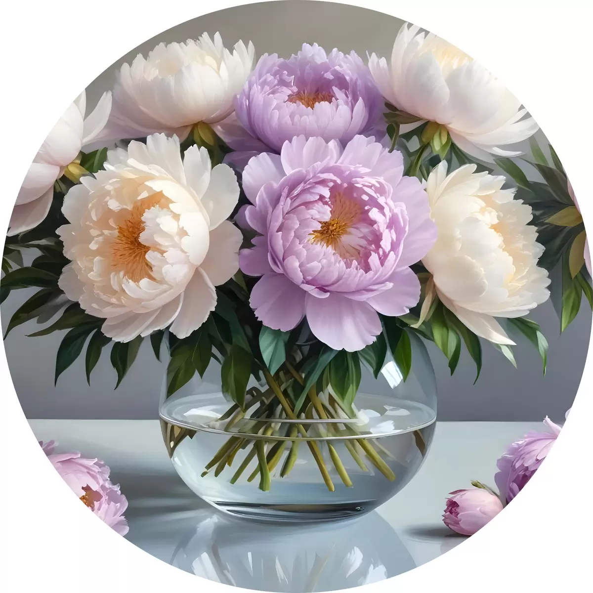 Apaļas gleznas Lielu, sulīgu baltu un rozā peoniju pušķis stikla vāzē uz pelēka fona r40610