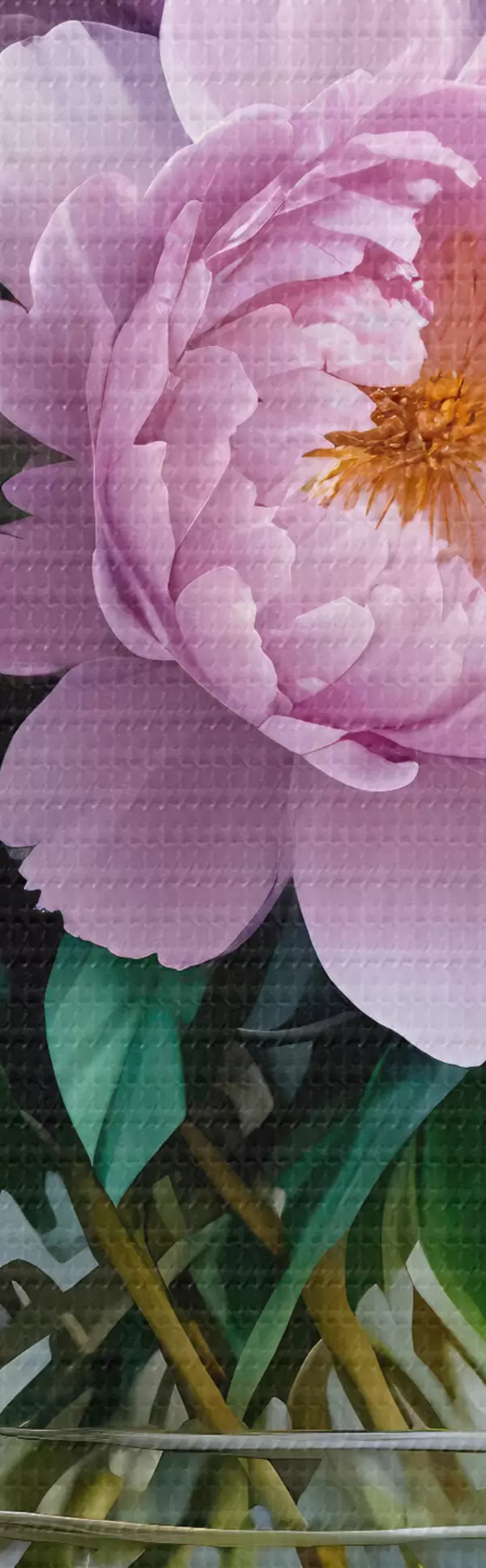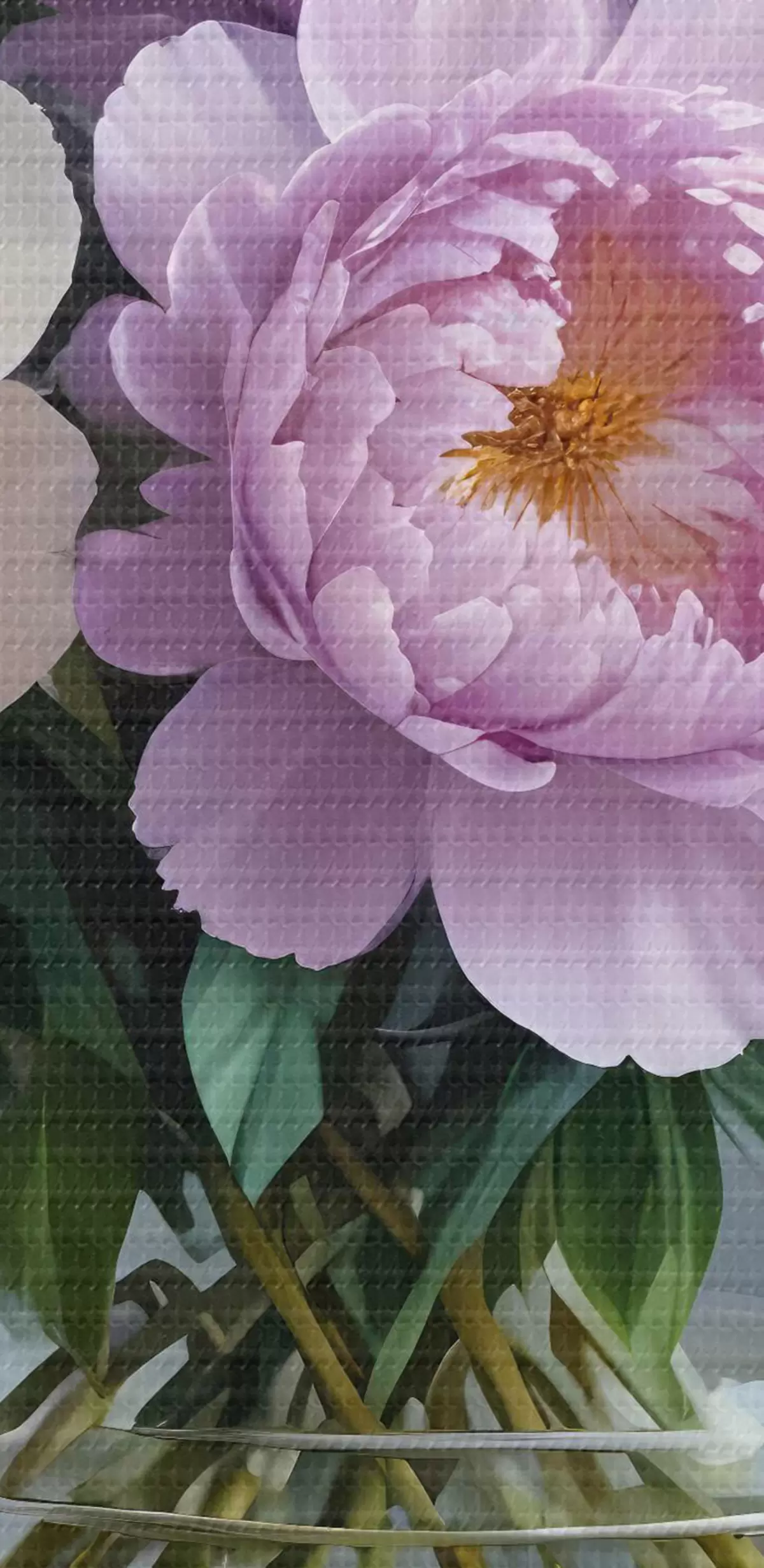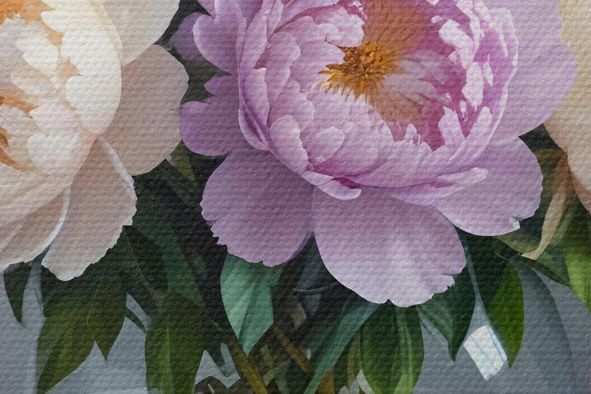 Attēls Lielu, sulīgu baltu un rozā peoniju pušķis stikla vāzē uz pelēka fona Nr r40610