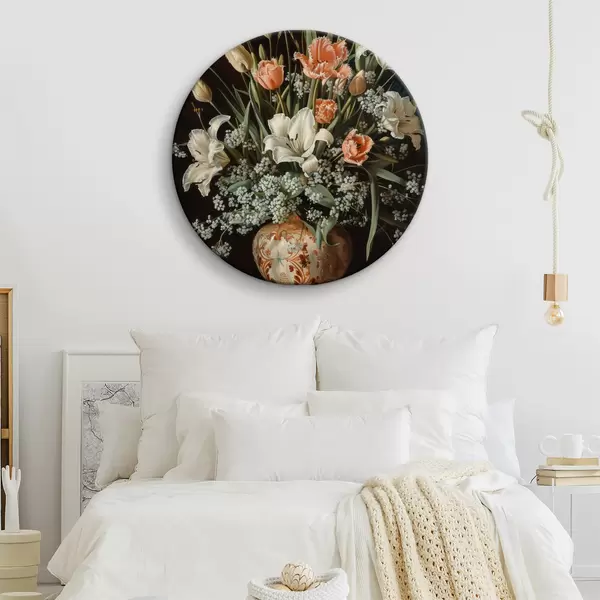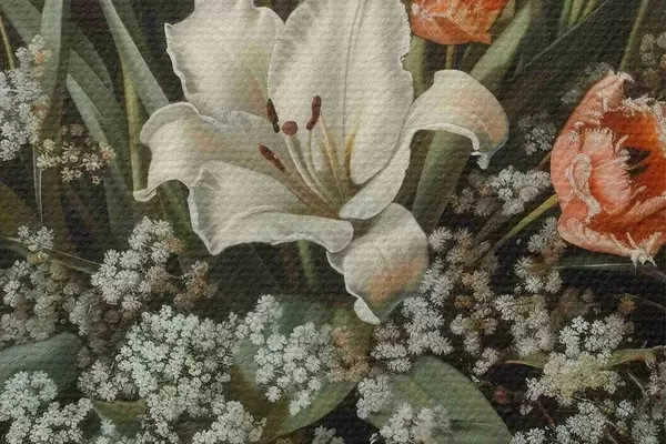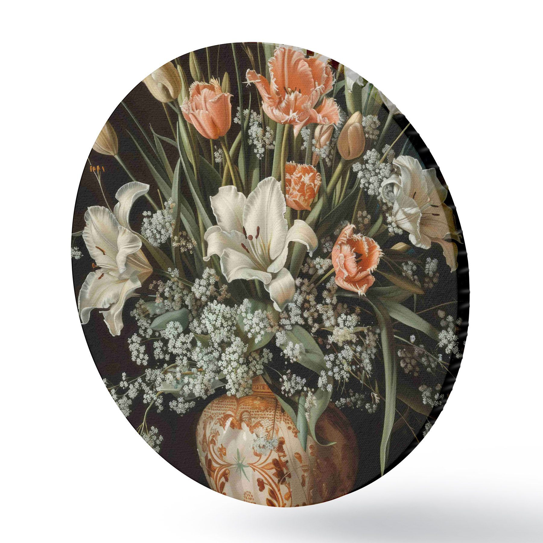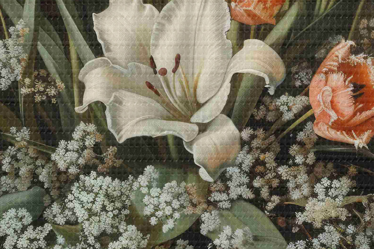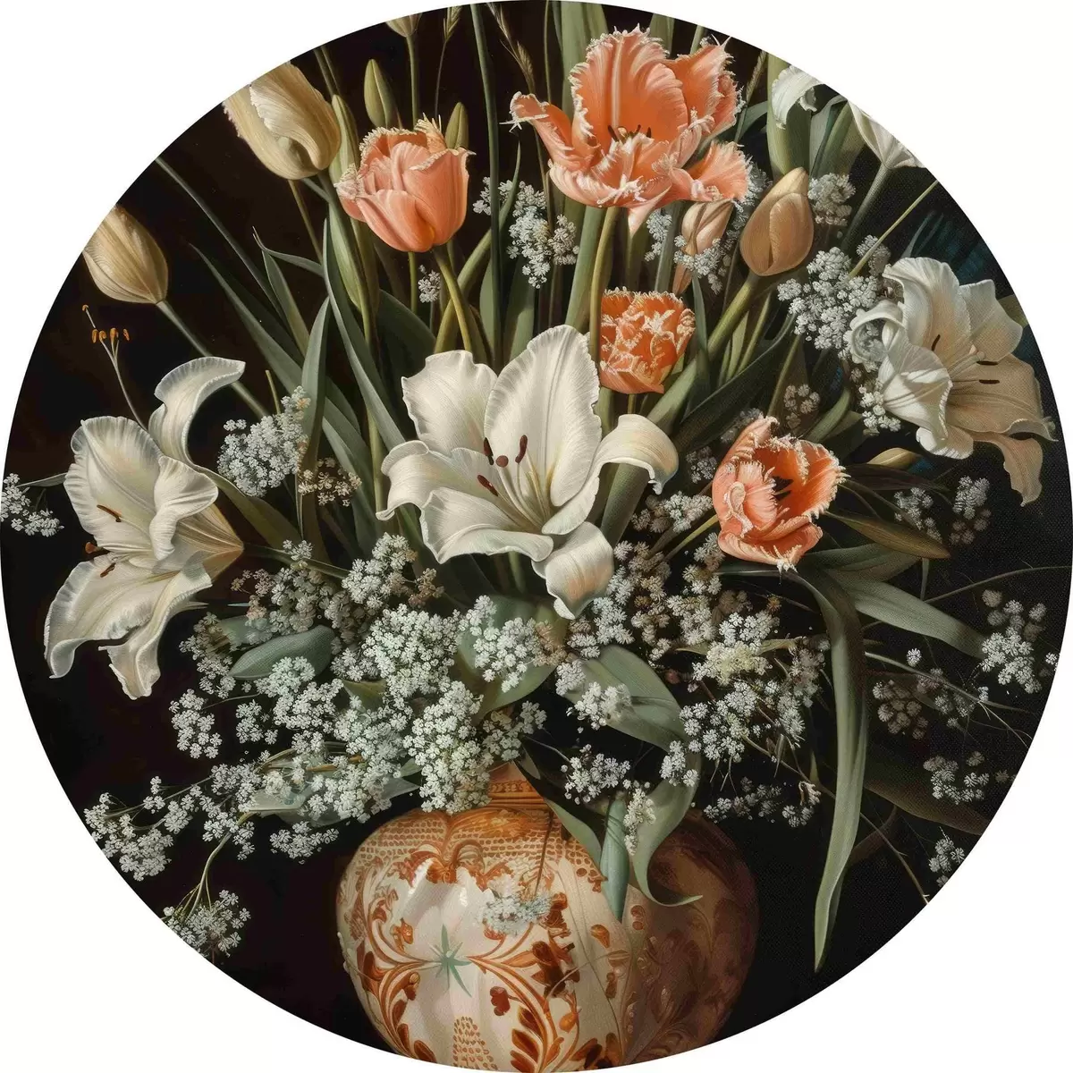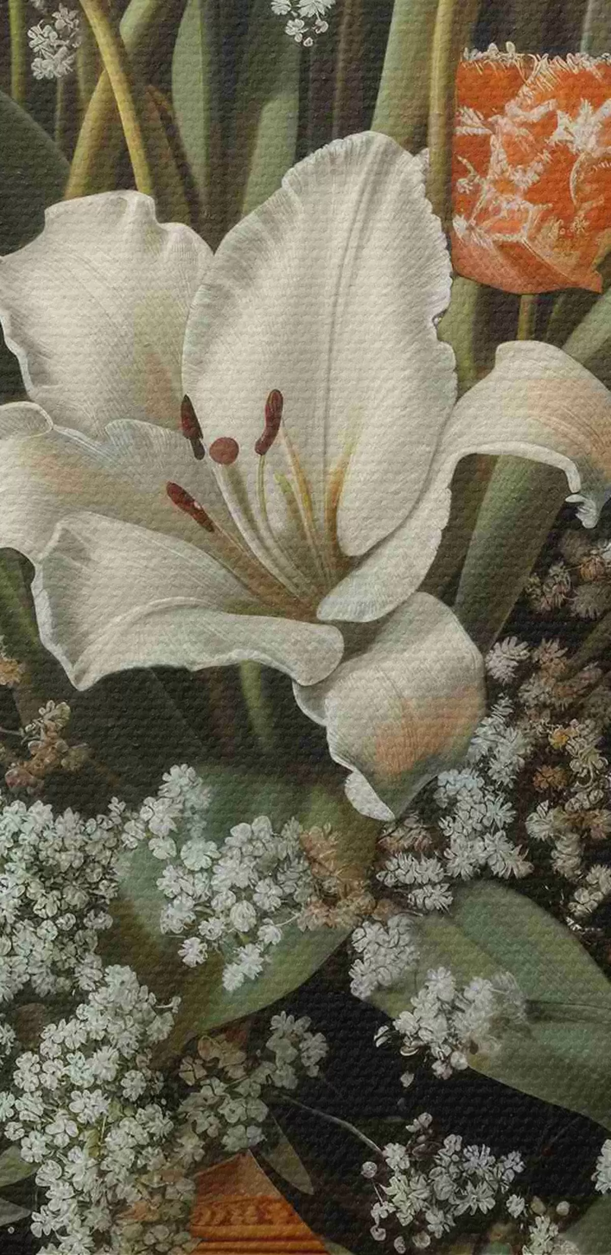 Attēls Ekstravaganta baroka klusā daba, kurā attēlota vāze ar tulpēm, neļķēm un hiacintēm, eļļas gleznas imitācija Nr r40658