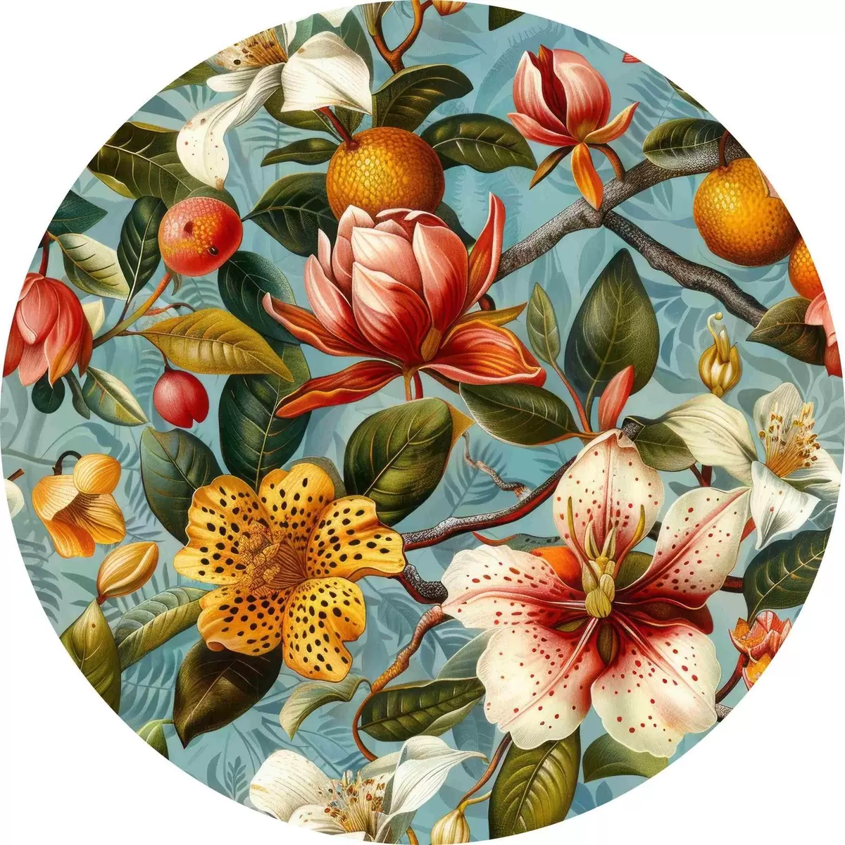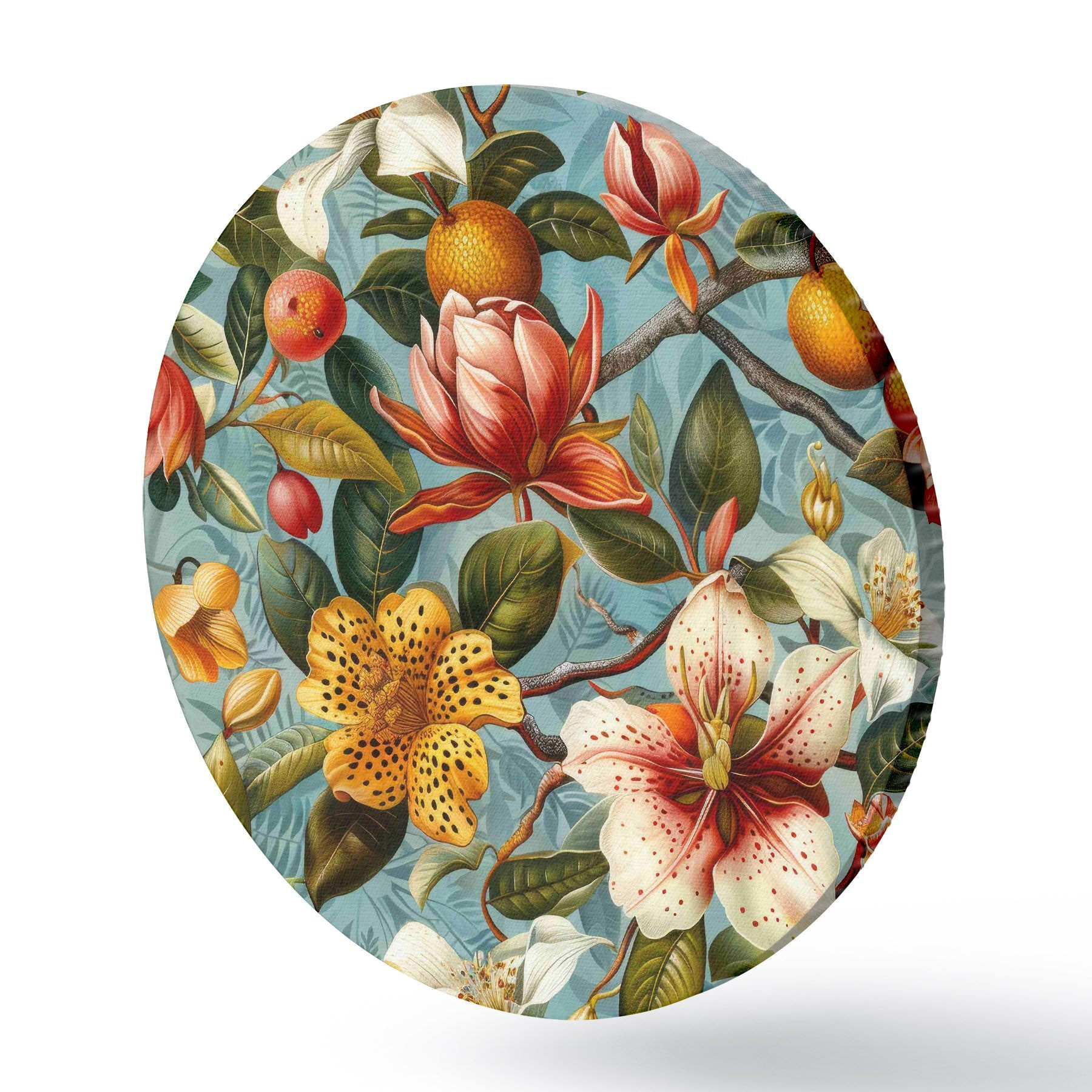Apaļas gleznas Tropu kompozīcija ar dažādiem zaļumiem un tropu ziediem uz zila fona r40665