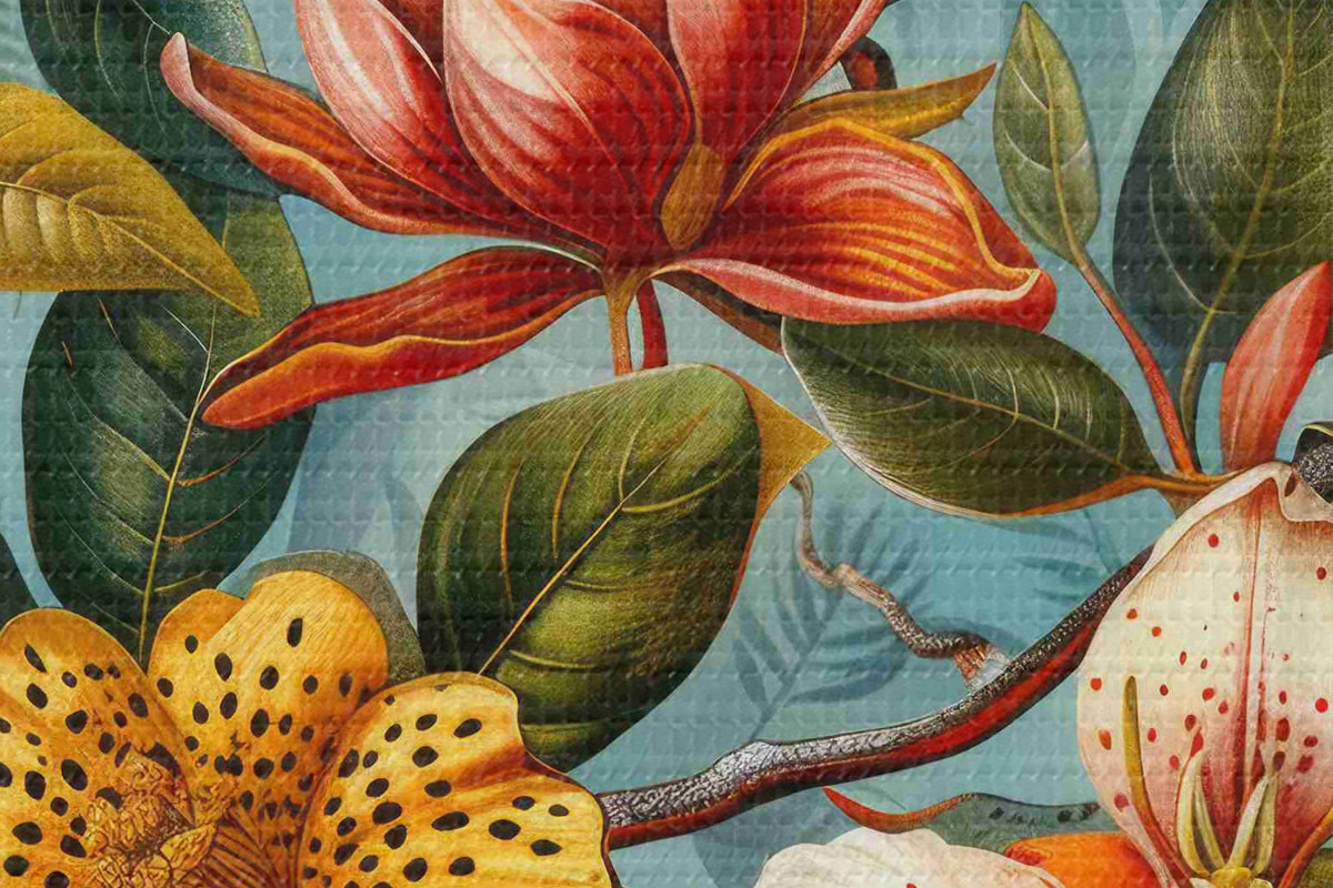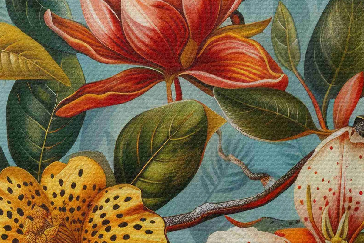 Attēls Tropu kompozīcija ar dažādiem zaļumiem un tropu ziediem uz zila fona Nr r40665