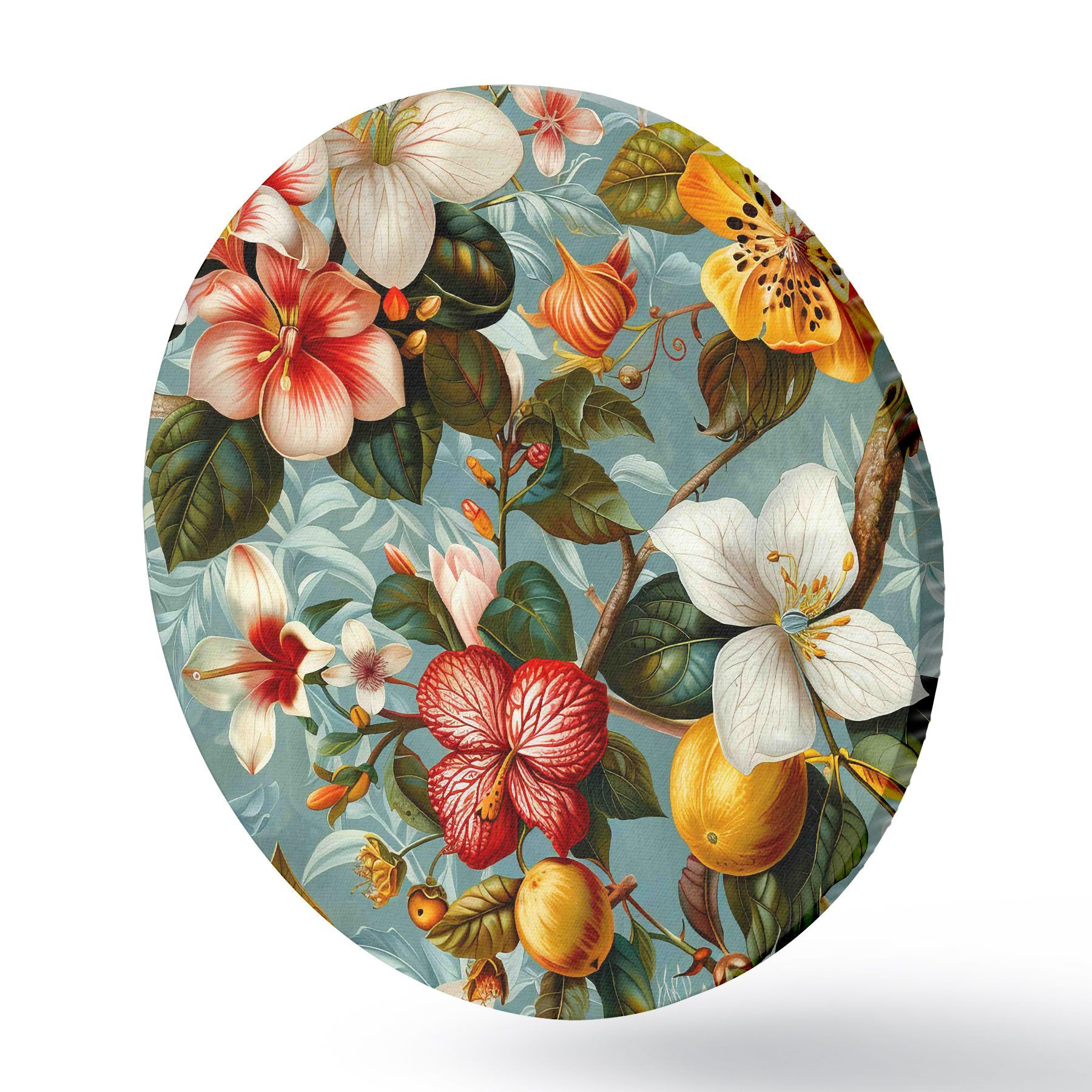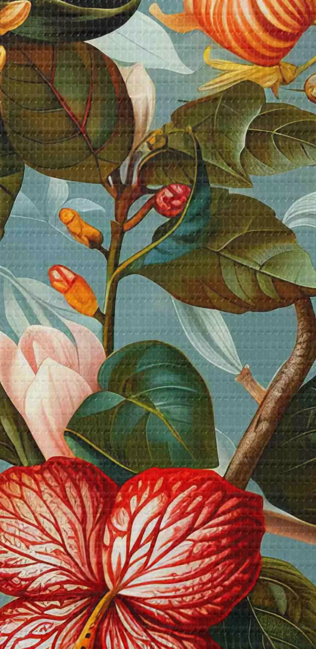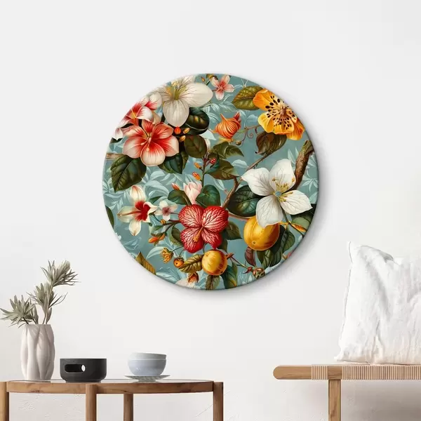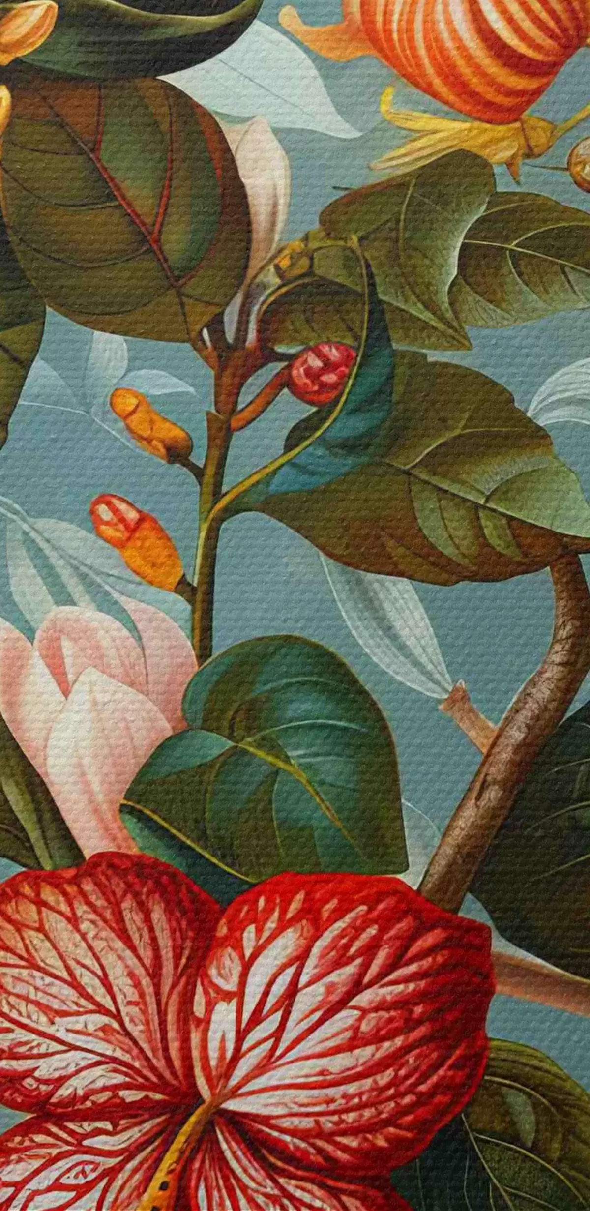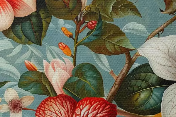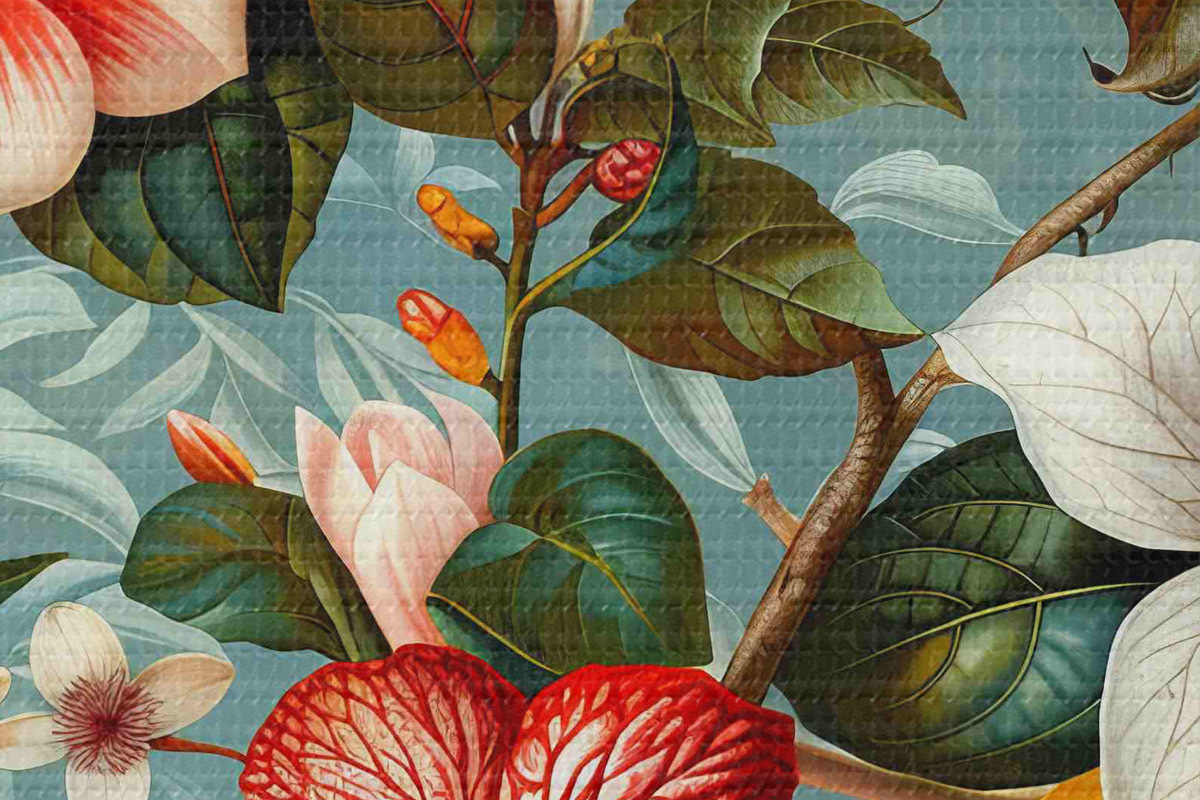 Attēls Kompozīcija ar dažādiem zaļumiem un tropu ziediem uz zila fona Nr r40668