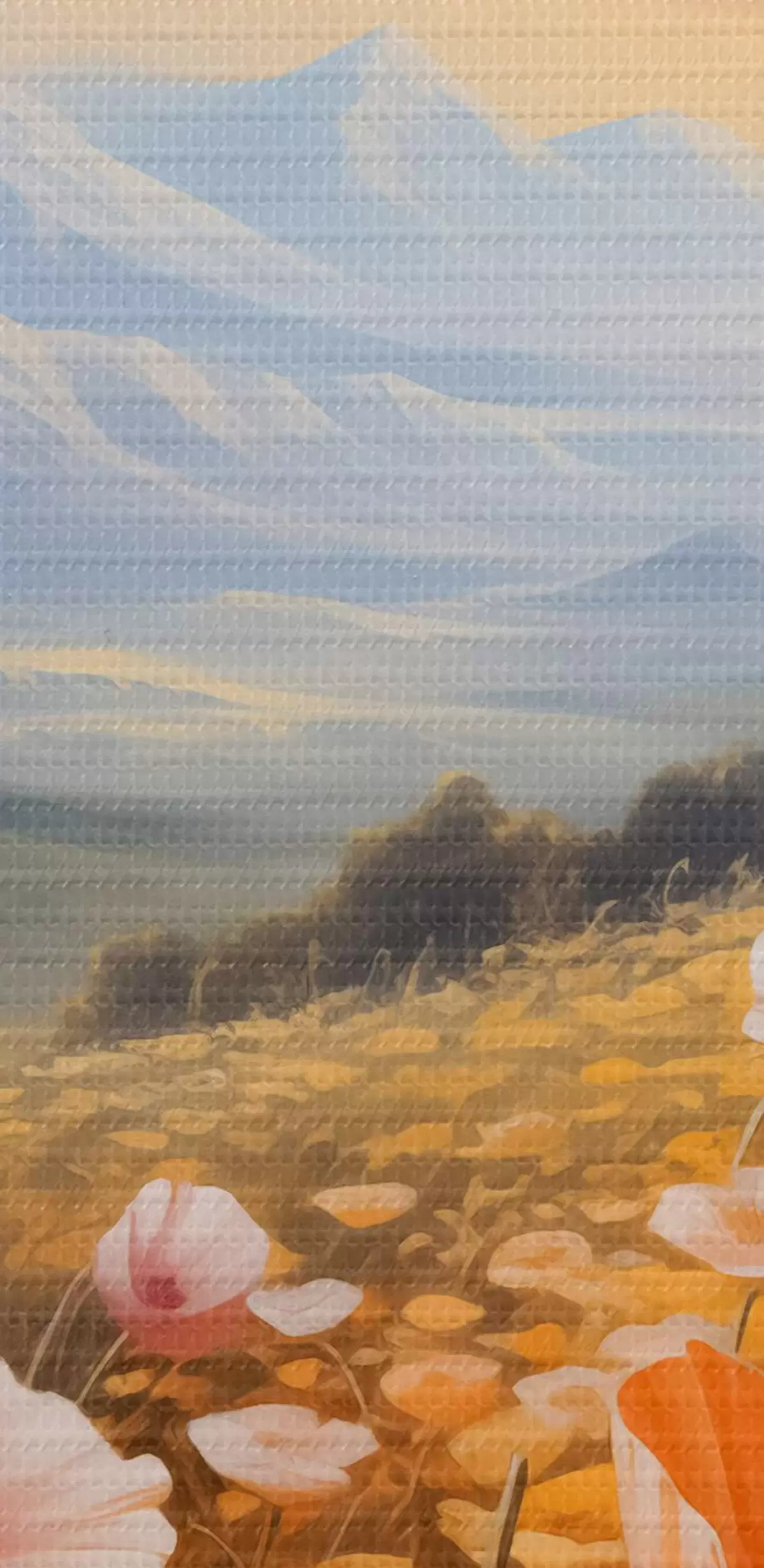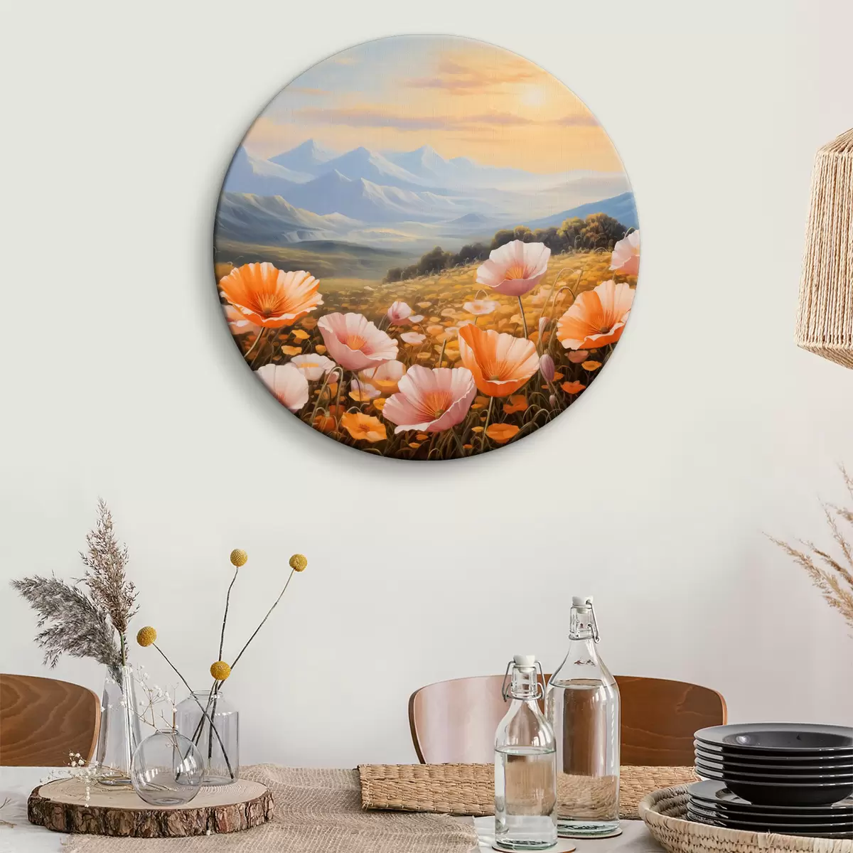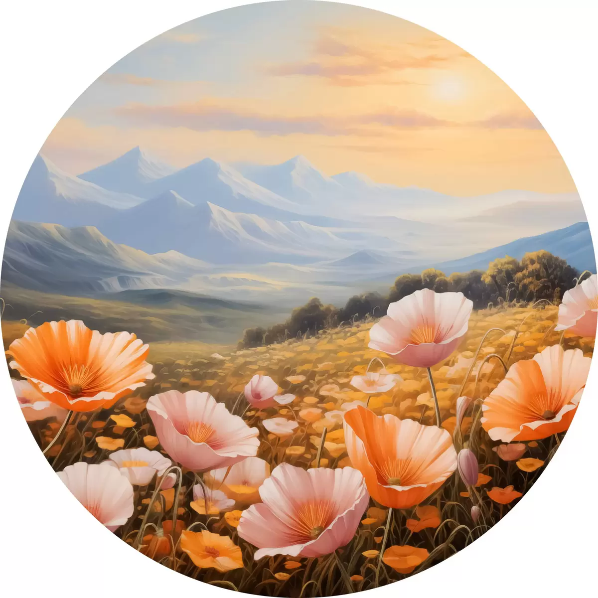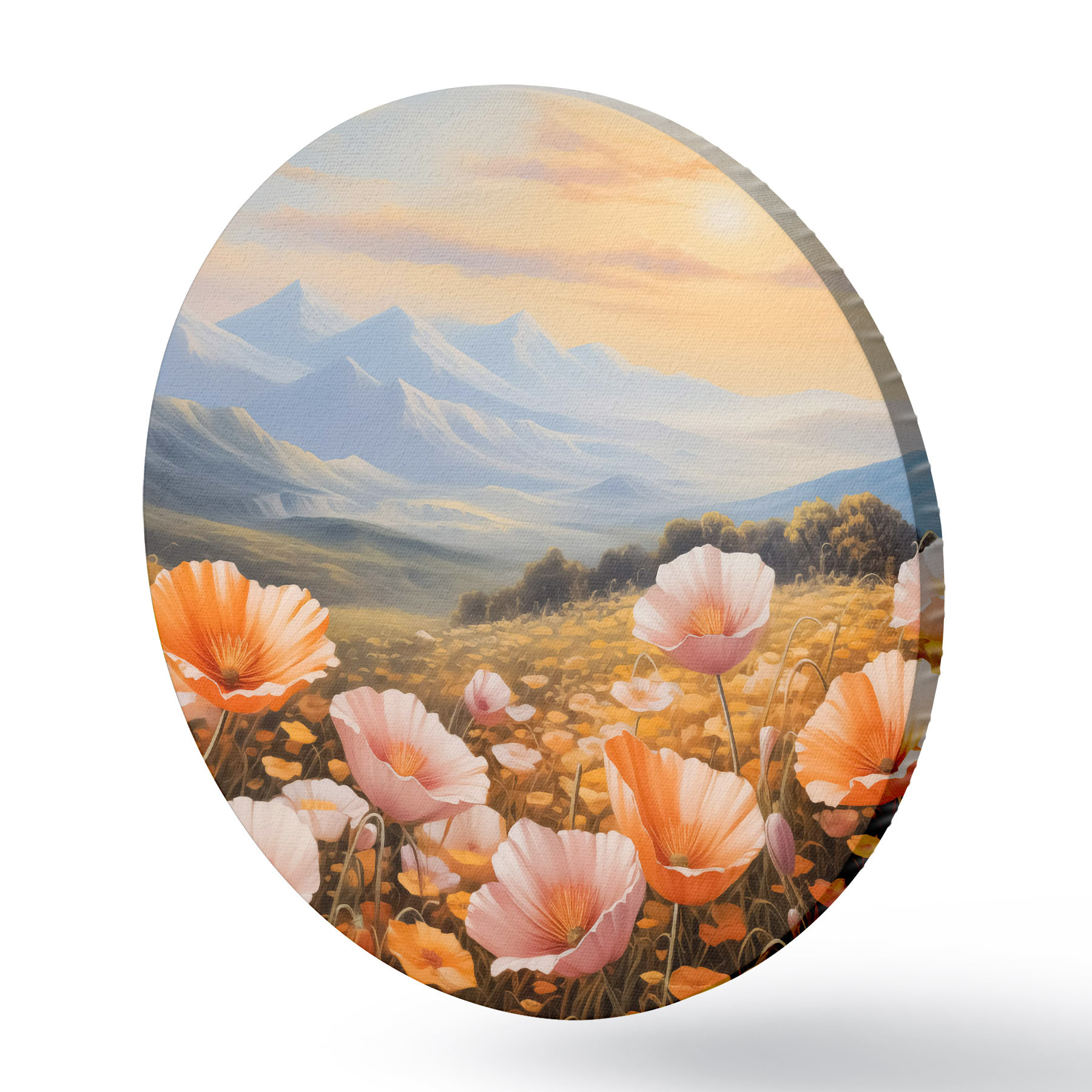 Apaļas gleznas Magoņu lauks rītausmā ar kalniem fonā r40730