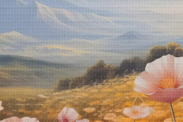 Apaļas gleznas Magoņu lauks rītausmā ar kalniem fonā r40730