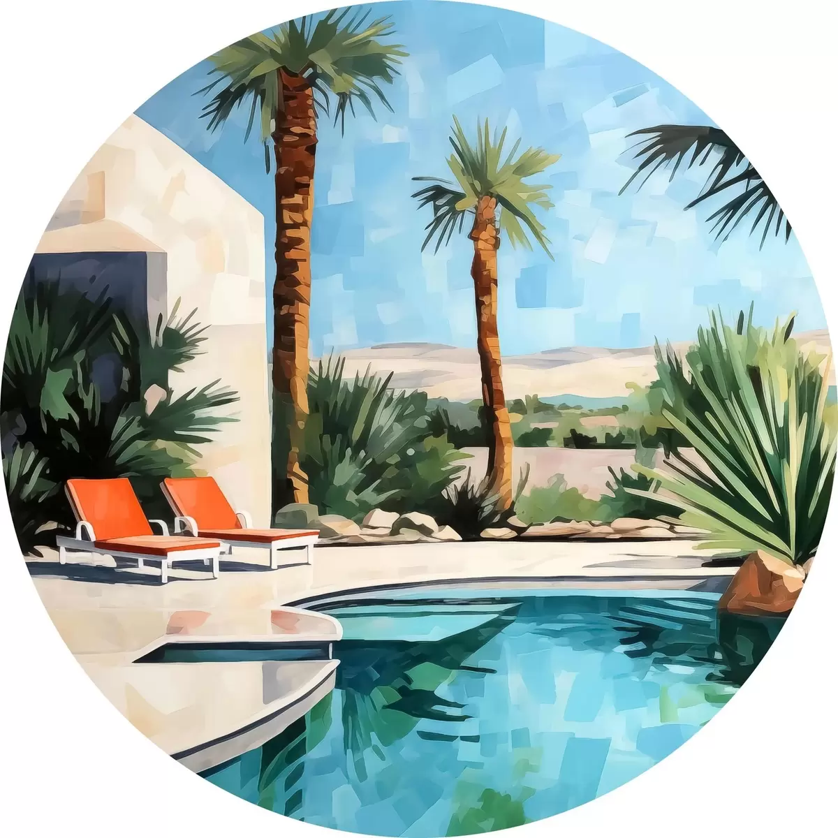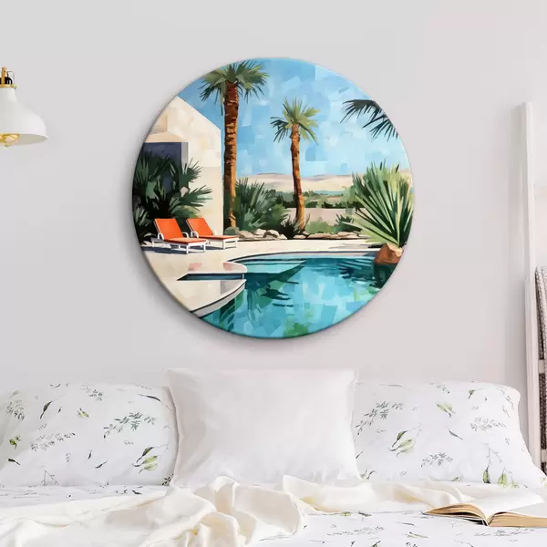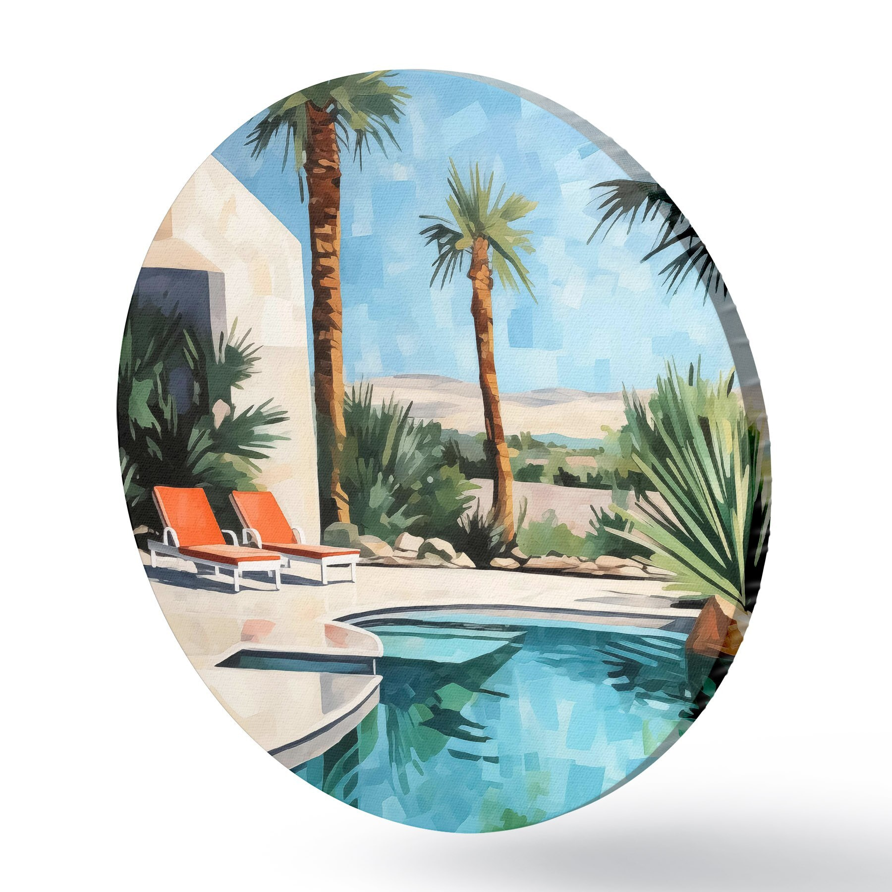 Apaļas gleznas Palmas pie viesnīcas ar baseinu pie klintīm, zilā, zaļā, sarkanā krāsā r40748
