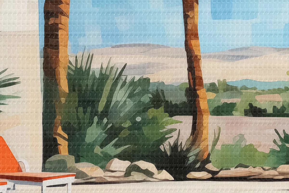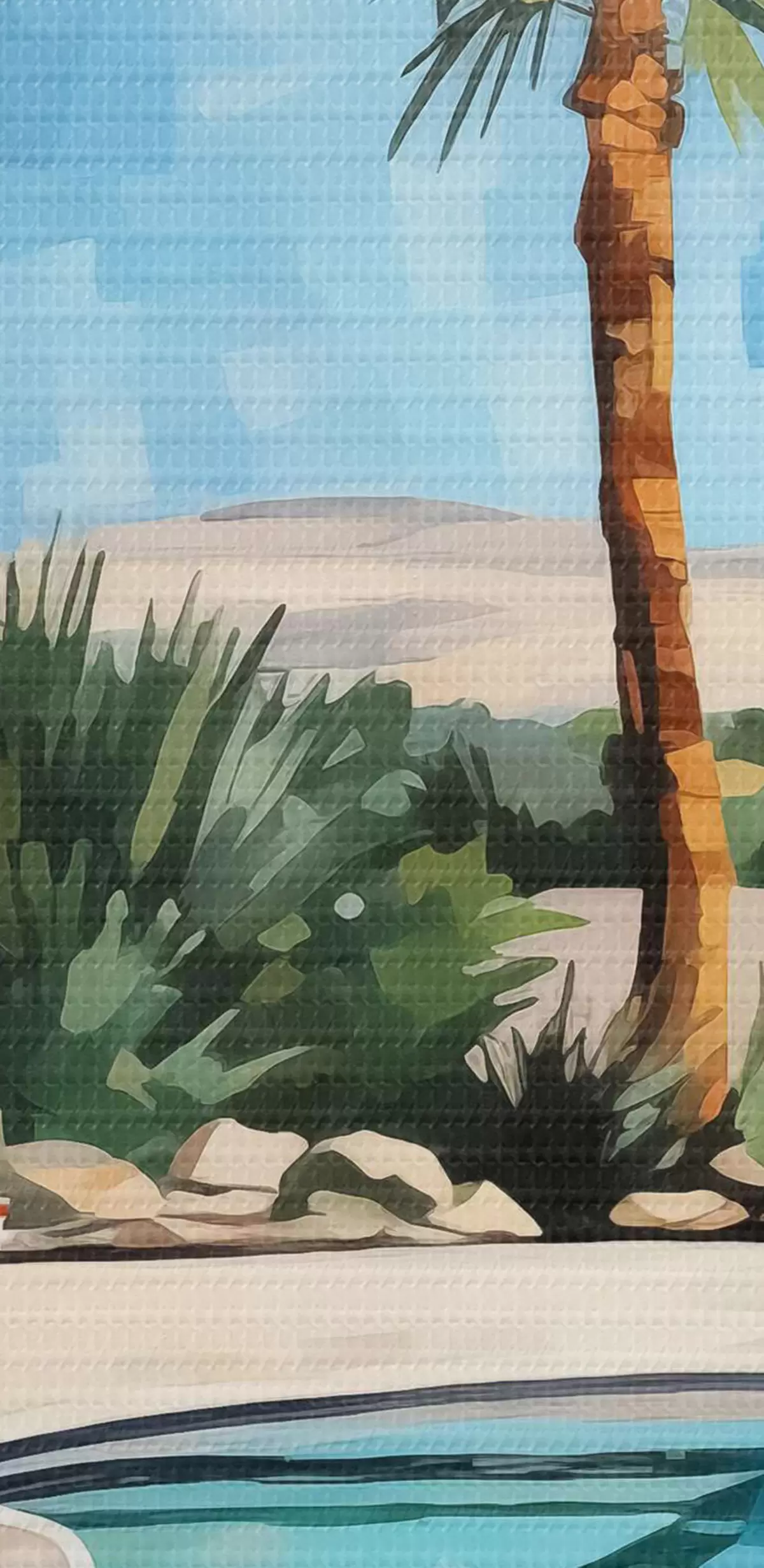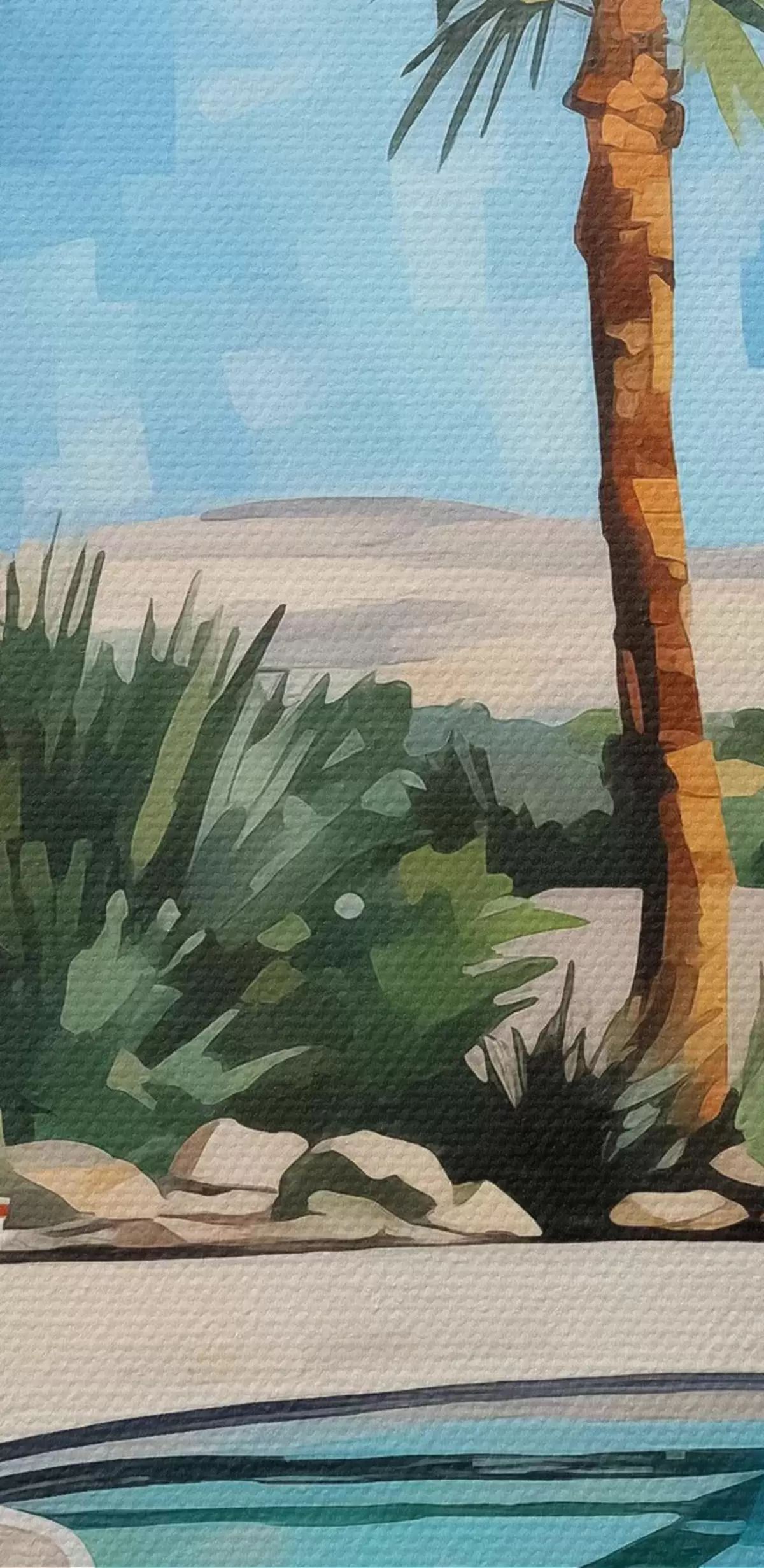 Attēls Palmas pie viesnīcas ar baseinu pie klintīm, zilā, zaļā, sarkanā krāsā Nr r40748