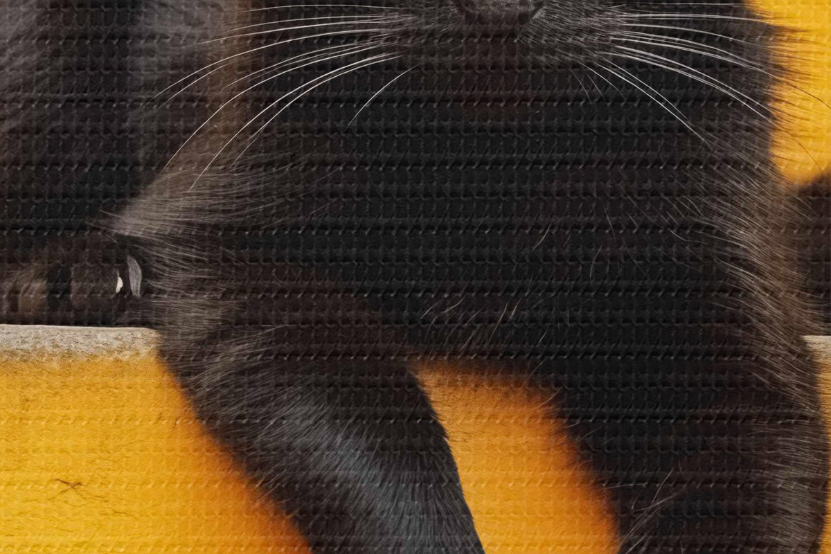 Attēls Uz dzeltenām kāpnēm guļ melns kaķis Nr r40798