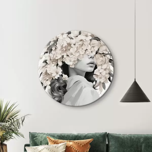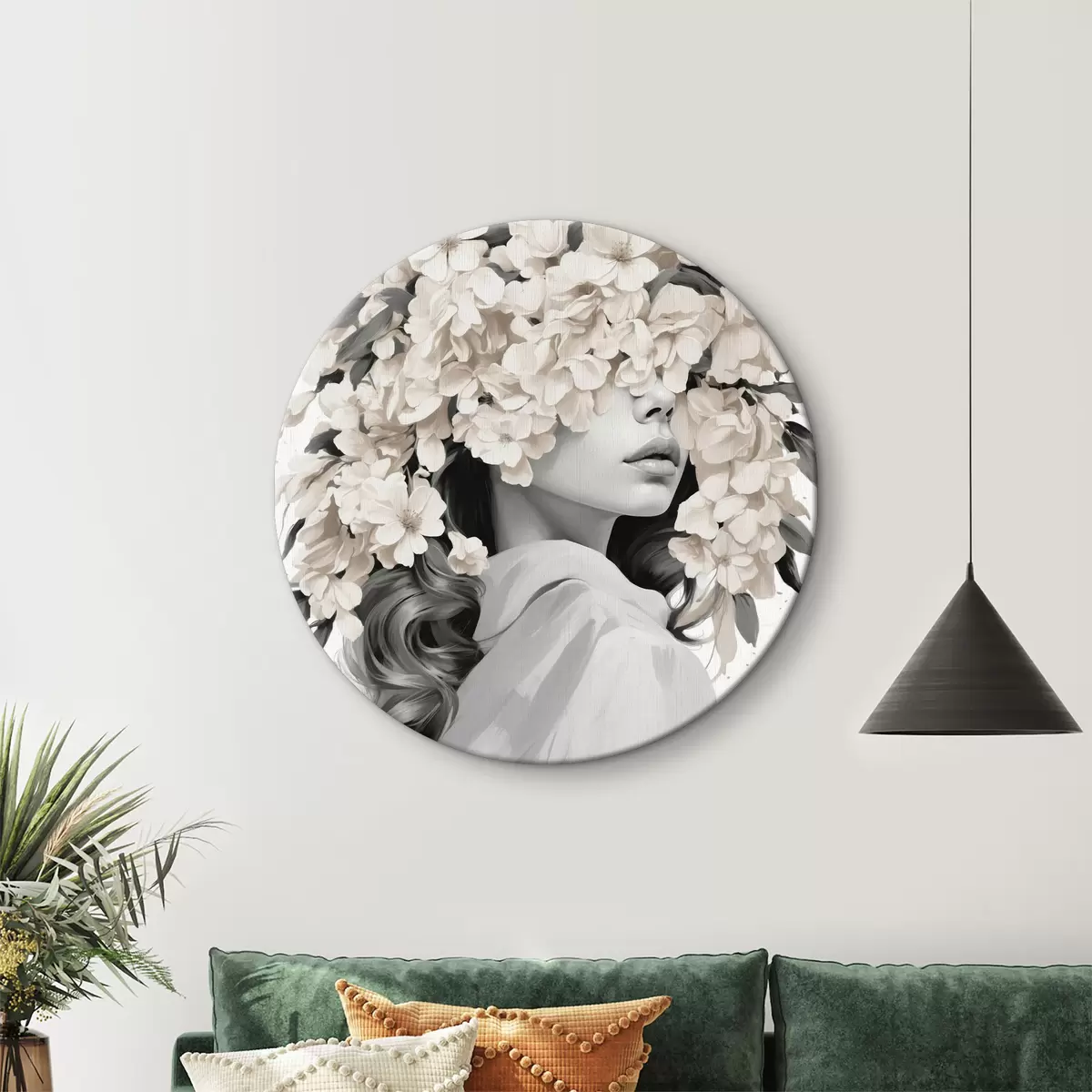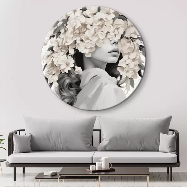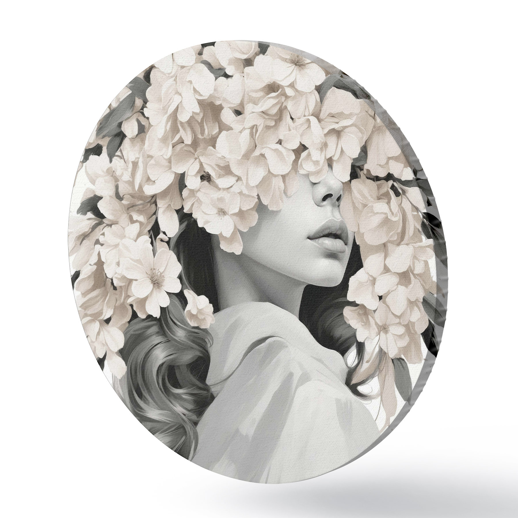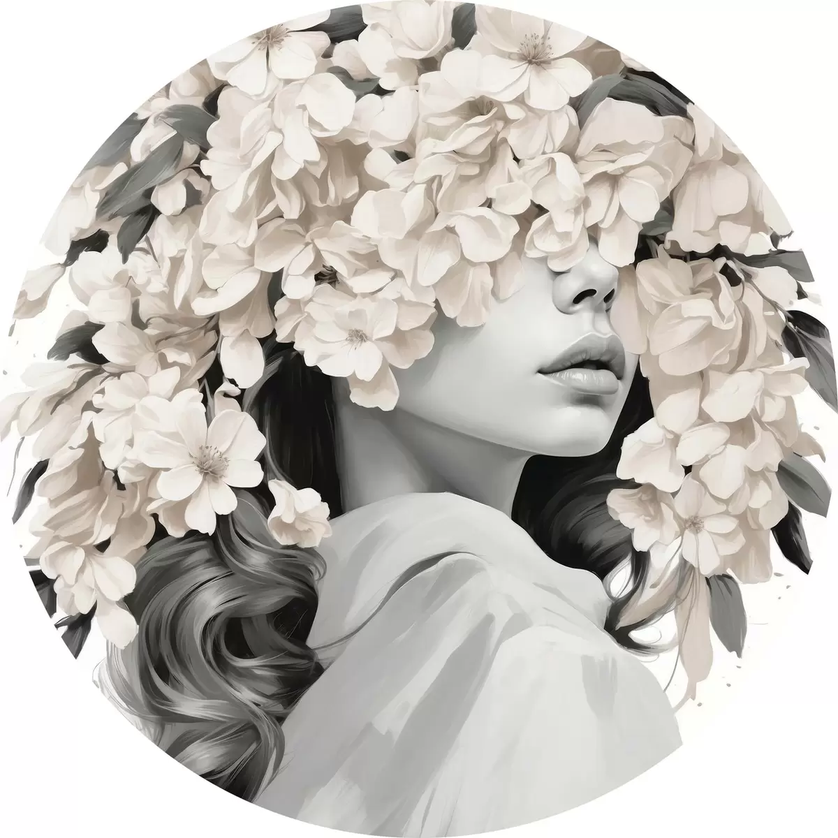 Apaļas gleznas Meitene ar ziediem uz sejas melnā un baltā krāsā r40849