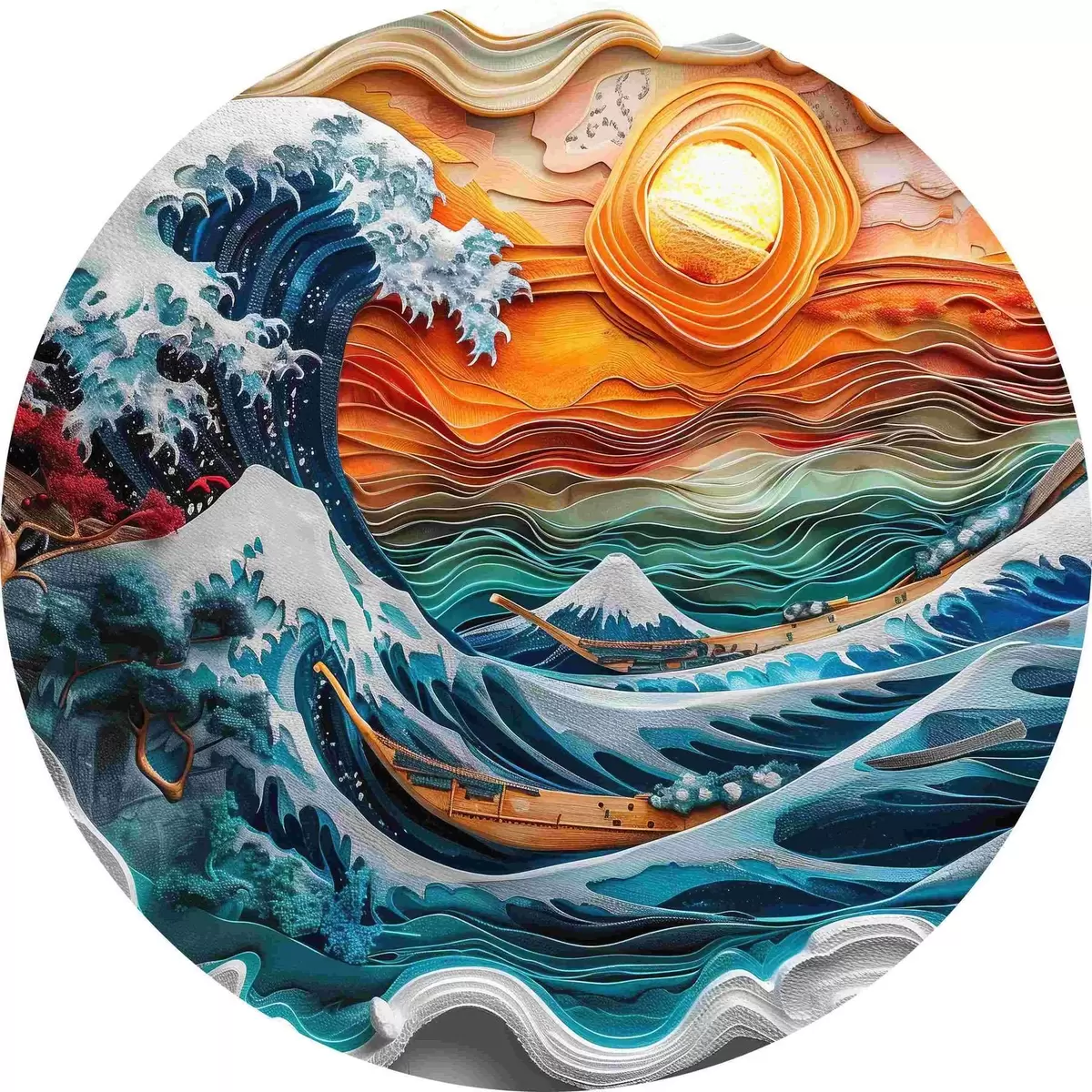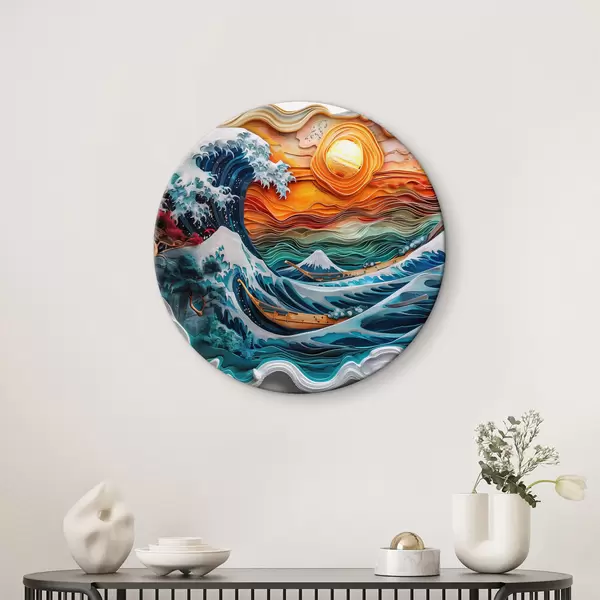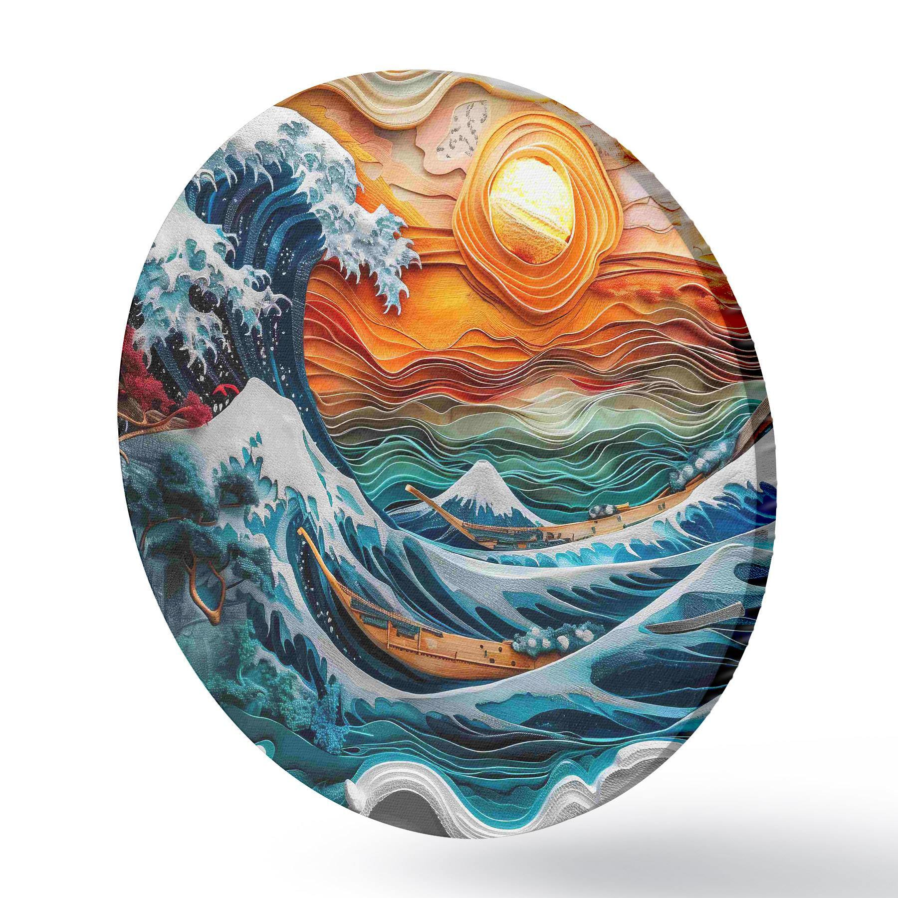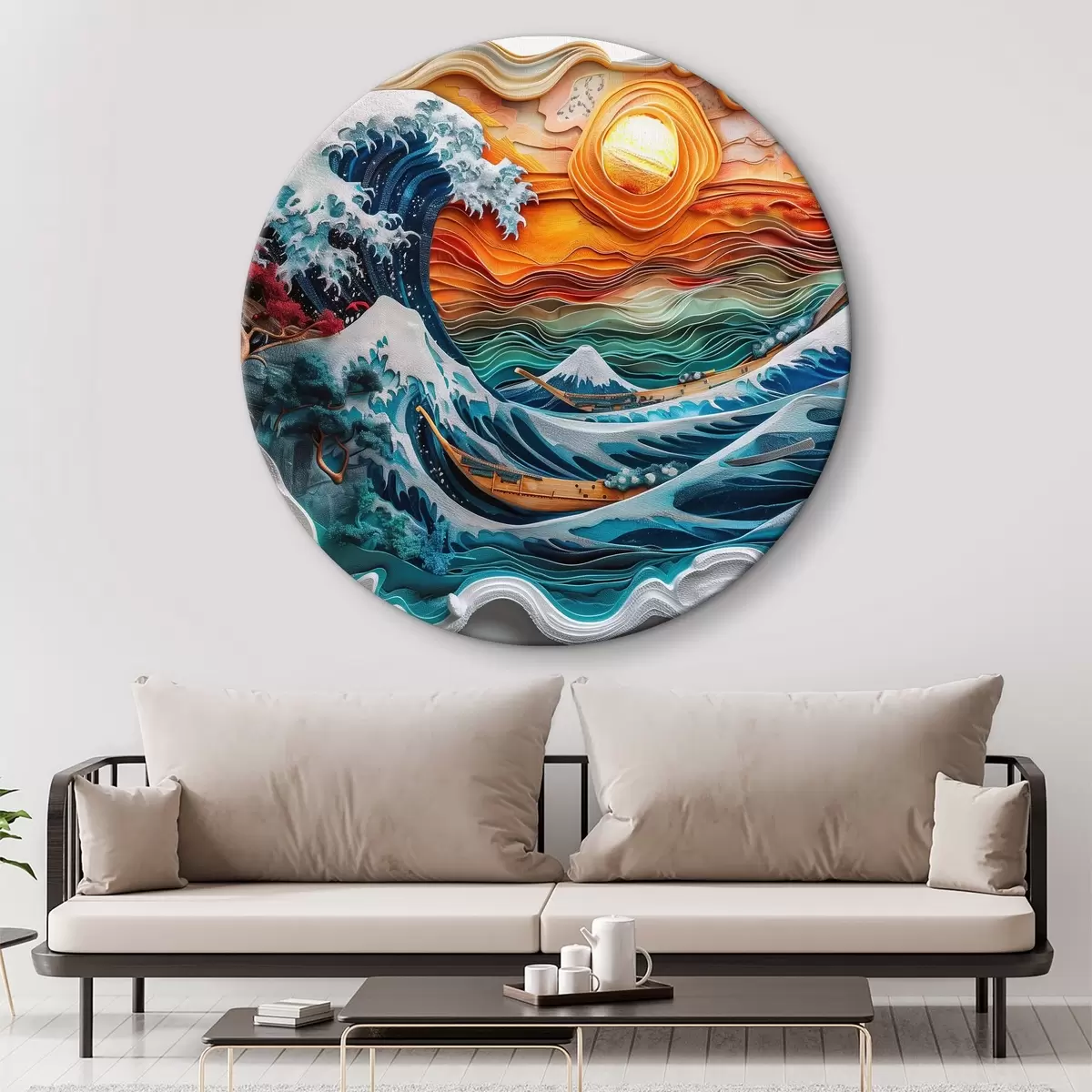 Apaļas gleznas Bazreljefa imitācija: plosošs okeāns ar laivām un sauli r40976