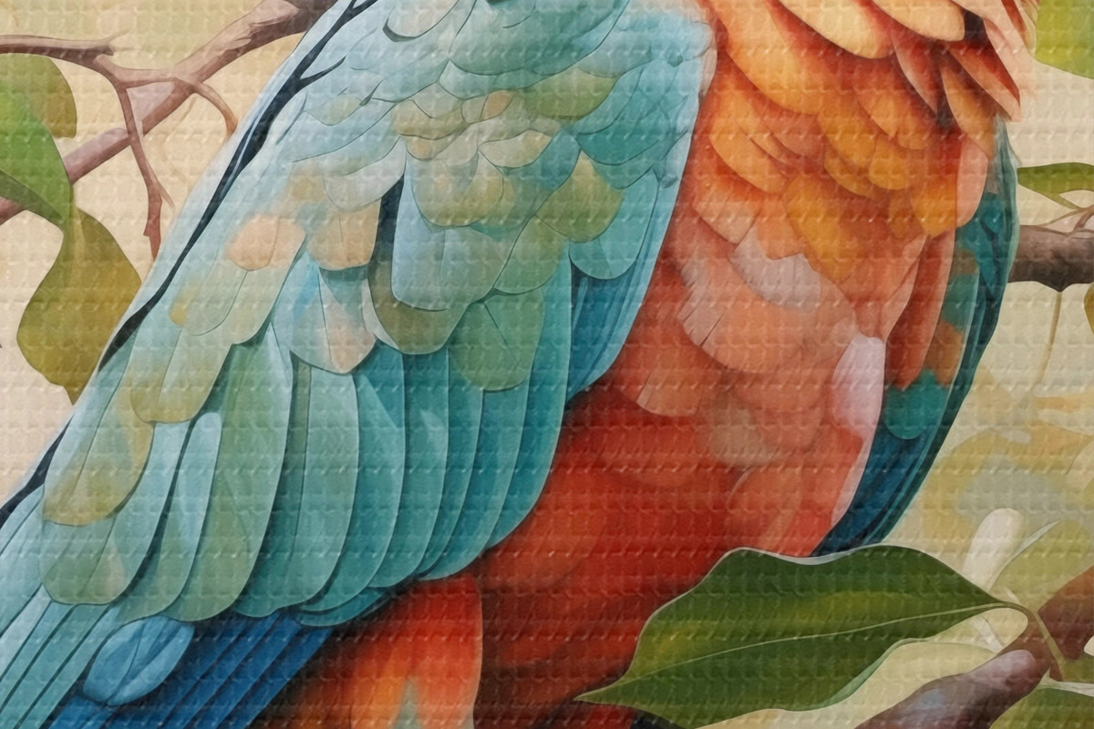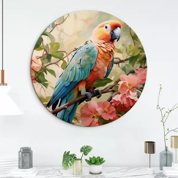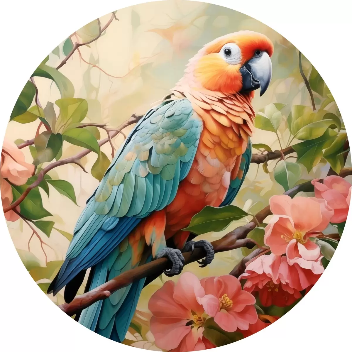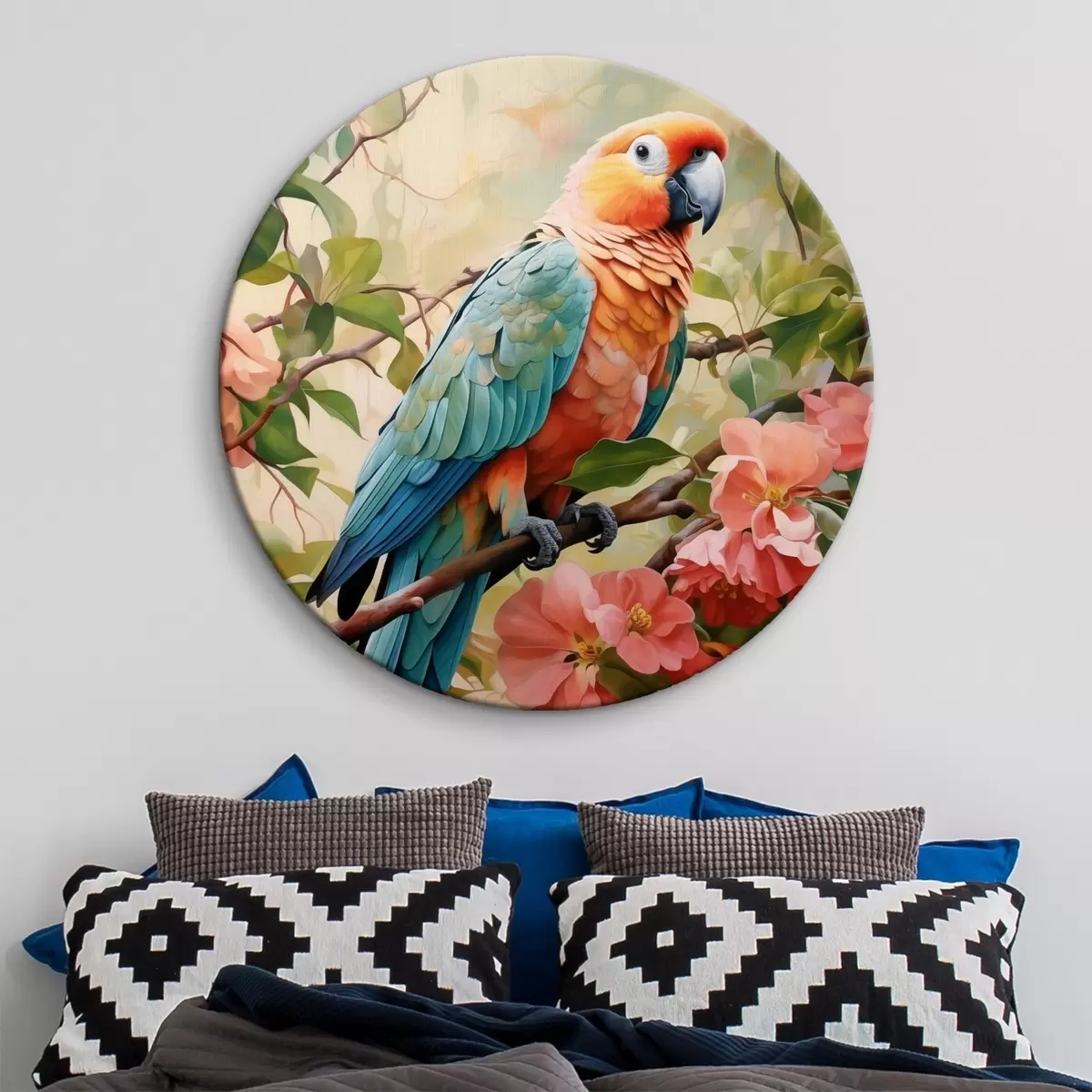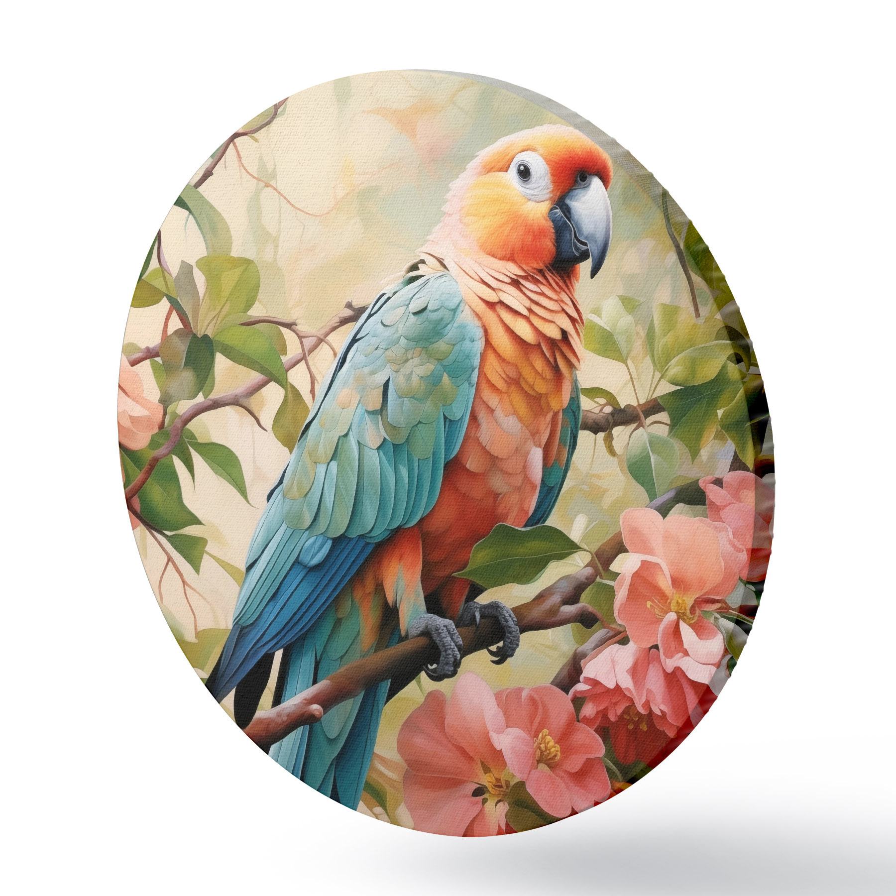Apaļas gleznas Linneja papagailis sēž uz zara ar rozā ziediem r41018