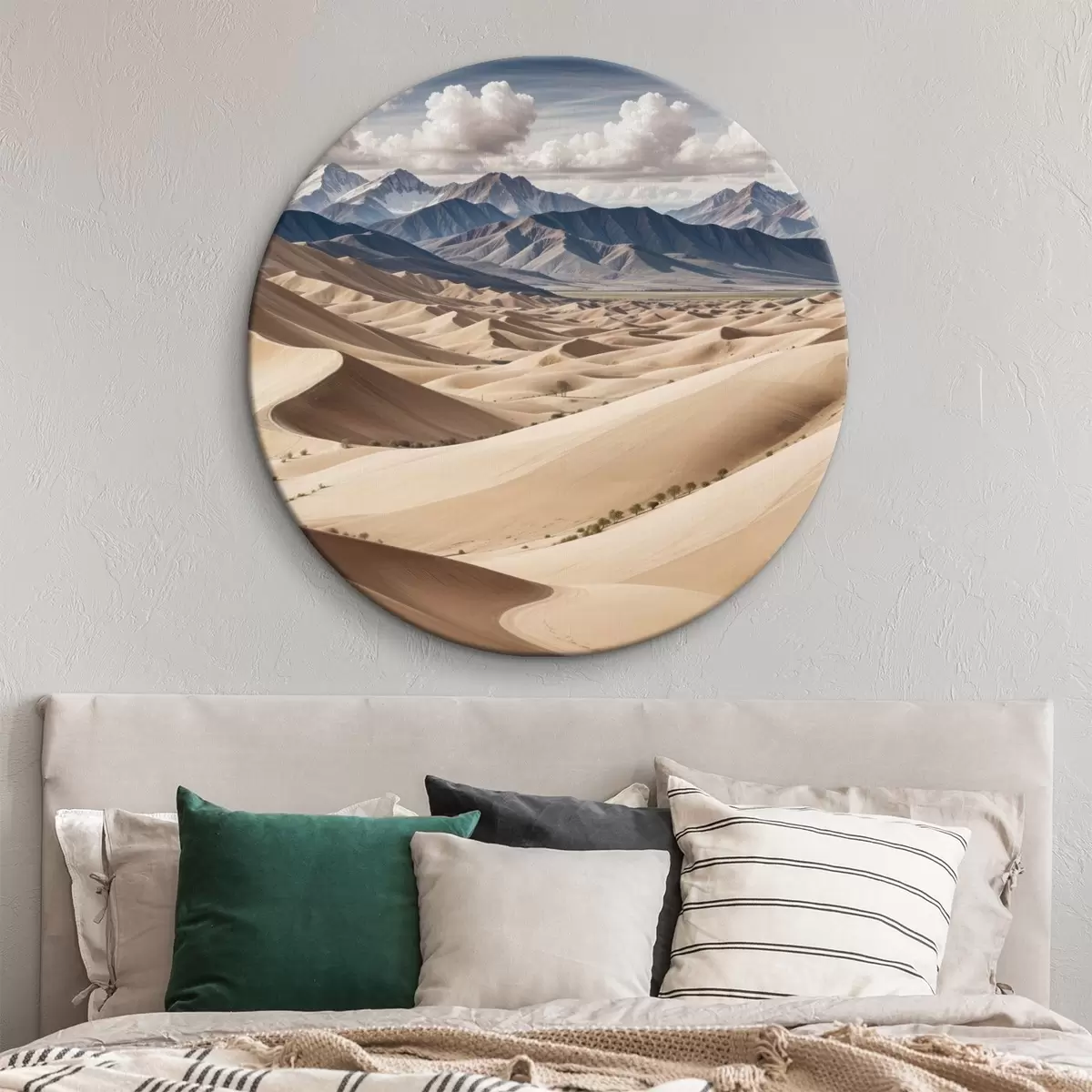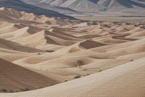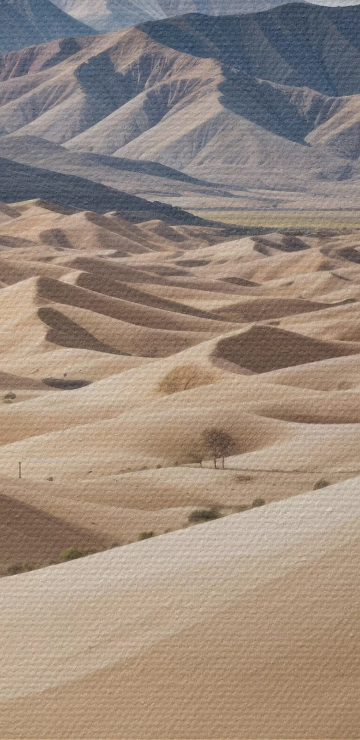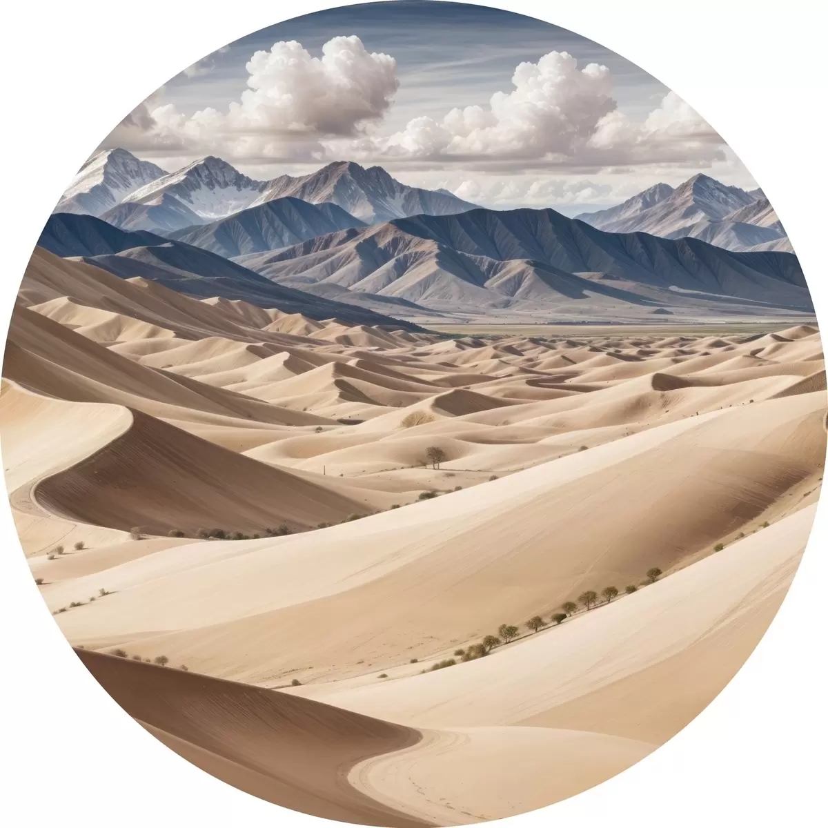 Attēls Plaša tuksneša ainava ar kāpu sēkļiem, nelīdzeniem kalniem tālumā un dramatiskām mākoņainām debesīm Nr r41089