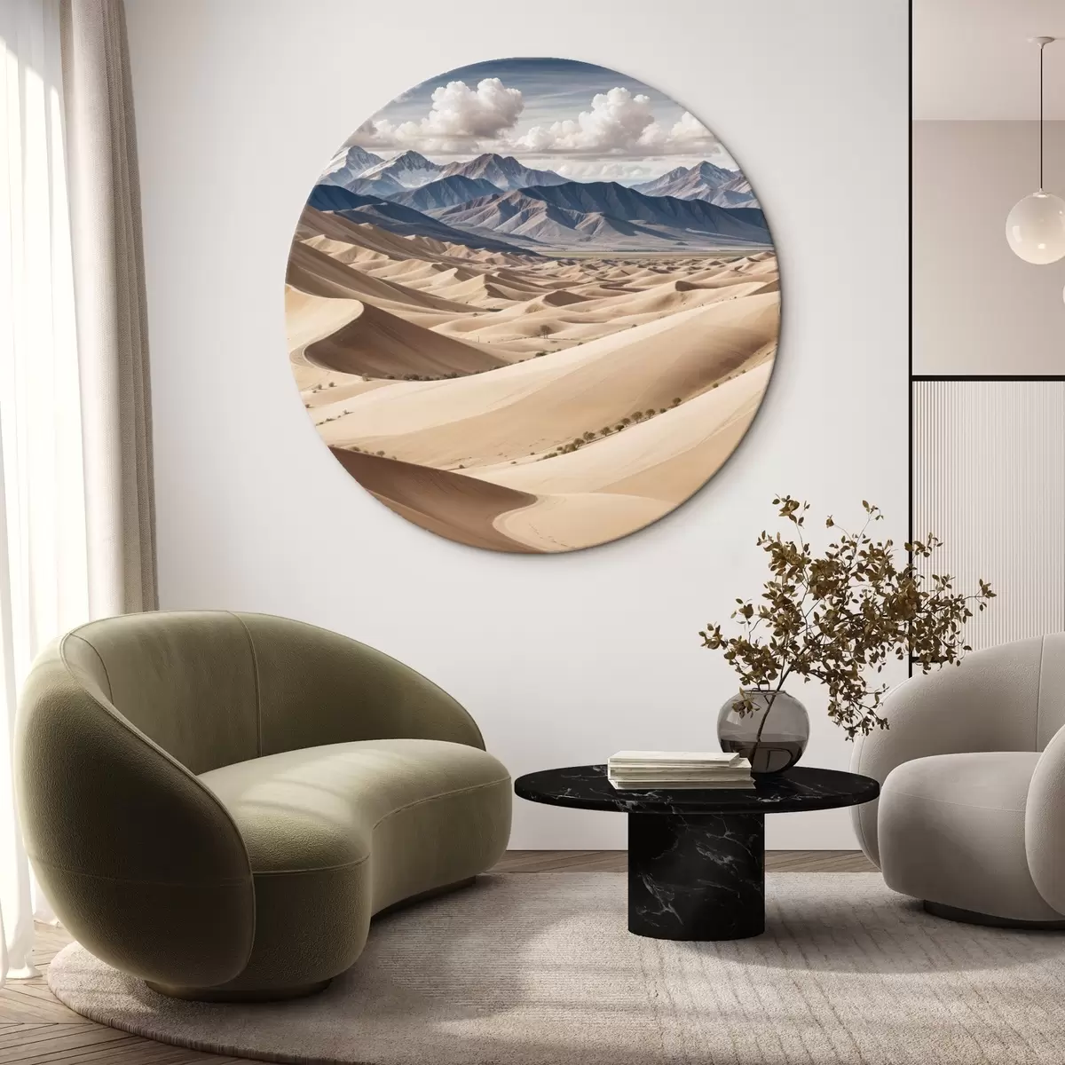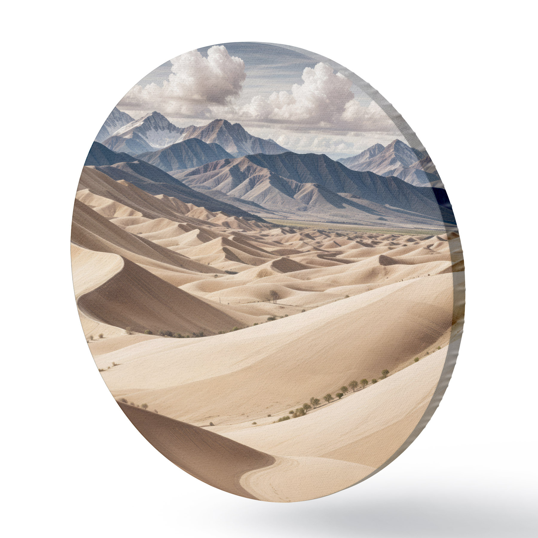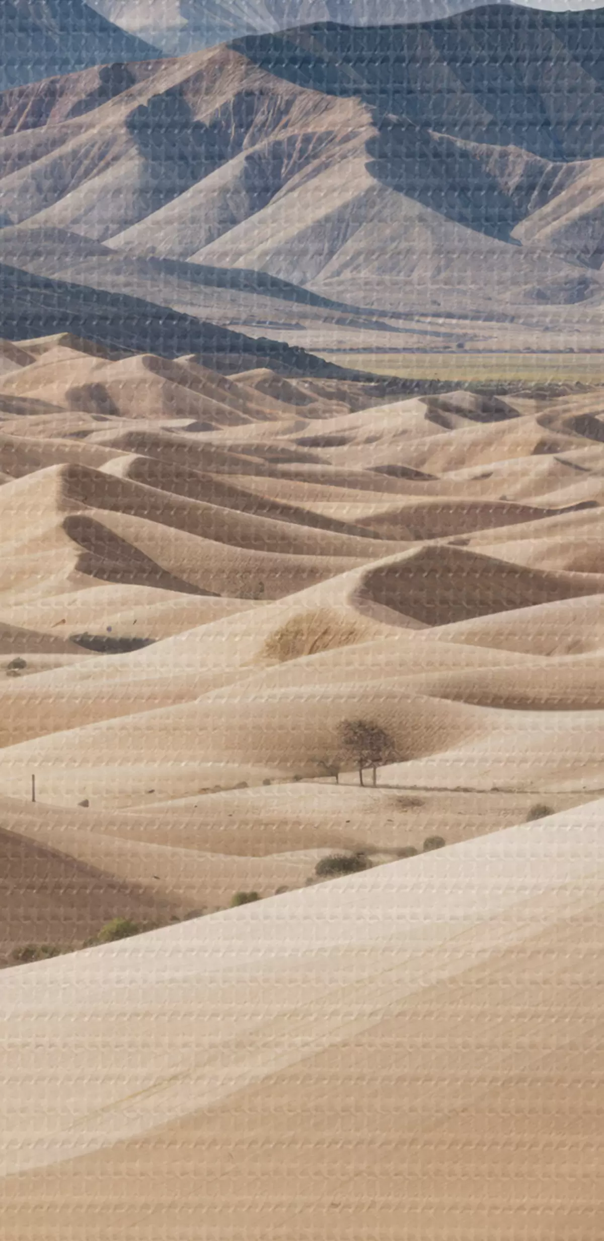 Attēls Plaša tuksneša ainava ar kāpu sēkļiem, nelīdzeniem kalniem tālumā un dramatiskām mākoņainām debesīm Nr r41089