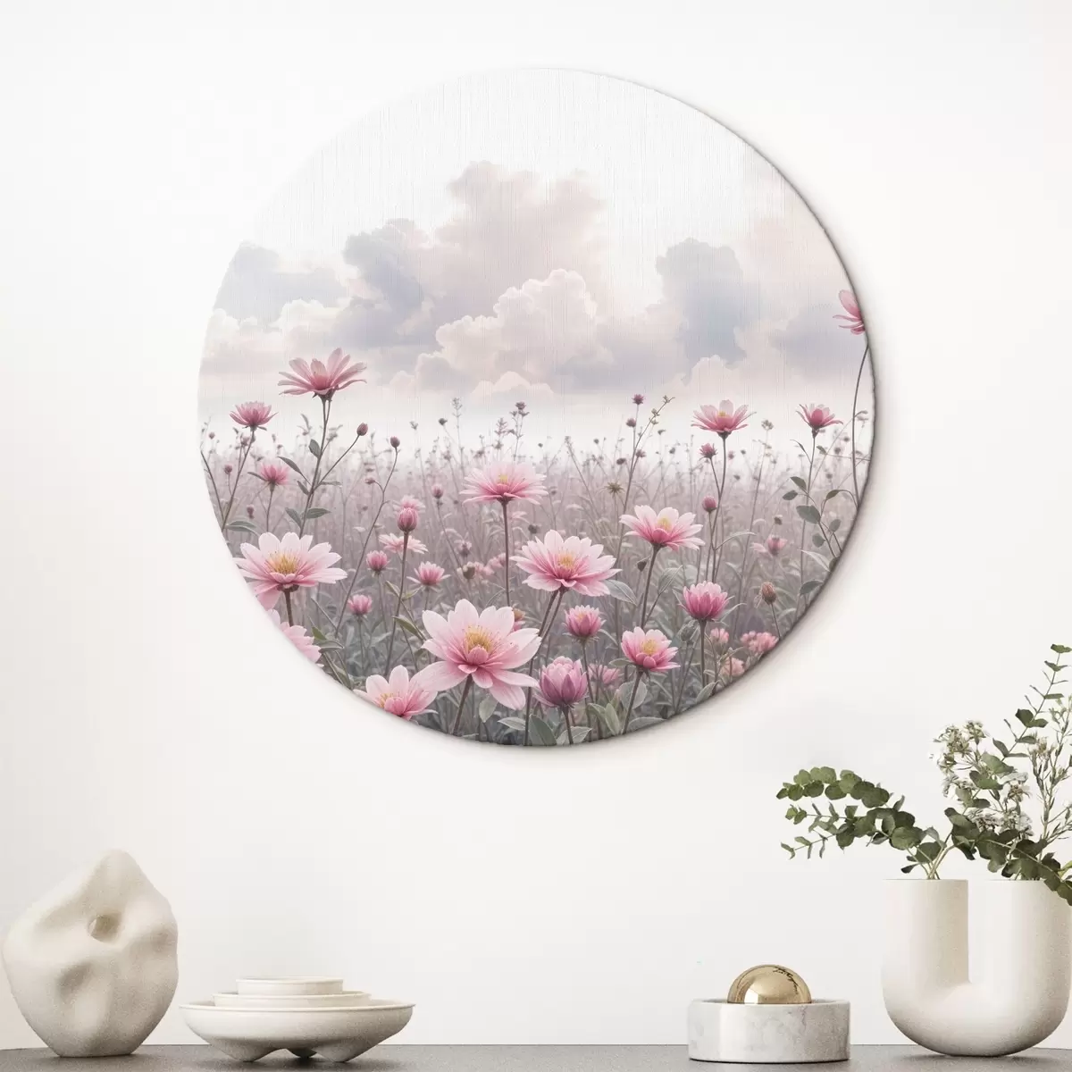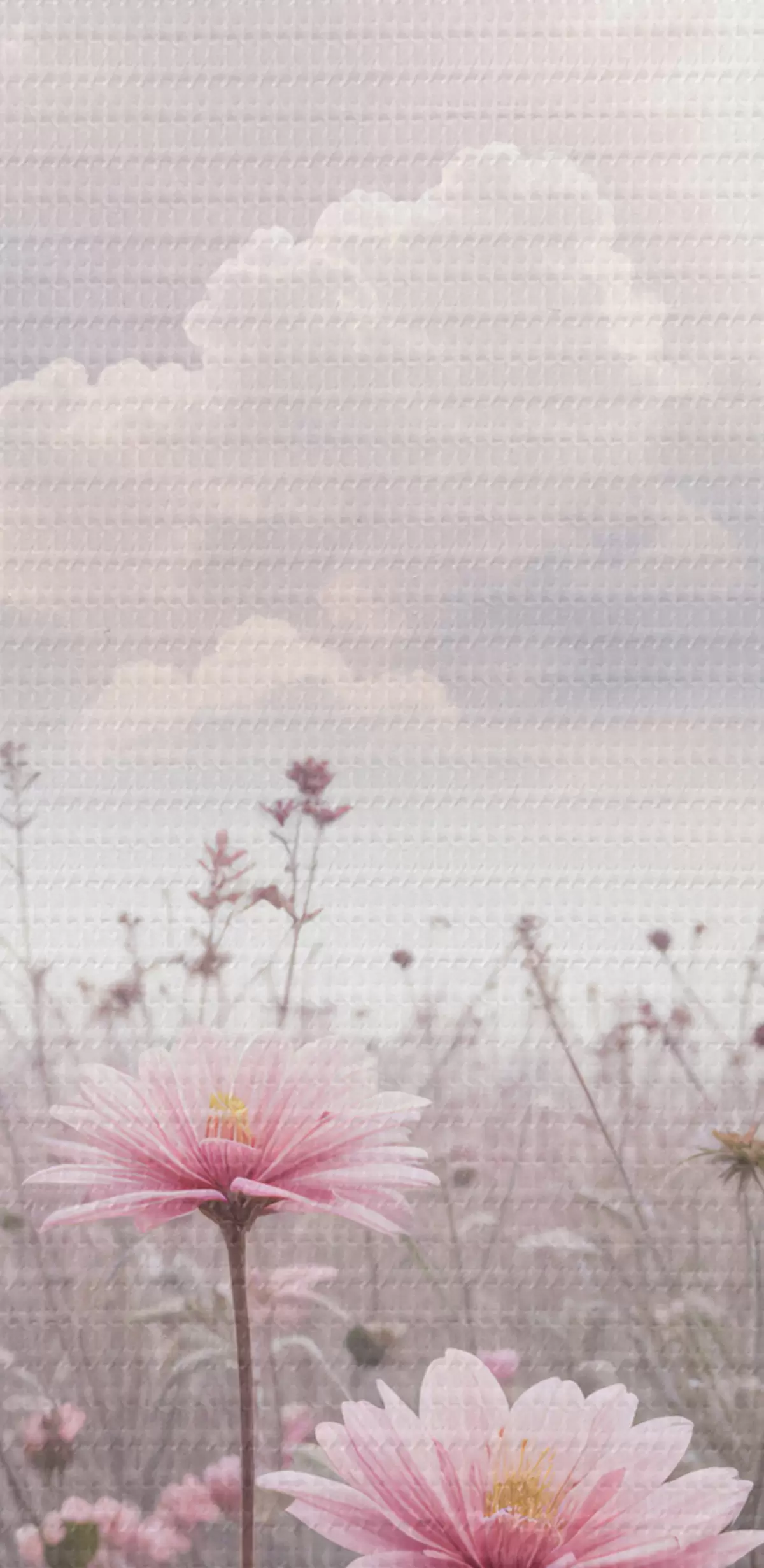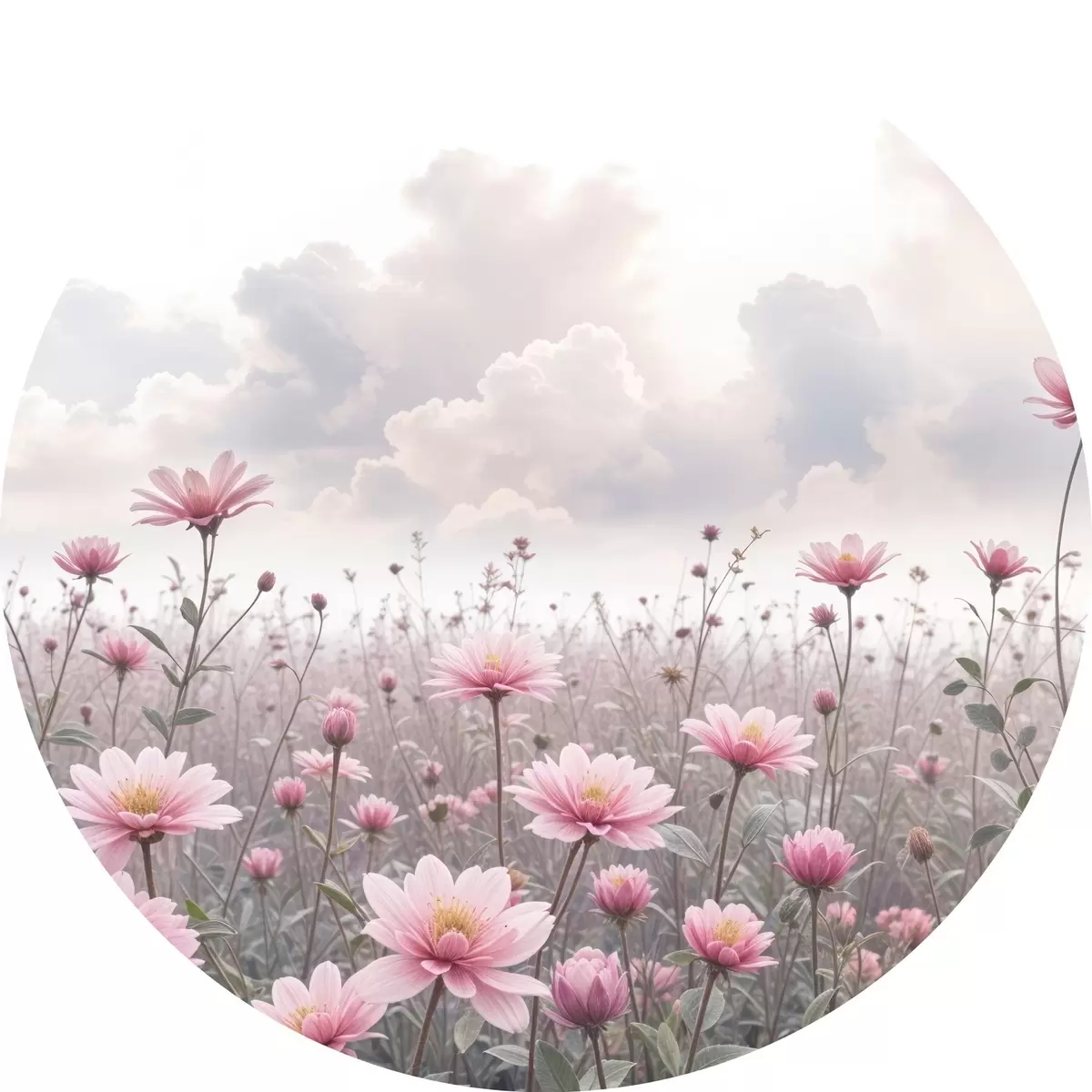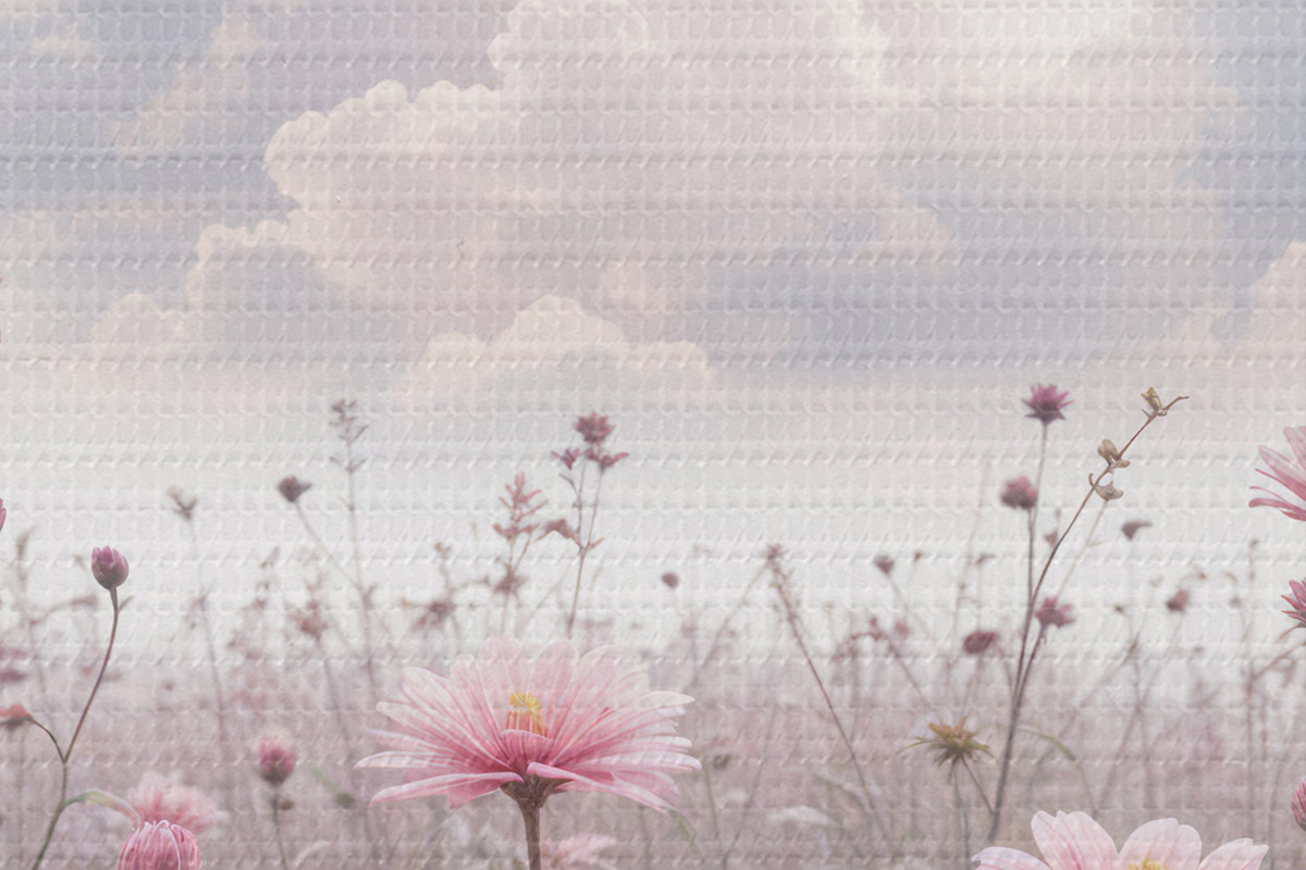 Attēls Rozā margrietiņu ziedu lauks pret mākoņainām debesīm Nr r41102
