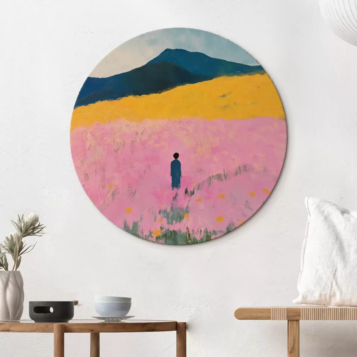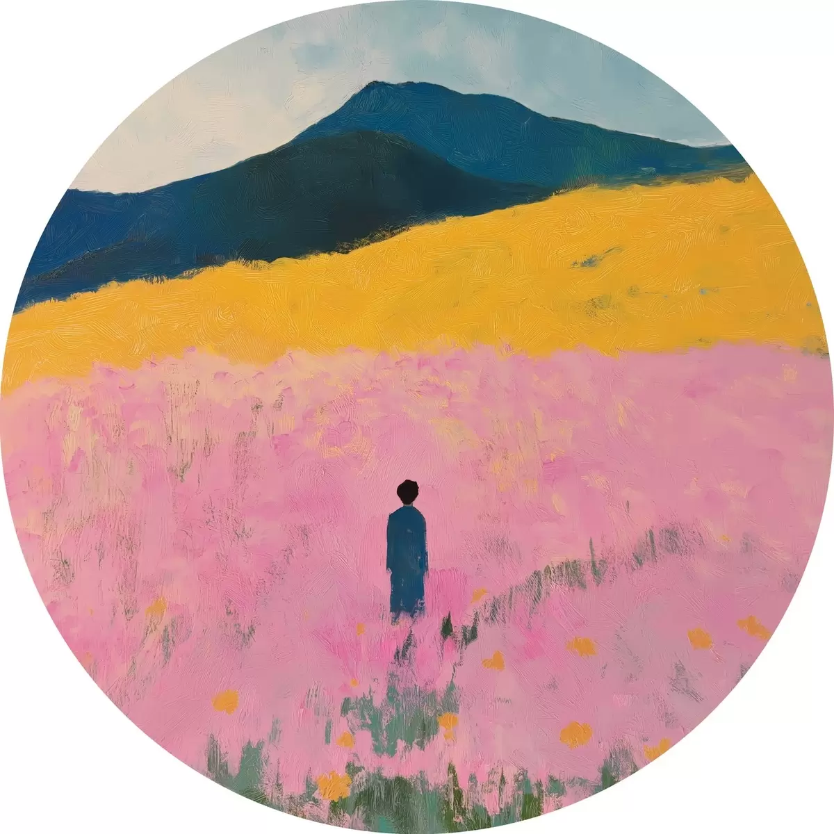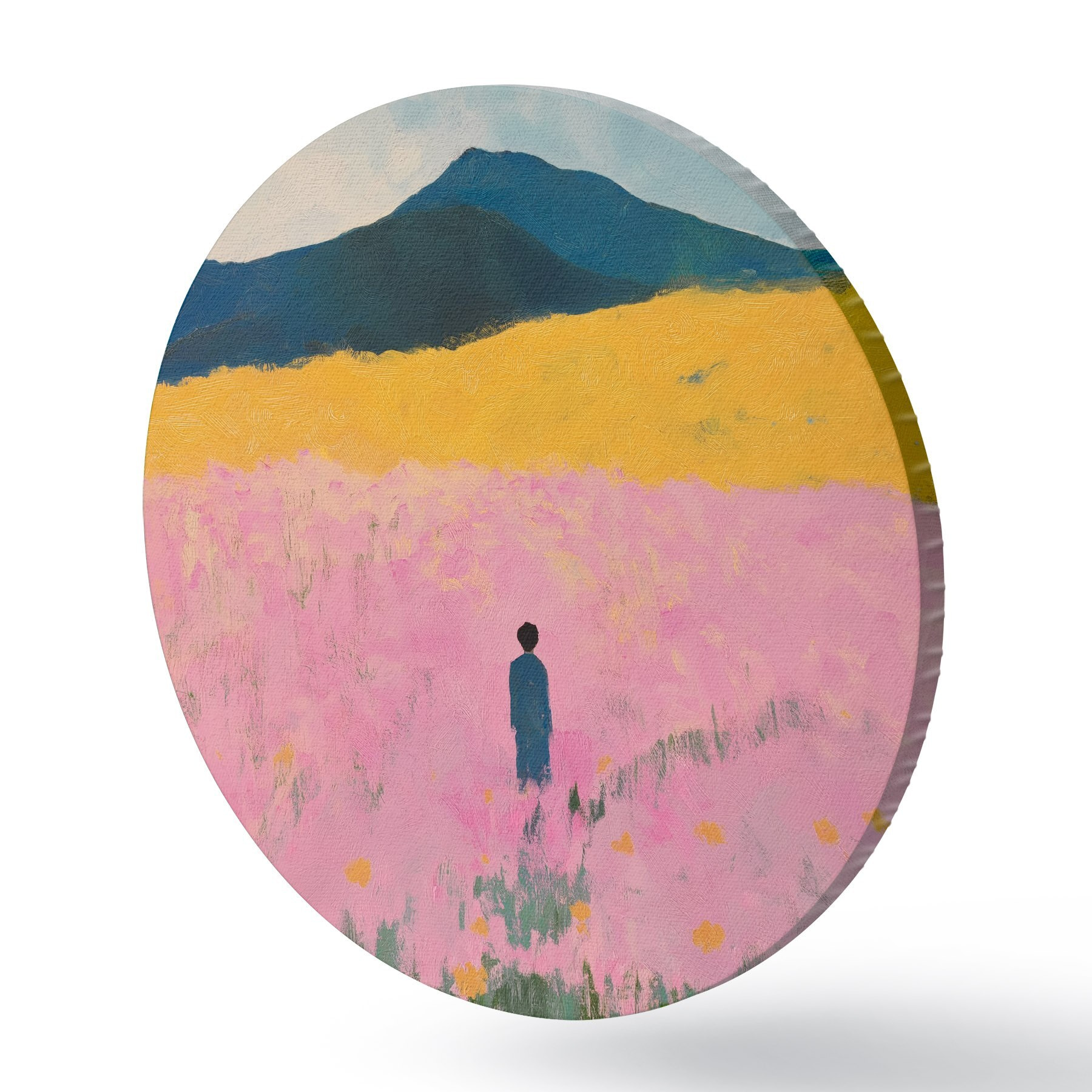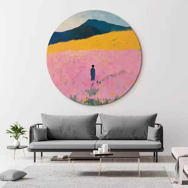 Apaļas gleznas Vīrietis laukā ar rozā ziediem r41164