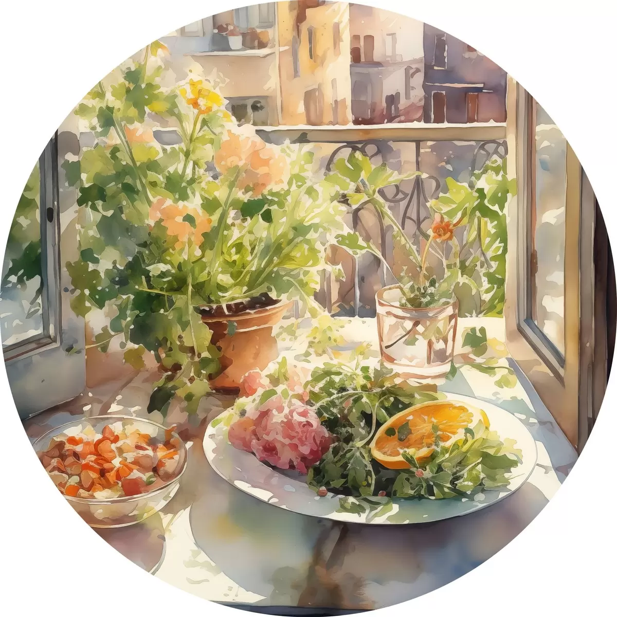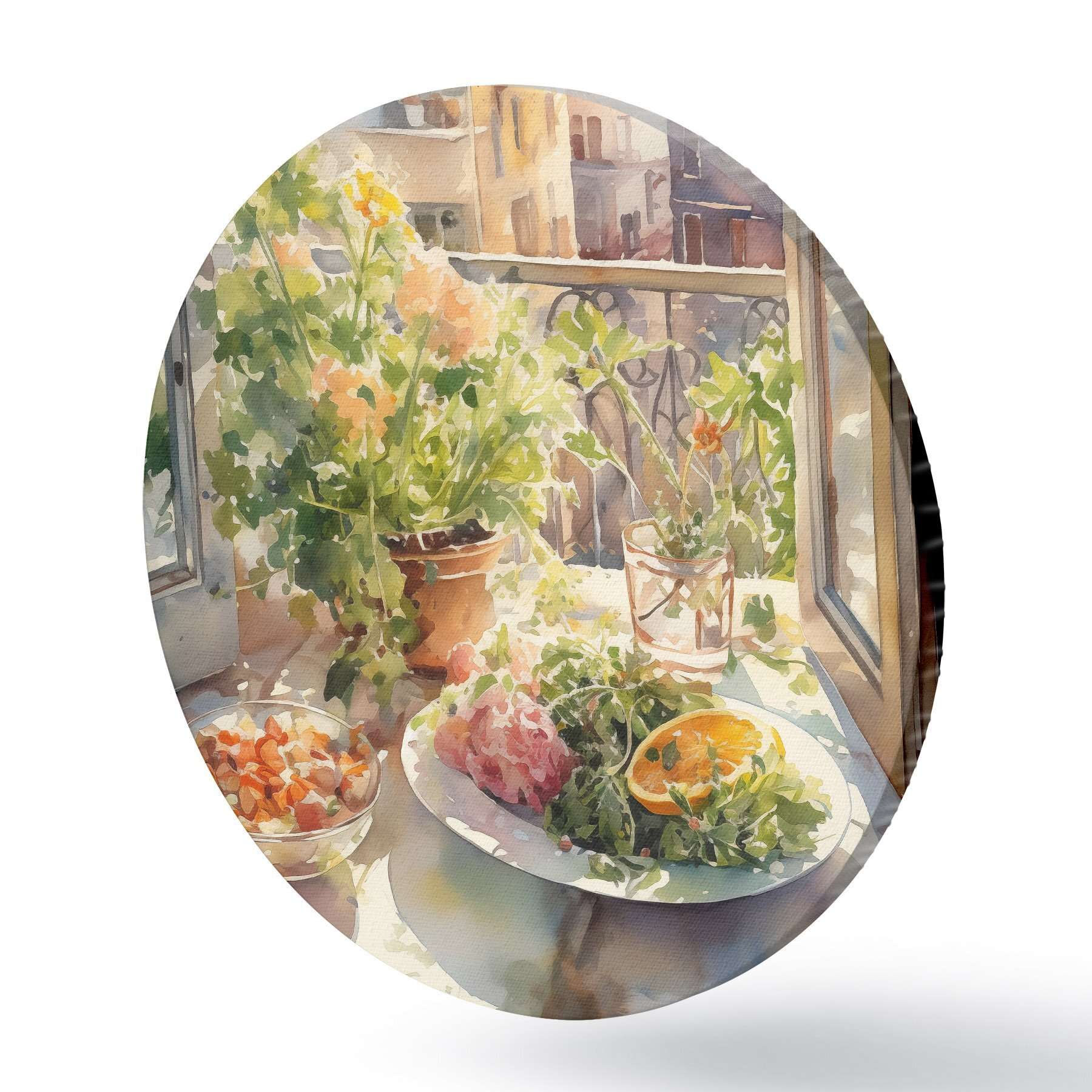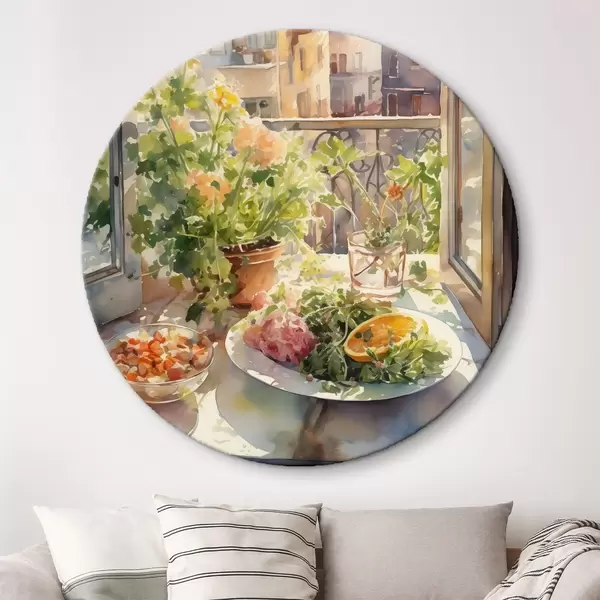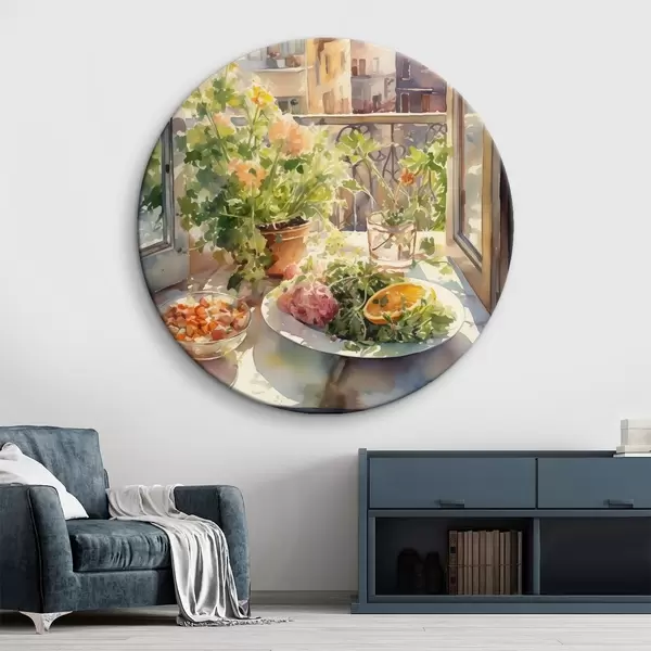 Apaļas gleznas Akvareļu vakariņas, pilsētas skats, ziedi, daba, zaļie salāti r41166