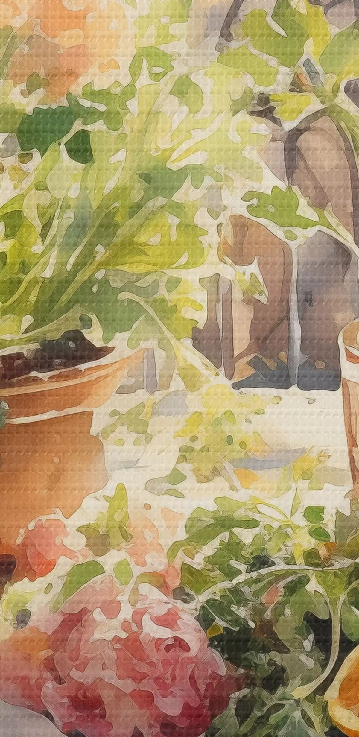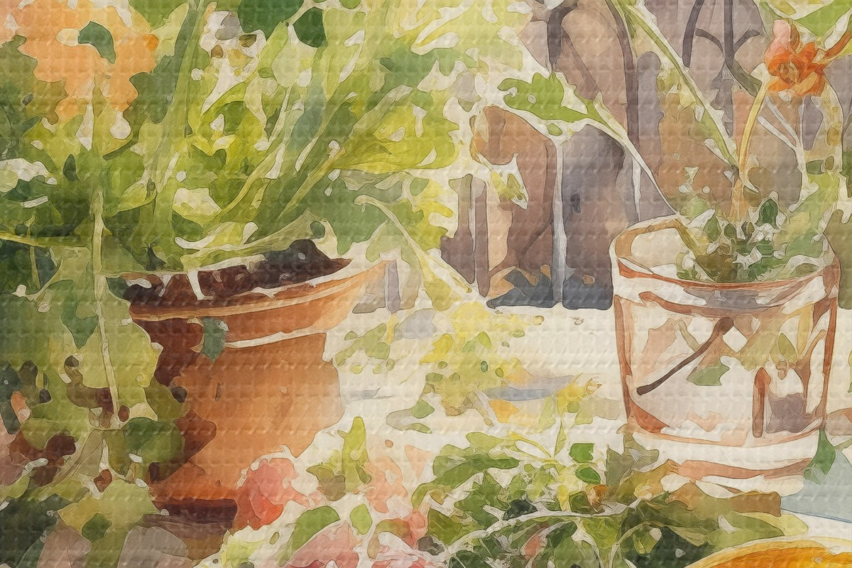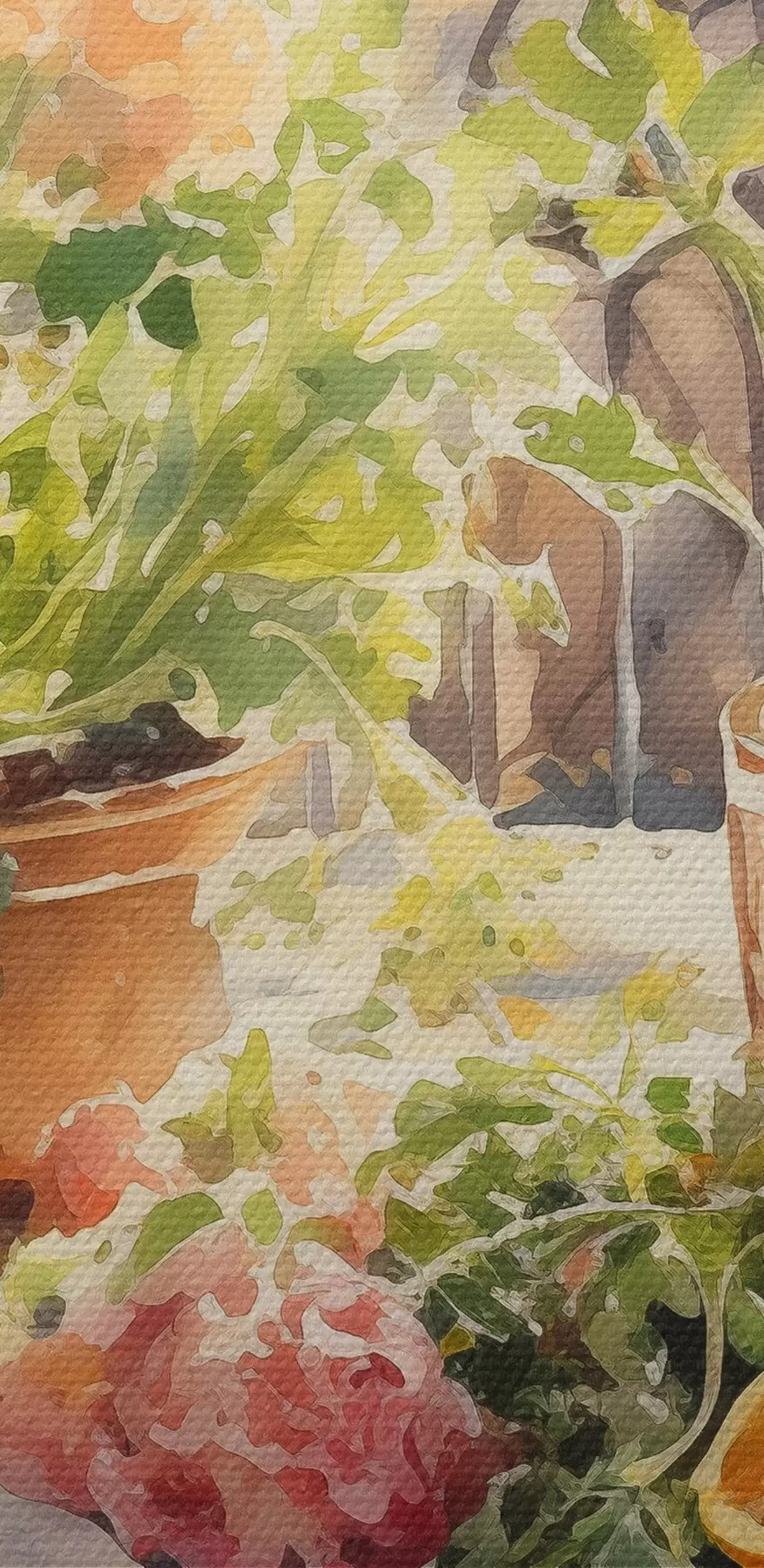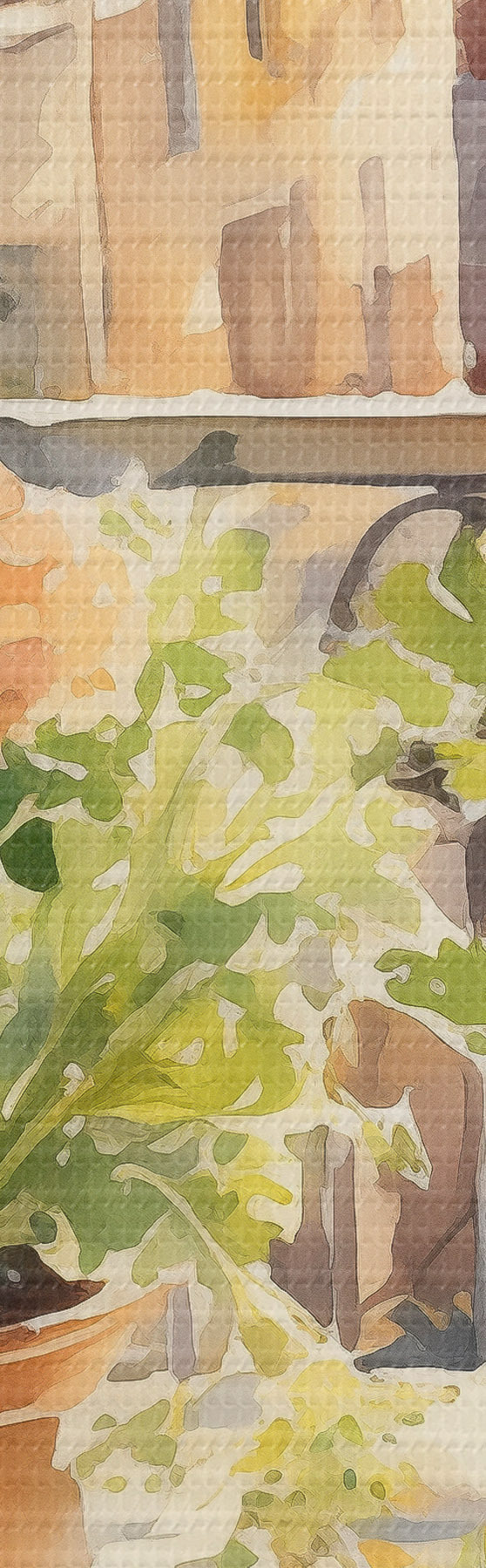 Attēls Akvareļu vakariņas, pilsētas skats, ziedi, daba, zaļie salāti Nr r41166