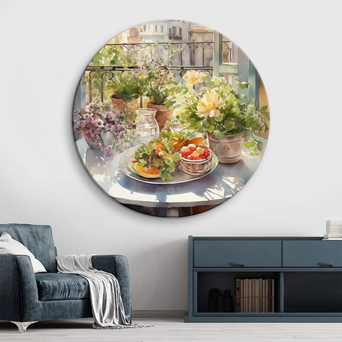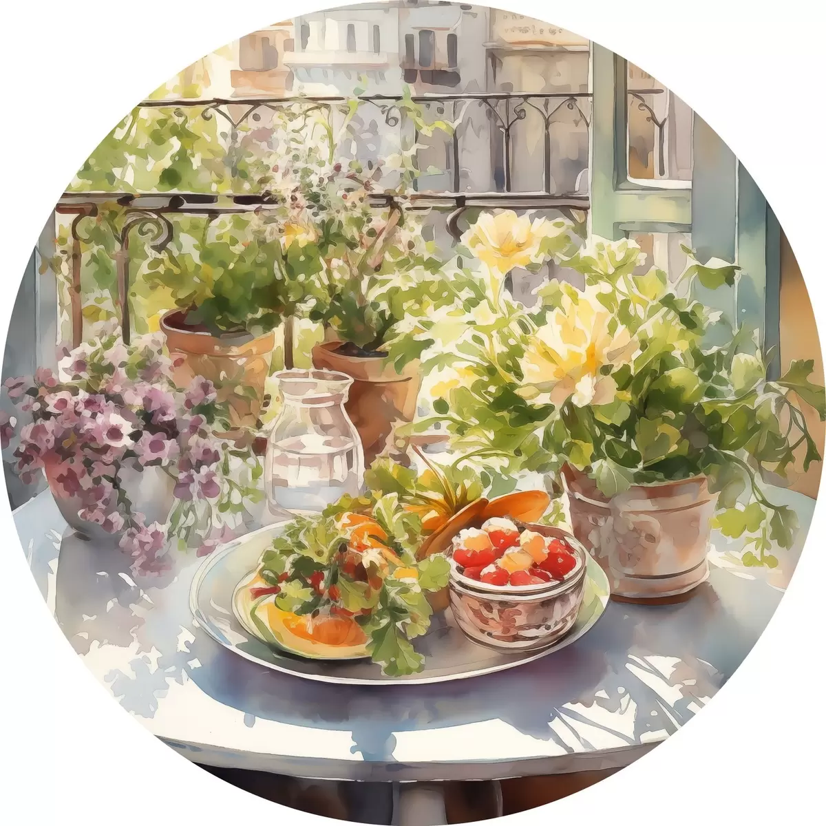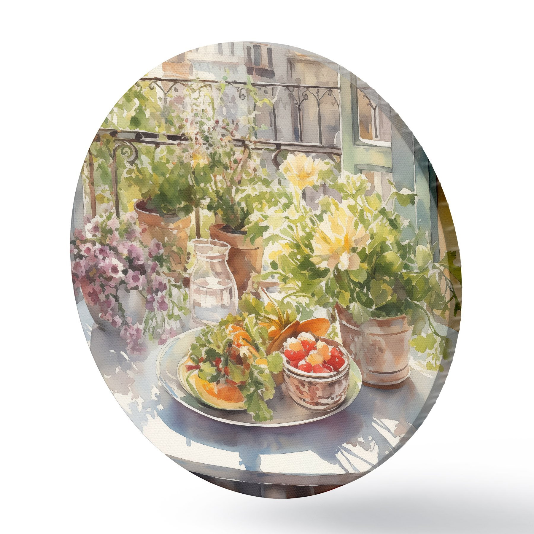 Apaļas gleznas Romantiskas vakariņas ar skatu uz pilsētu, akvarelis, ziedi r41168