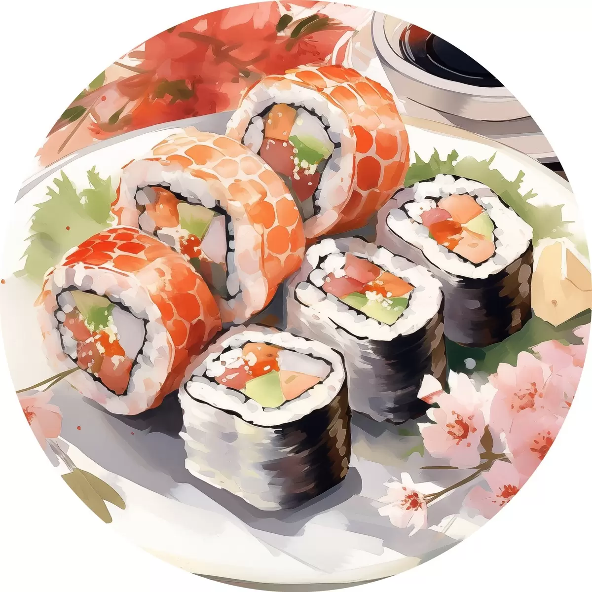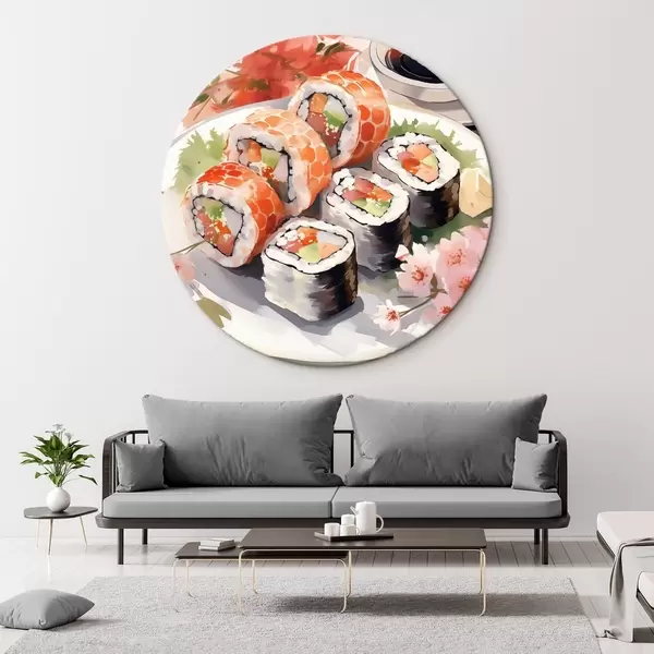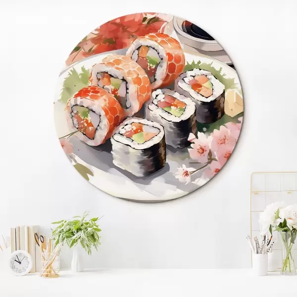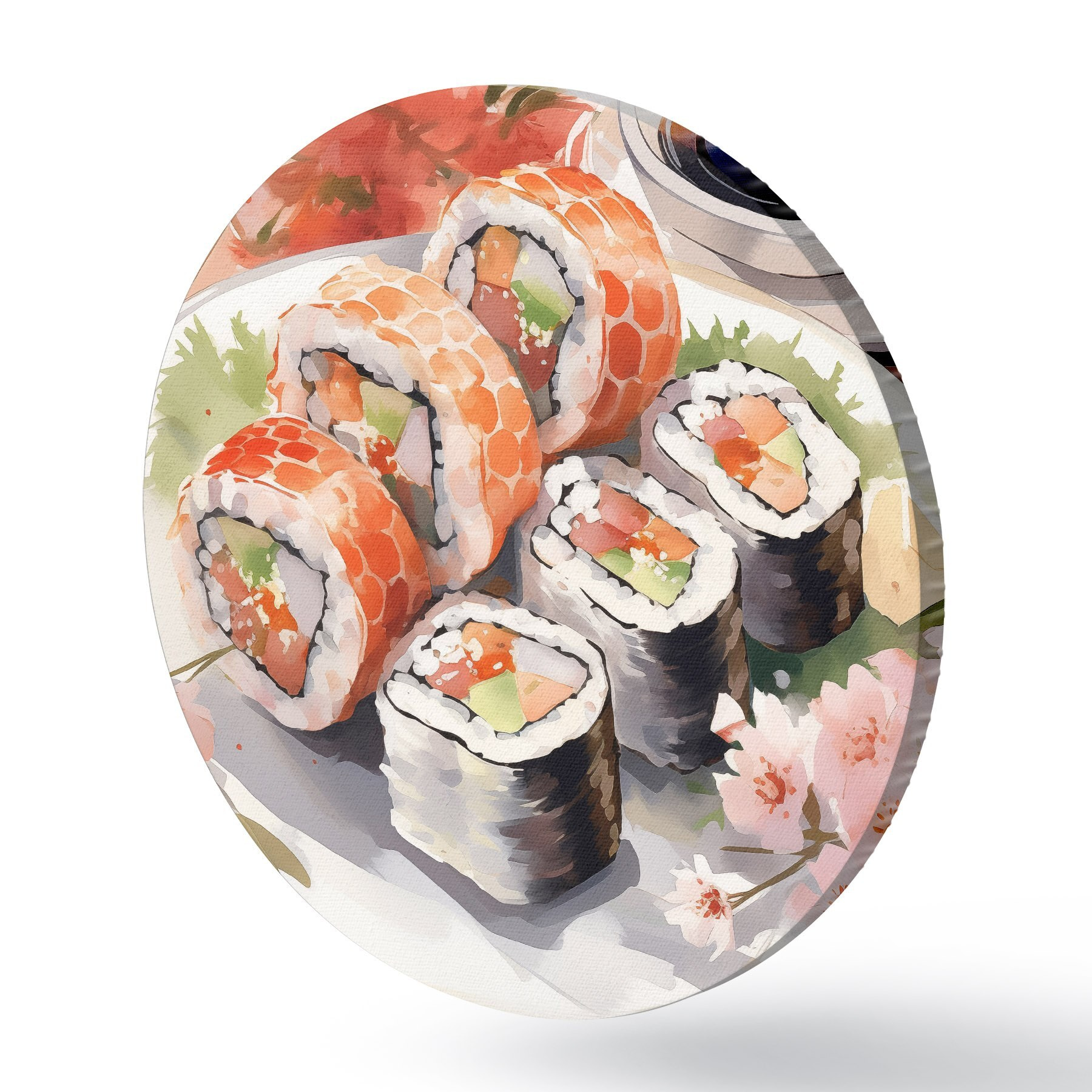 Apaļas gleznas Suši uz šķīvja, akvarelis, ziedu, japāņu r41179