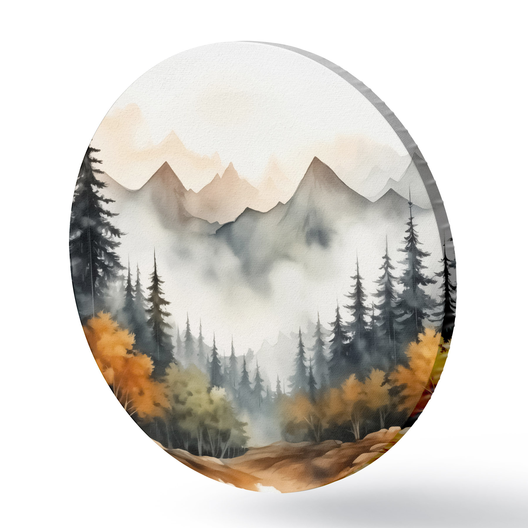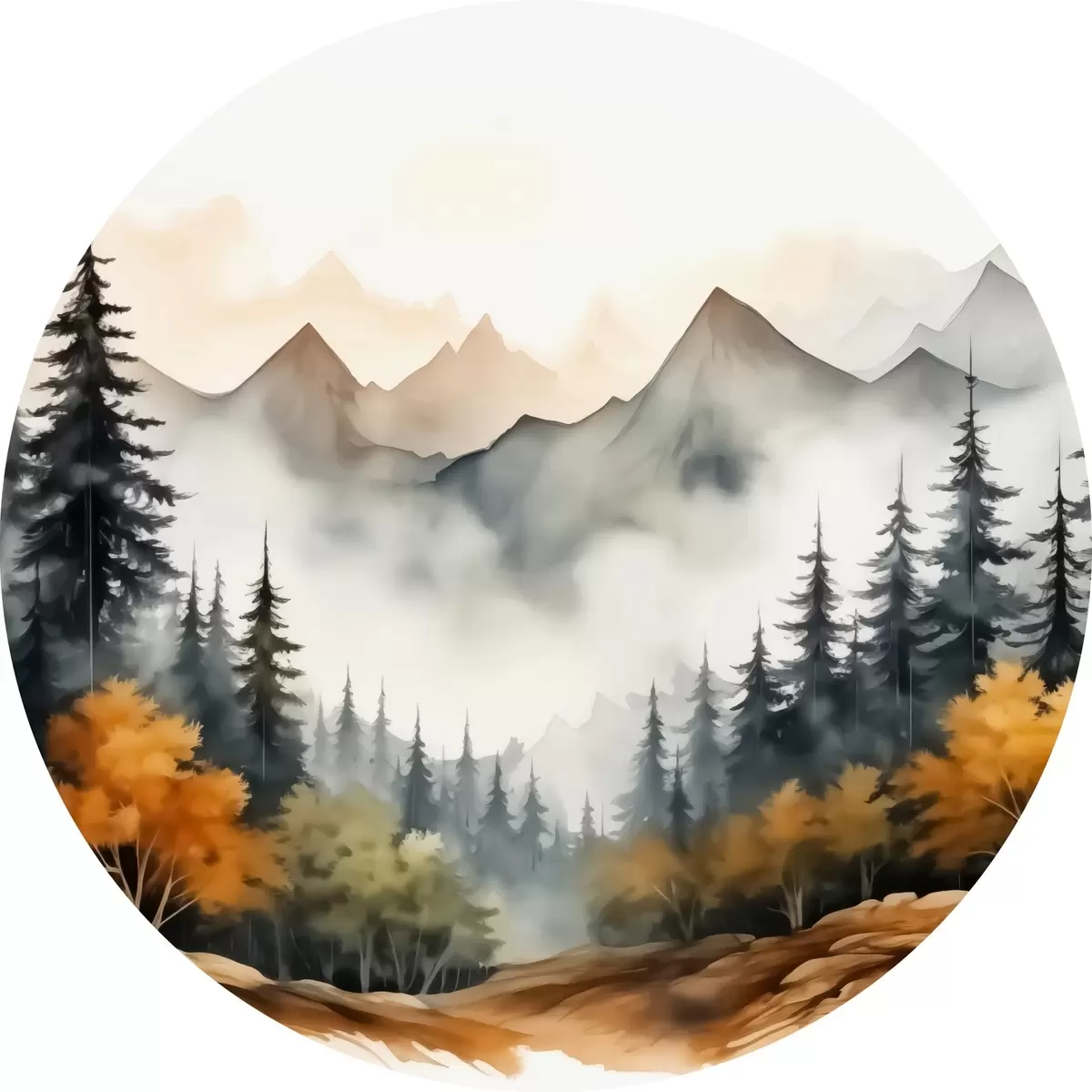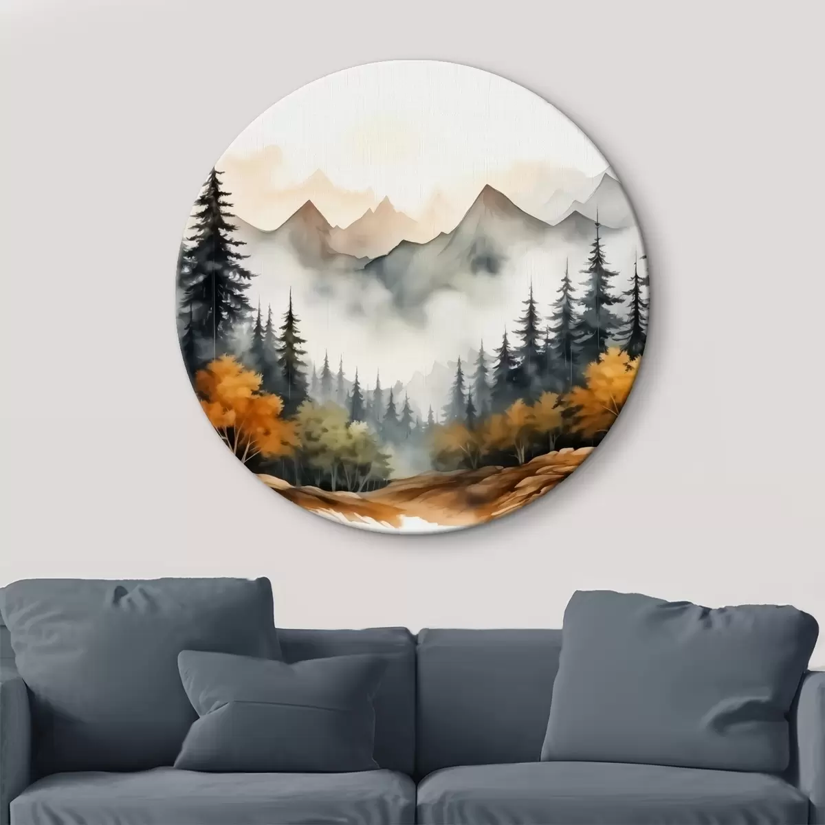 Apaļas gleznas Mežs uz akvareļu kalnu fona r41240