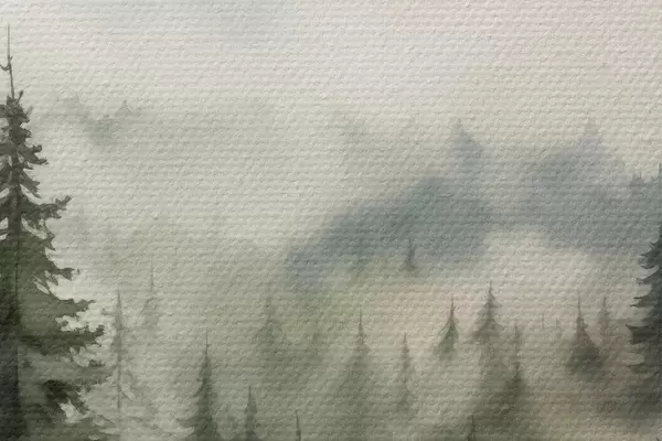 Attēls Zaļš mežs uz kalnu un miglas akvareļa fona Nr r41241