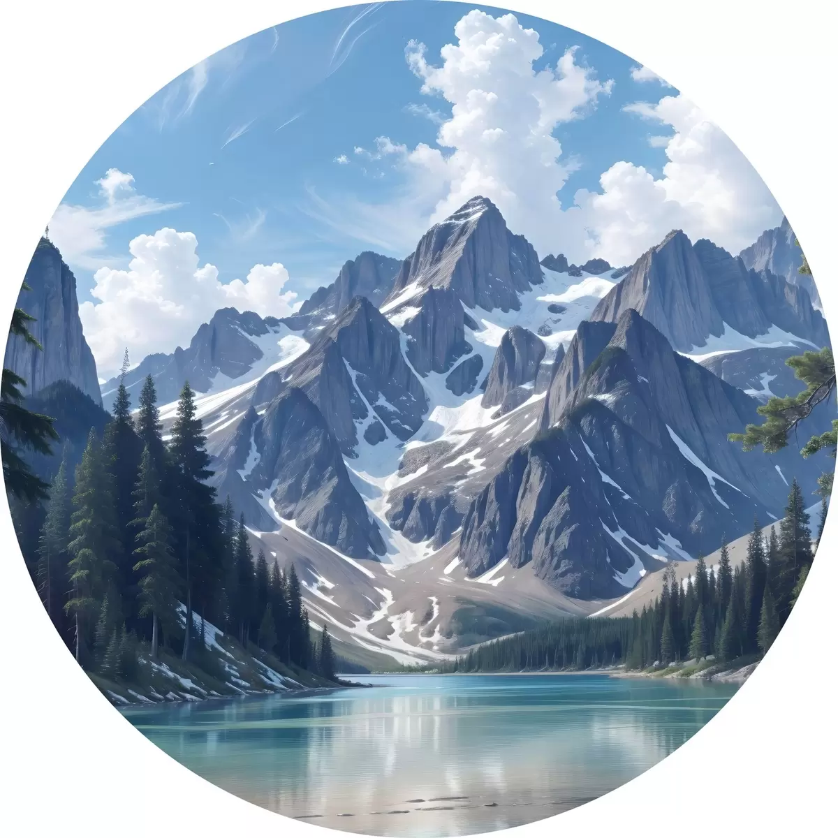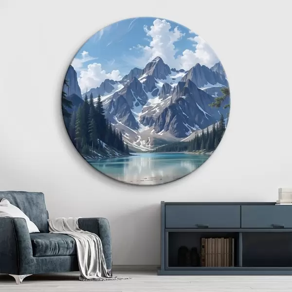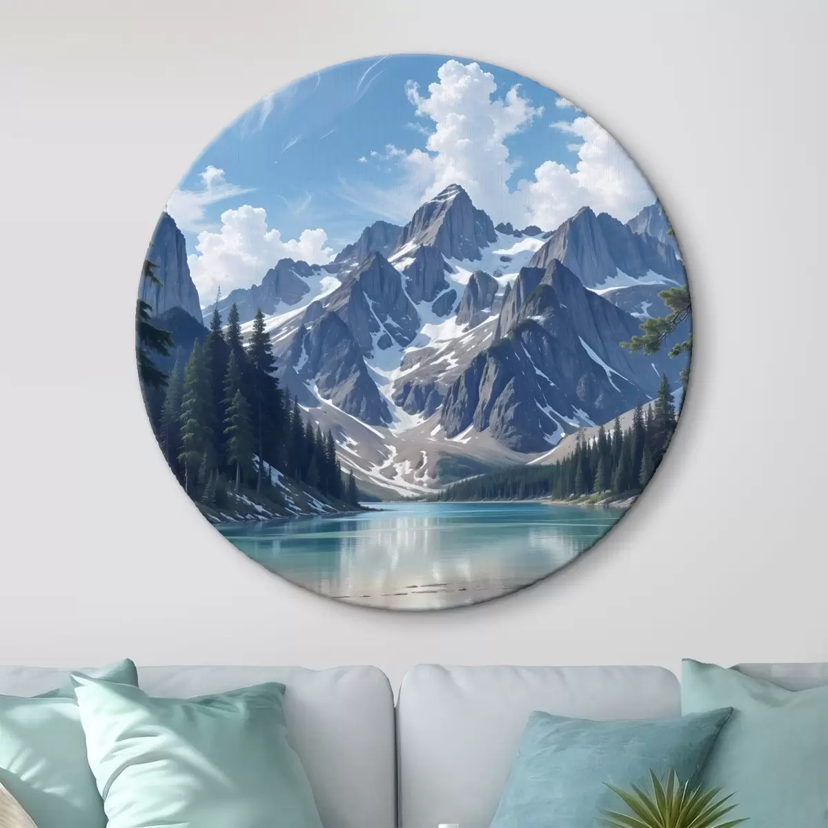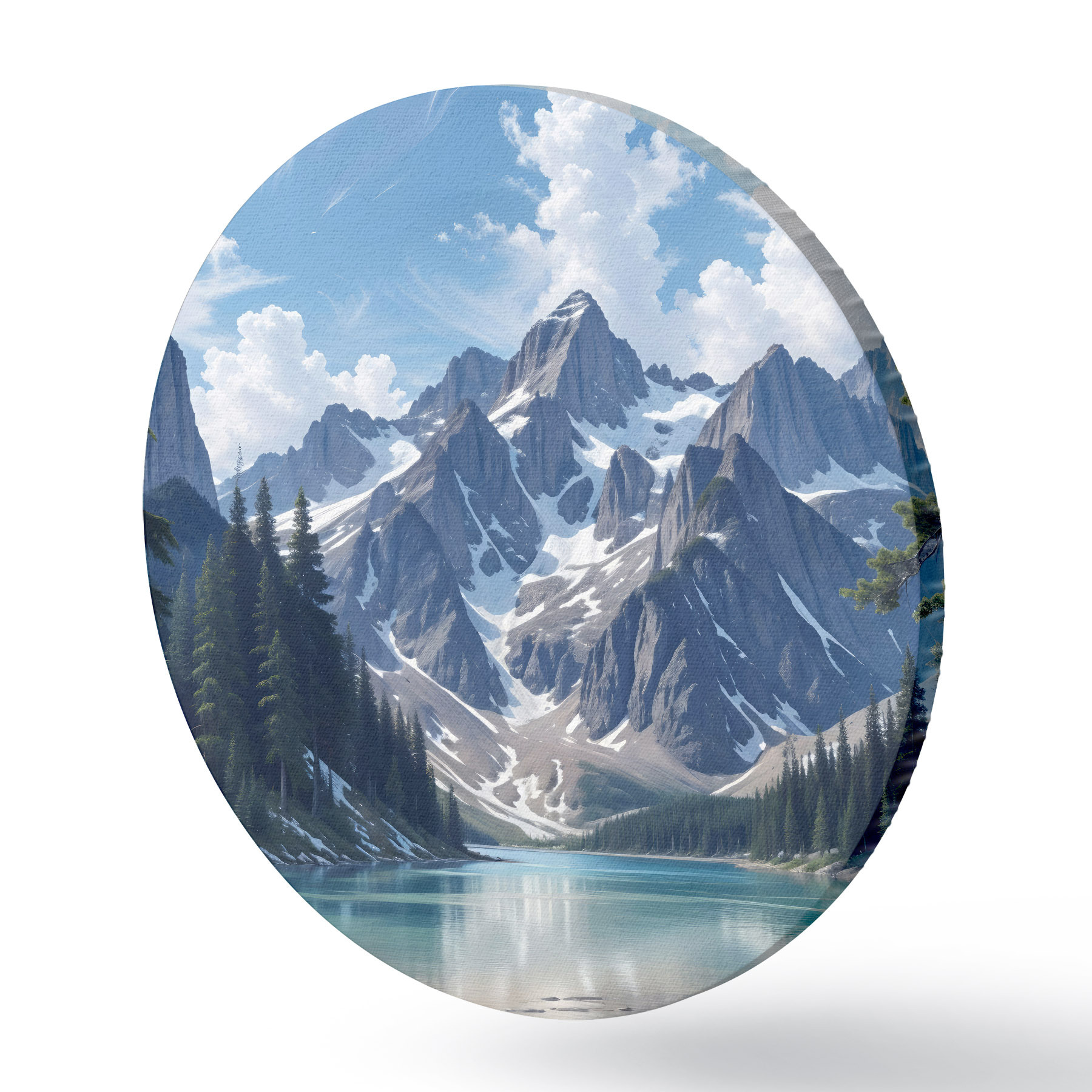 Apaļas gleznas Klusais Alpu ezers, ko ieskauj majestātiski sniegotie kalni, ar blīvu mežu un mākoņainām debesīm r41264