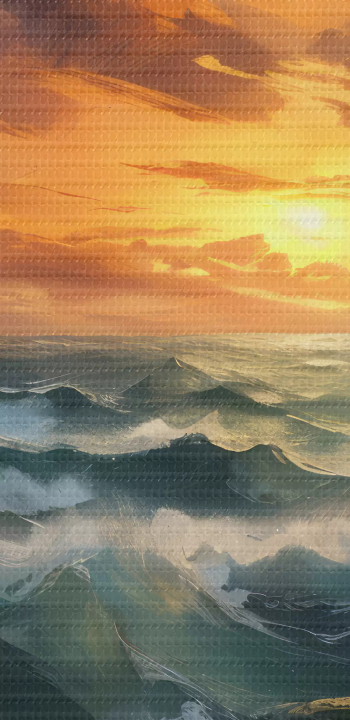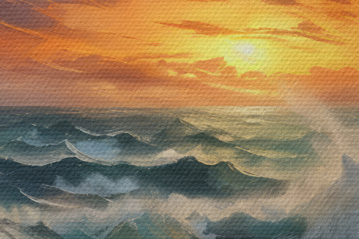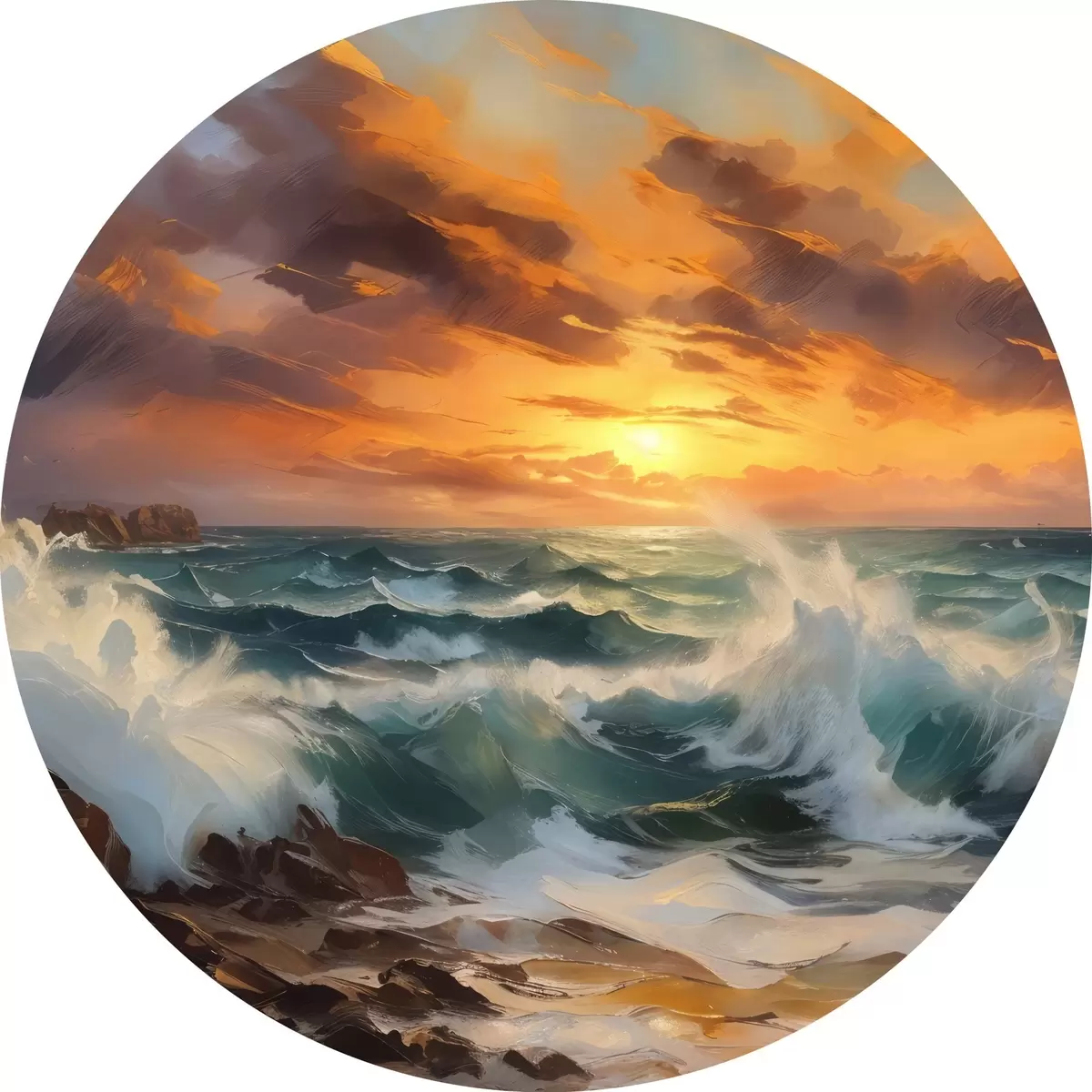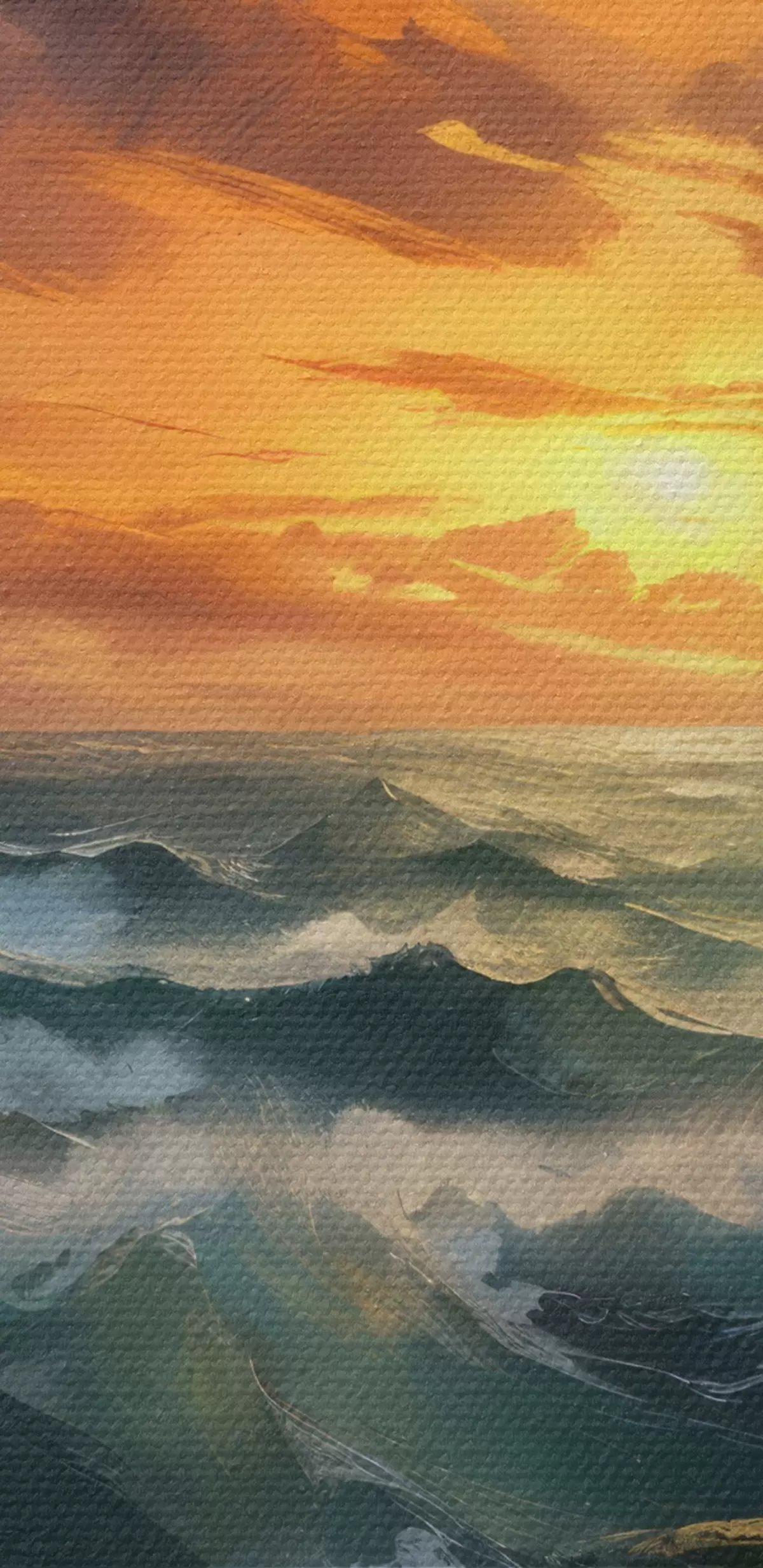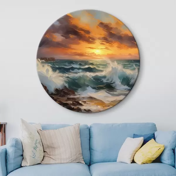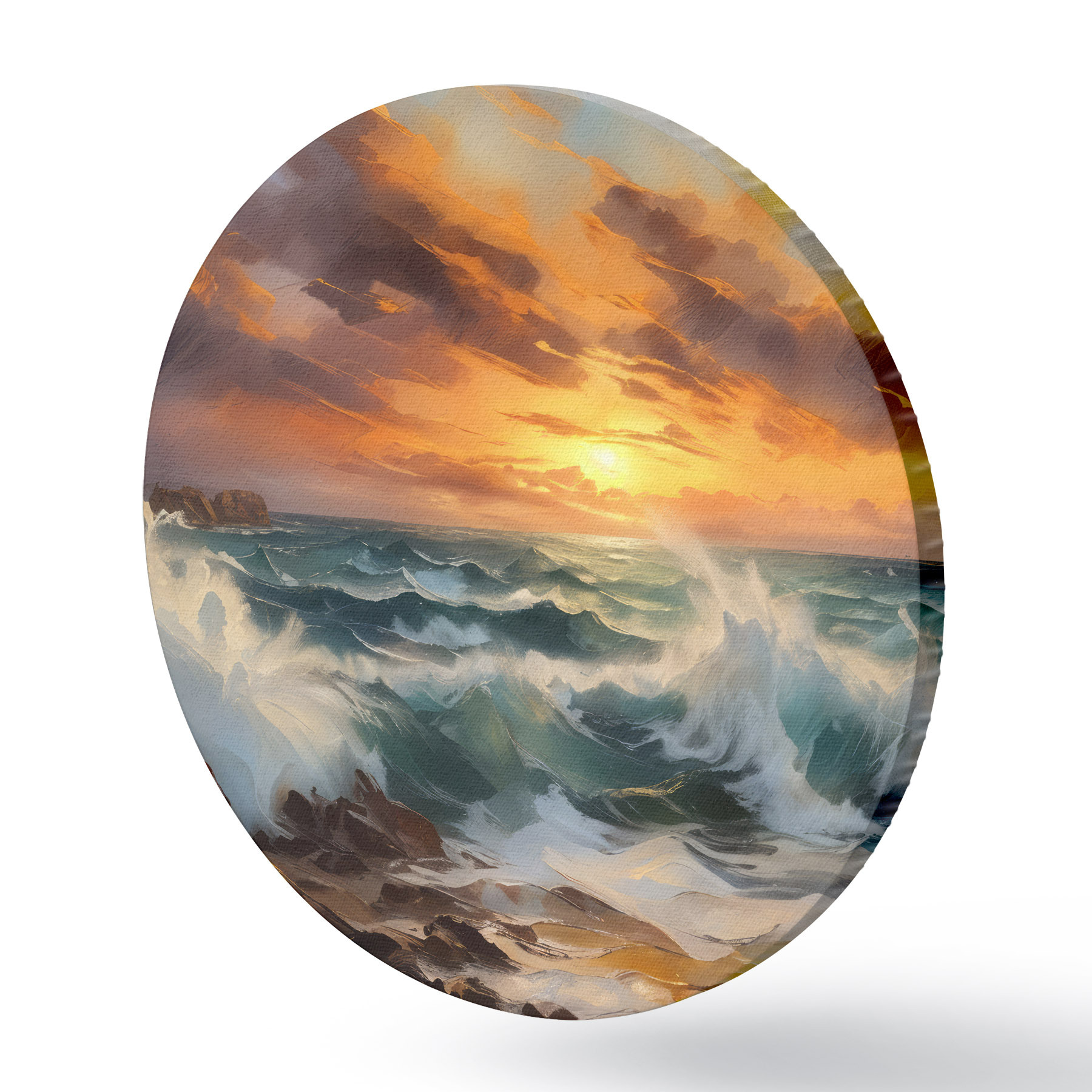 Attēls Dramatiska jūras ainava ar viļņu un klinšu klintīm uz oranžas un dzeltenas debess fona ar mākoņiem Nr r41266