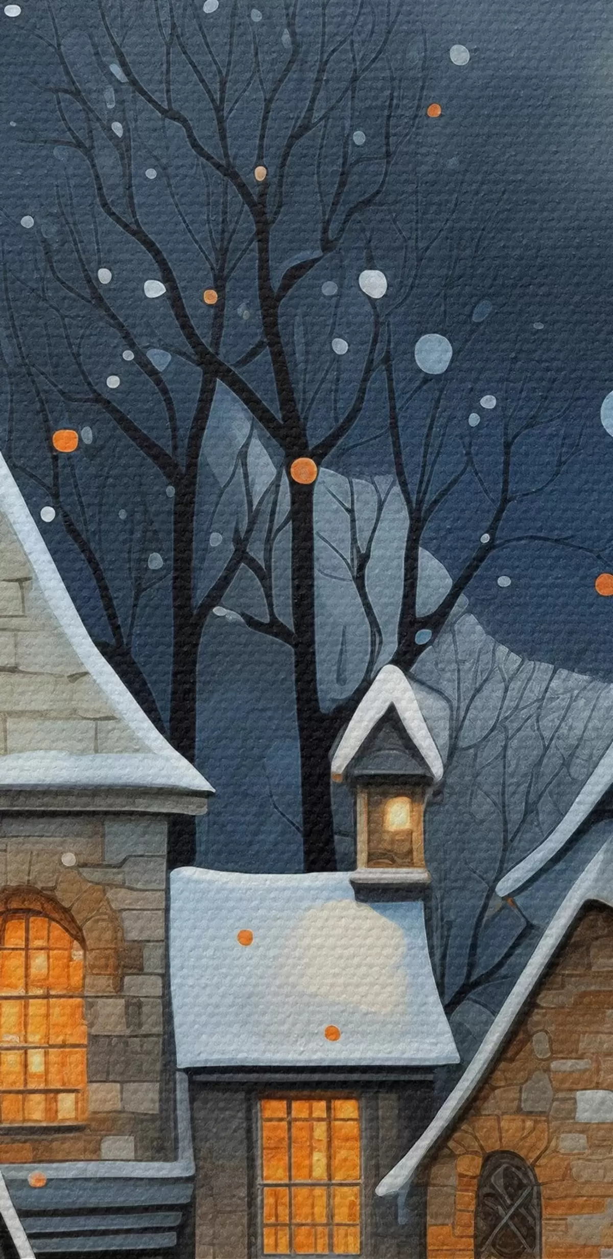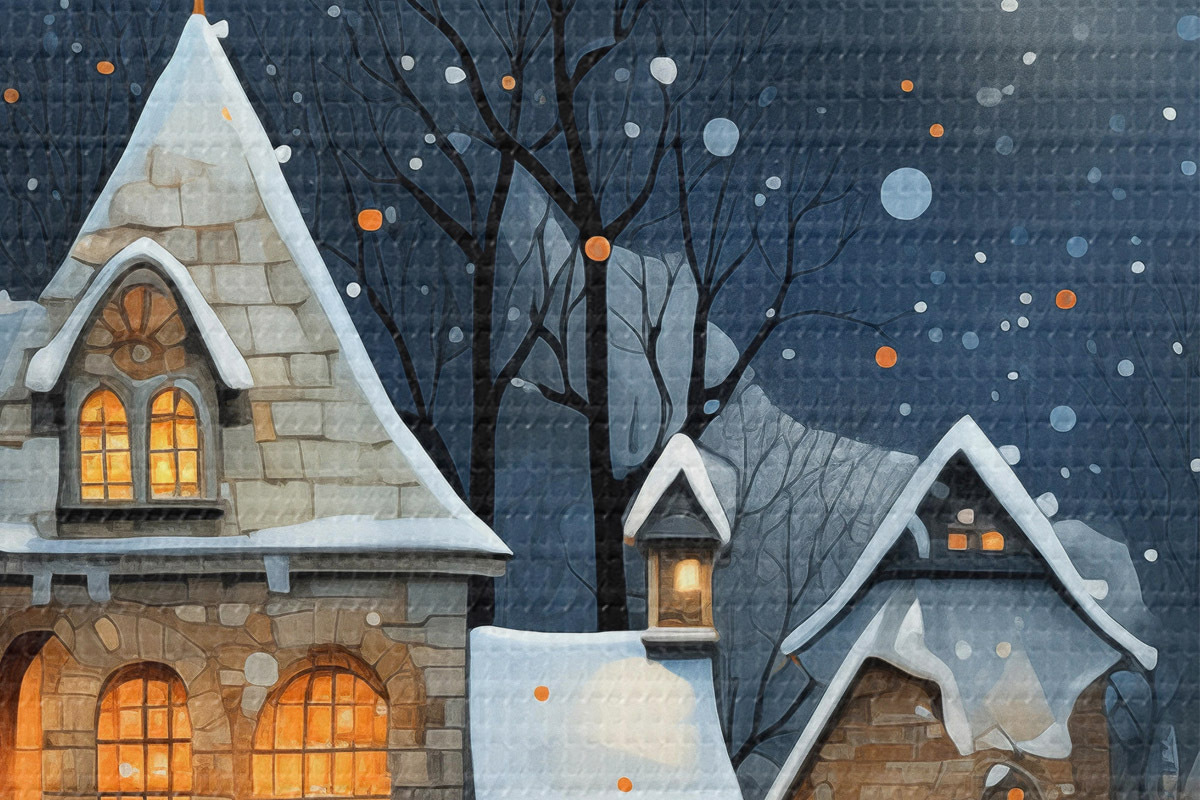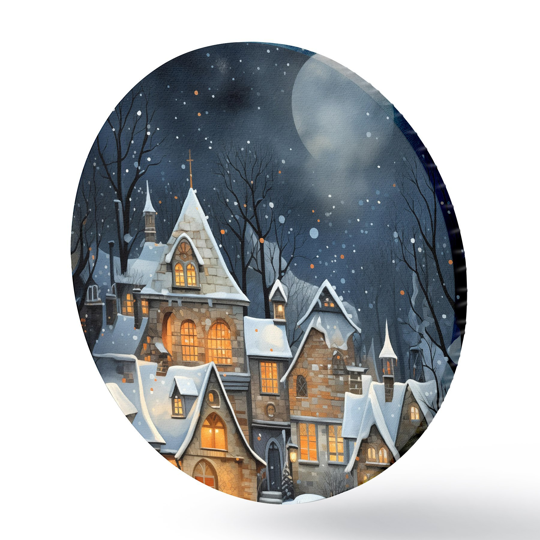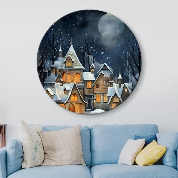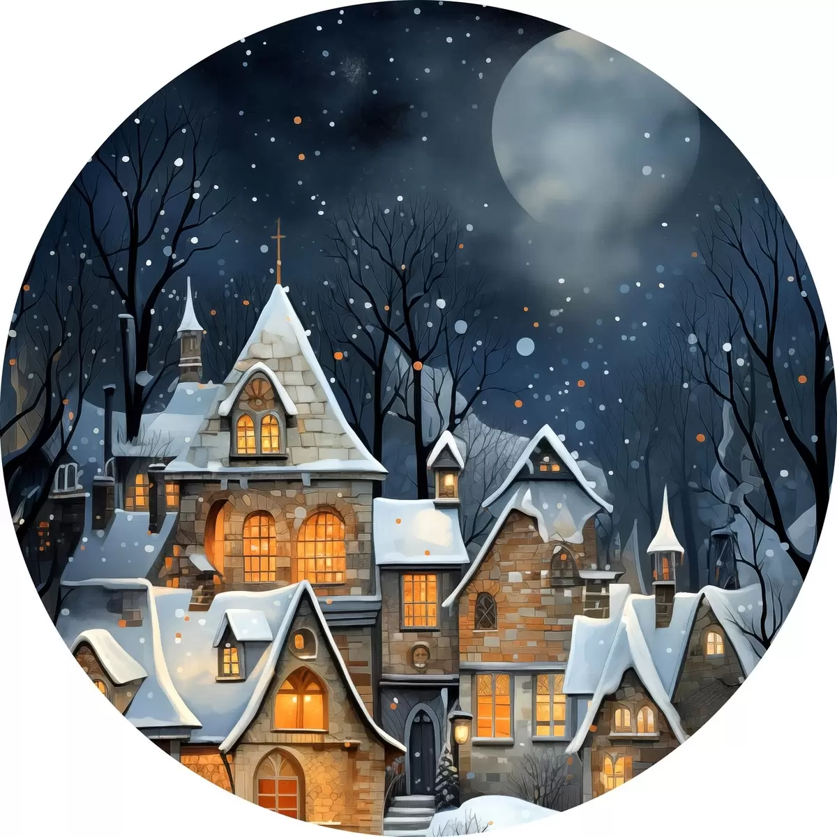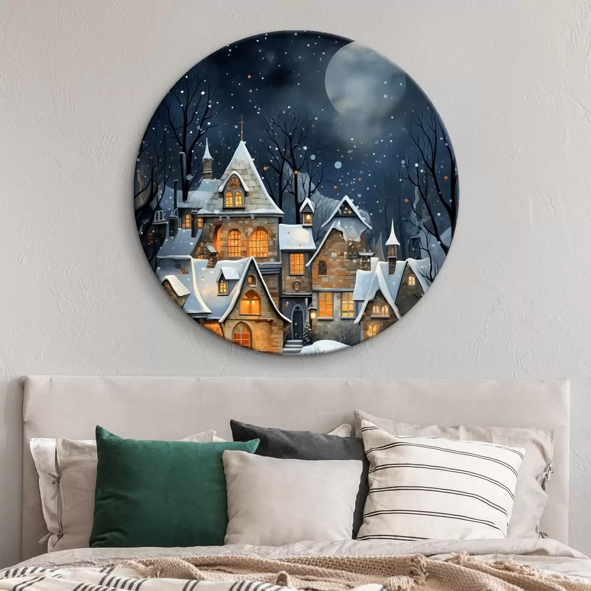Apaļas gleznas Mājas sniegā uz zvaigžņoto nakts debesu fona r41276