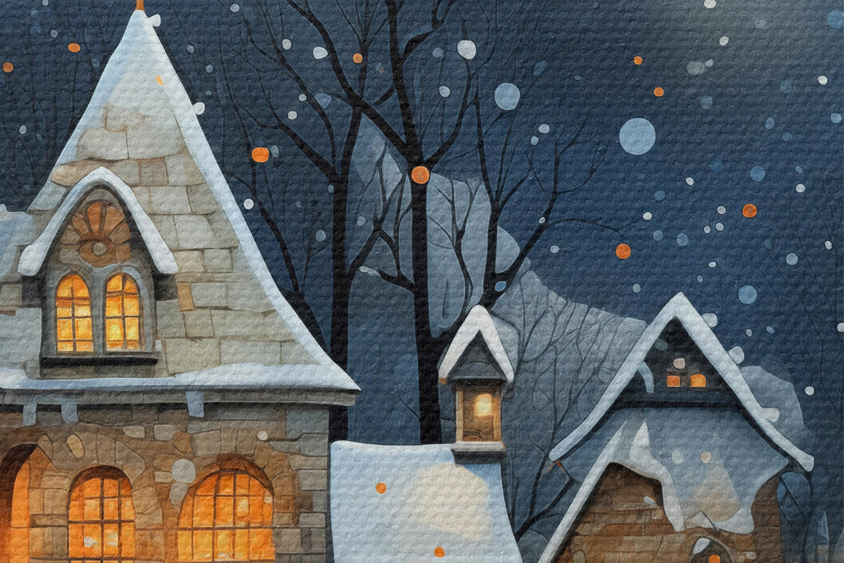 Attēls Mājas sniegā uz zvaigžņoto nakts debesu fona Nr r41276